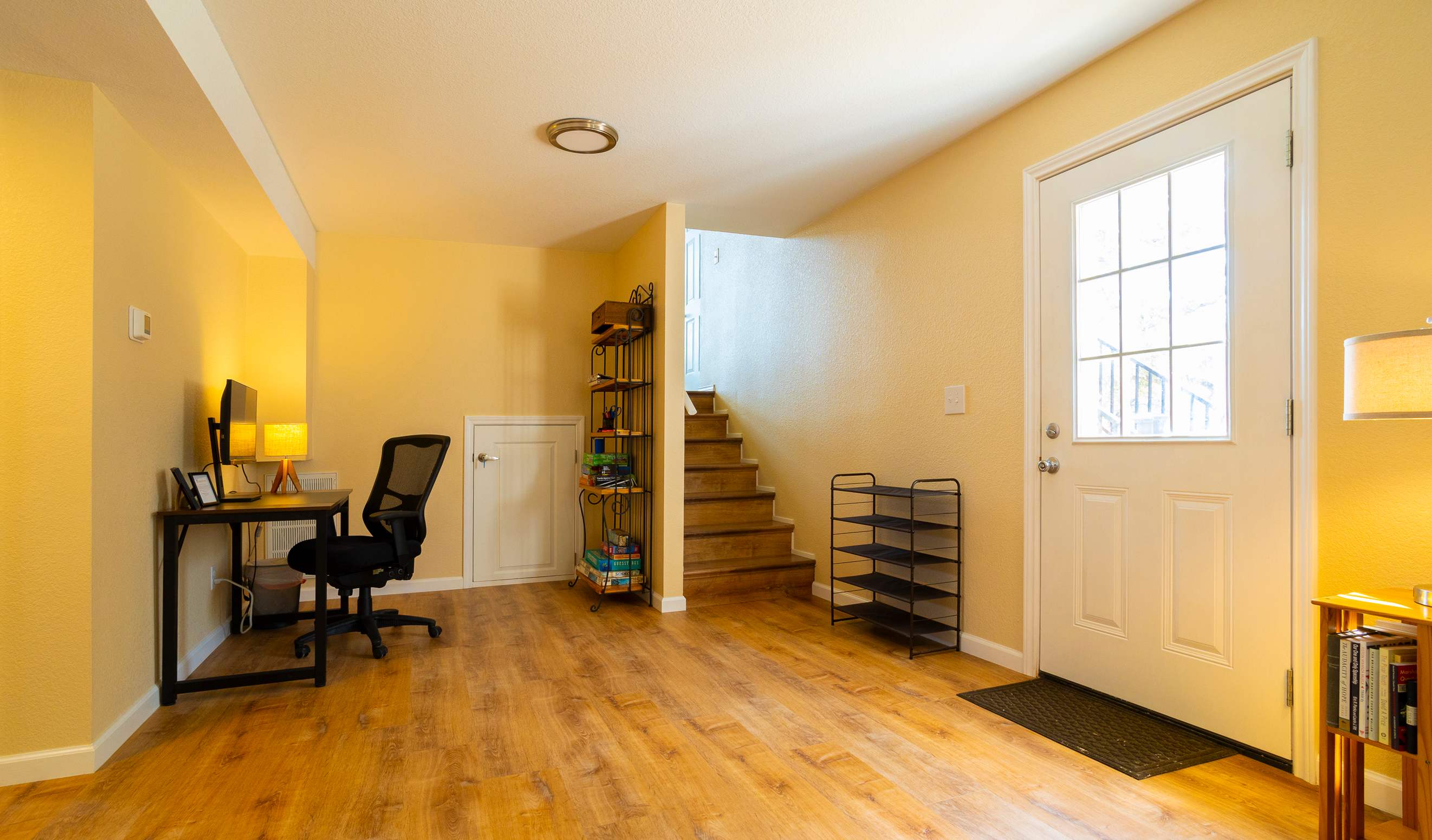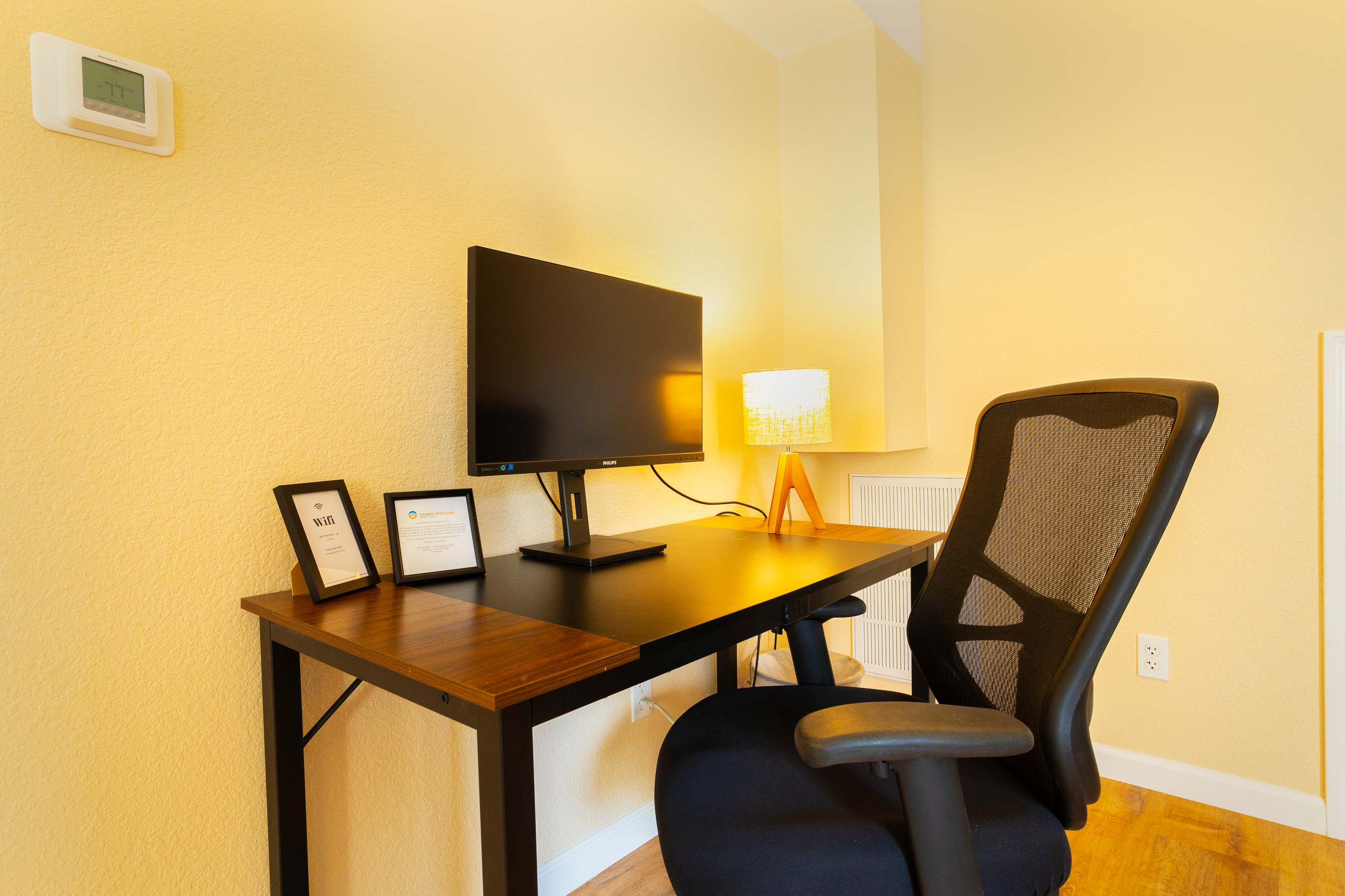 On the lower level, you’ll find an additional living space with sofa and smart TV, a secluded spot to catch up on episodes of all your favorite shows. A dedicated workspace provides a private setting for keeping up with emails or taking a phone call should the need arise.