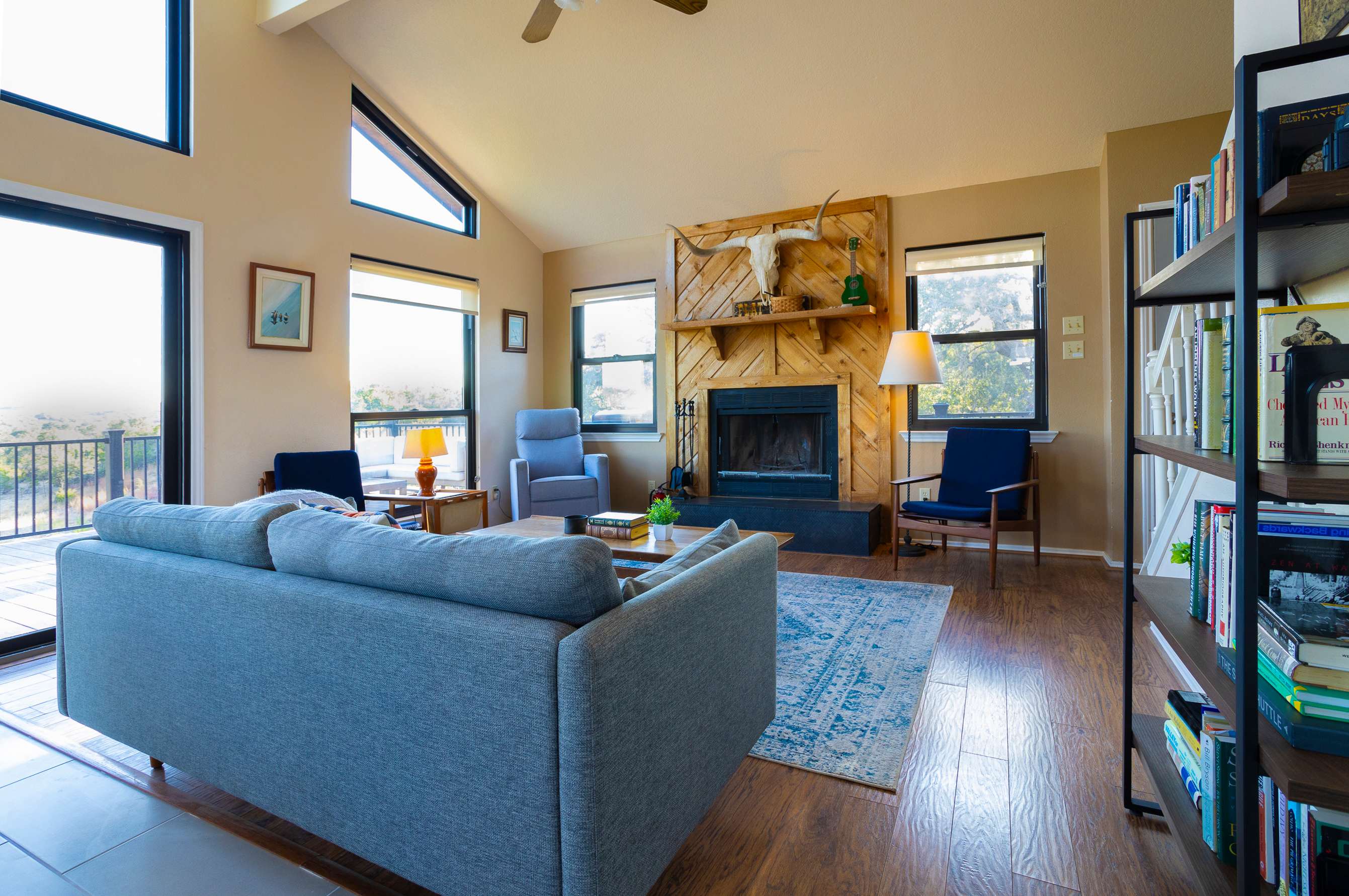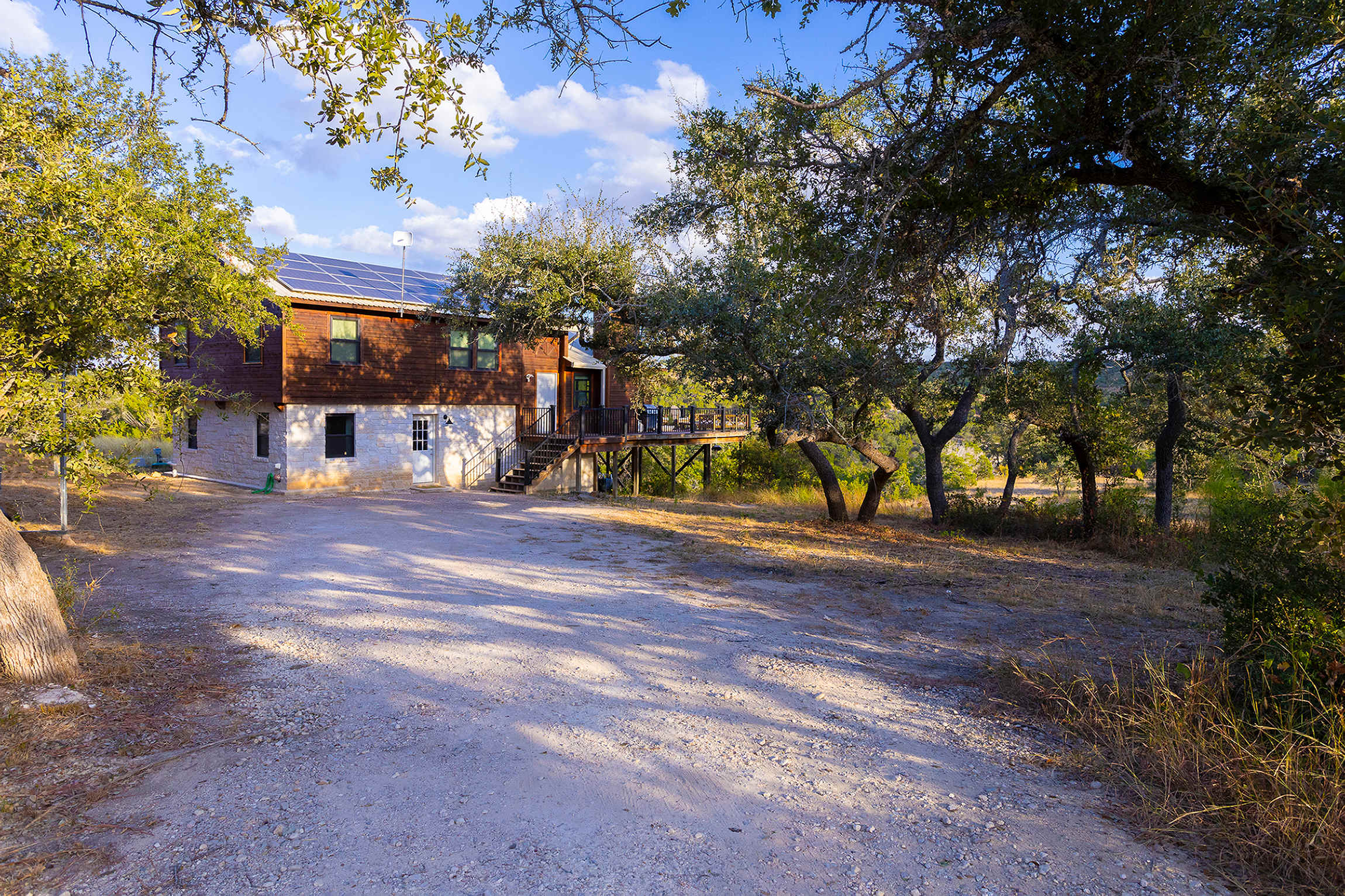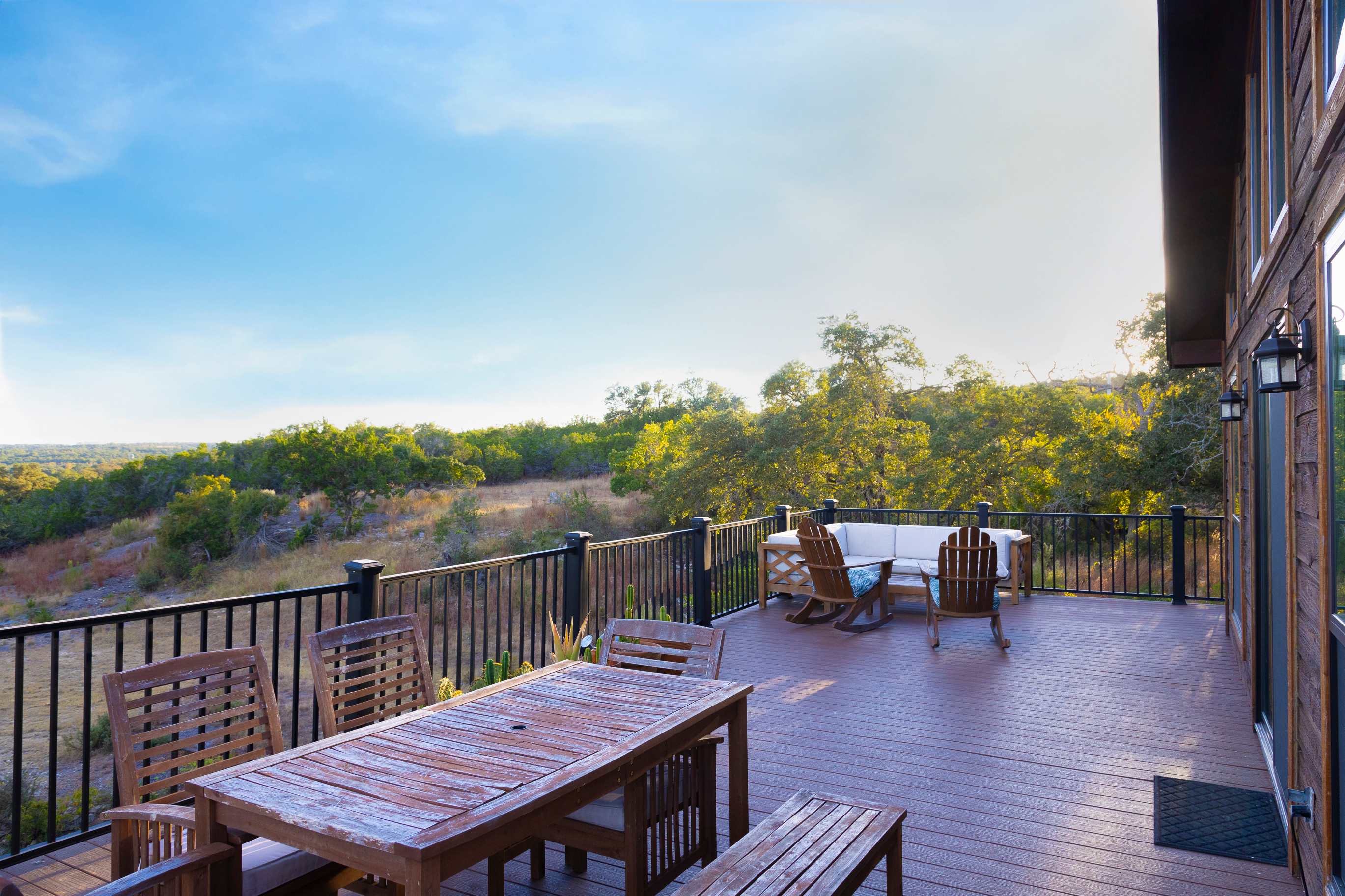 Days begin and end out on the home’s spacious, 1,000+ square foot deck, sipping your fresh cup of coffee as the sun rises or stargazing for constellations under the expansive night sky. Fully immersed in the beauty of nature, curl up on the outdoor sofa with a good book while you observe its sights and sounds or take a meal al fresco at the dining table, the fresh country air swirling around you. Spring-fed Flat Creek meanders through the property, a serene spot for an exploratory stroll, while scenic hiking trails invite you to strap on your boots and set off on an adventure amid the vast rugged terrain. Away from the property, you’ll be just minutes from Pedernales Falls State Park along with popular wedding venues should you find yourself in town to celebrate. You’ll also be virtually surrounded by renowned wineries, breweries, and distilleries, all offering samples of the region’s finest.