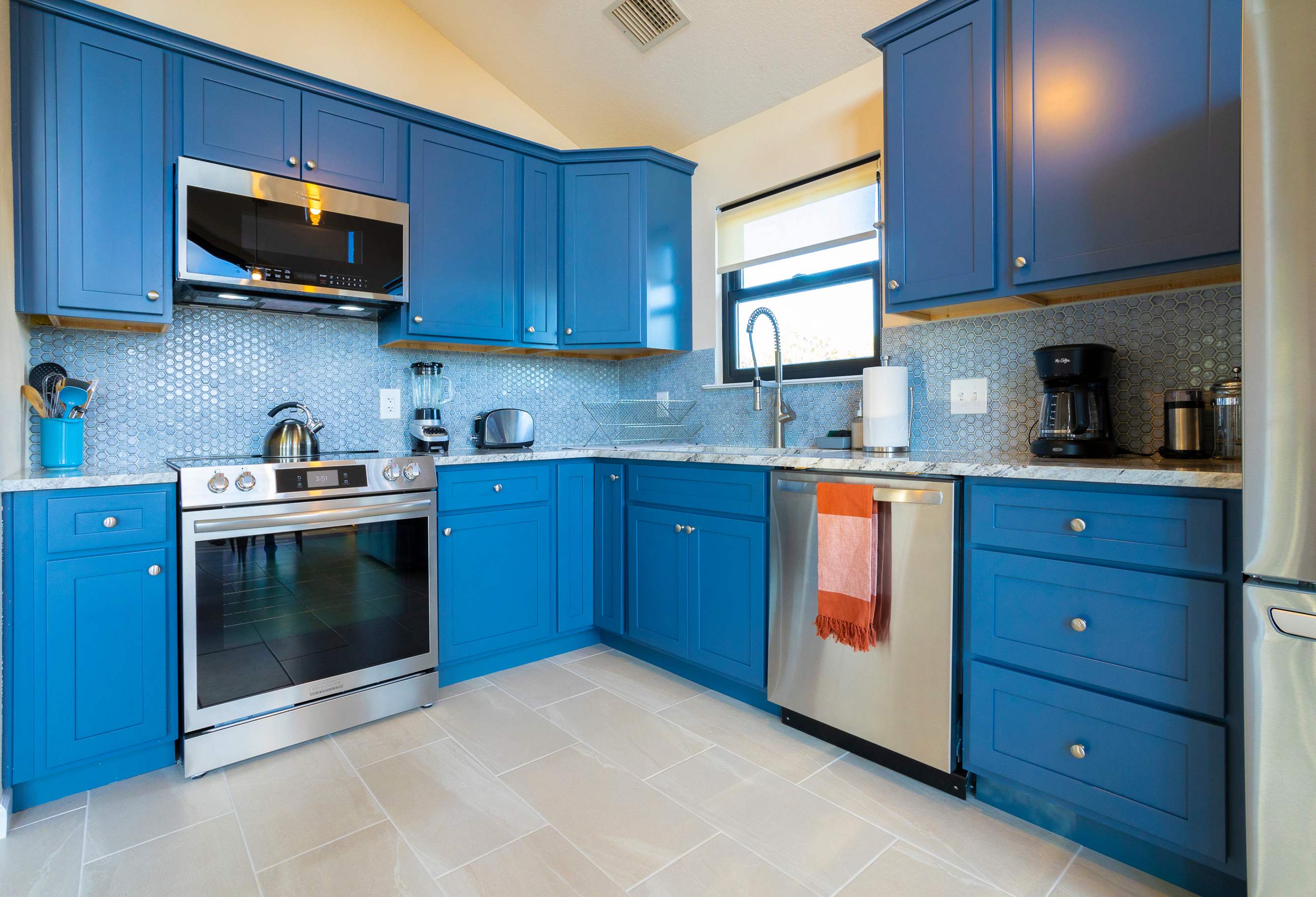 Back upstairs, the stylish kitchen is a chef’s delight, showcasing stainless steel appliances, glossy stone counters, and cornflower blue cabinetry stocked with cookware and dining ware. The chic table seats 6 for all forms of dining, afterward clearing the dishes to make way for a competitive family game night.