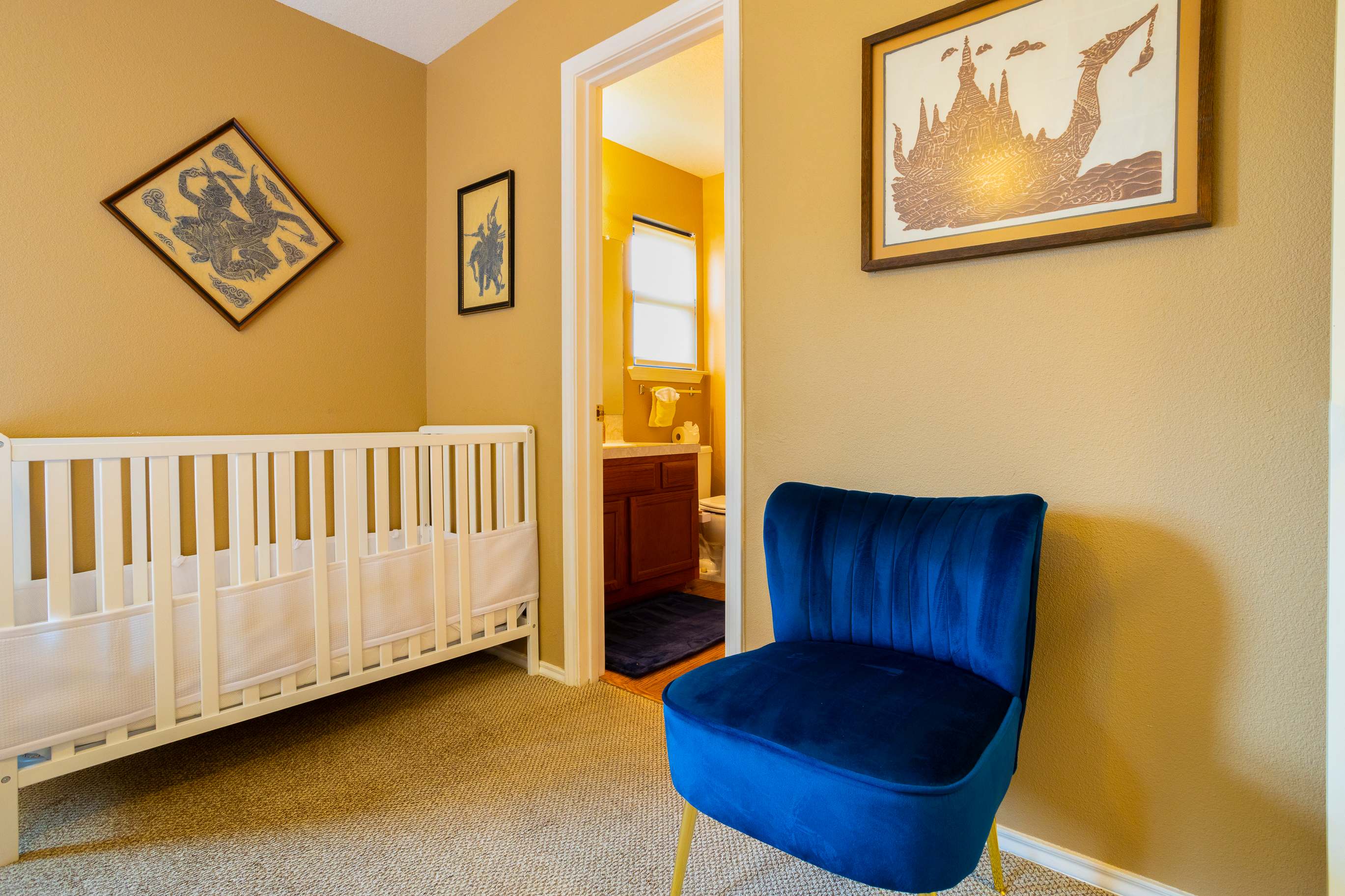 Bedroom #1 includes a queen size bed, crib, and ensuite bathroom with a single vanity and shower/tub combo.