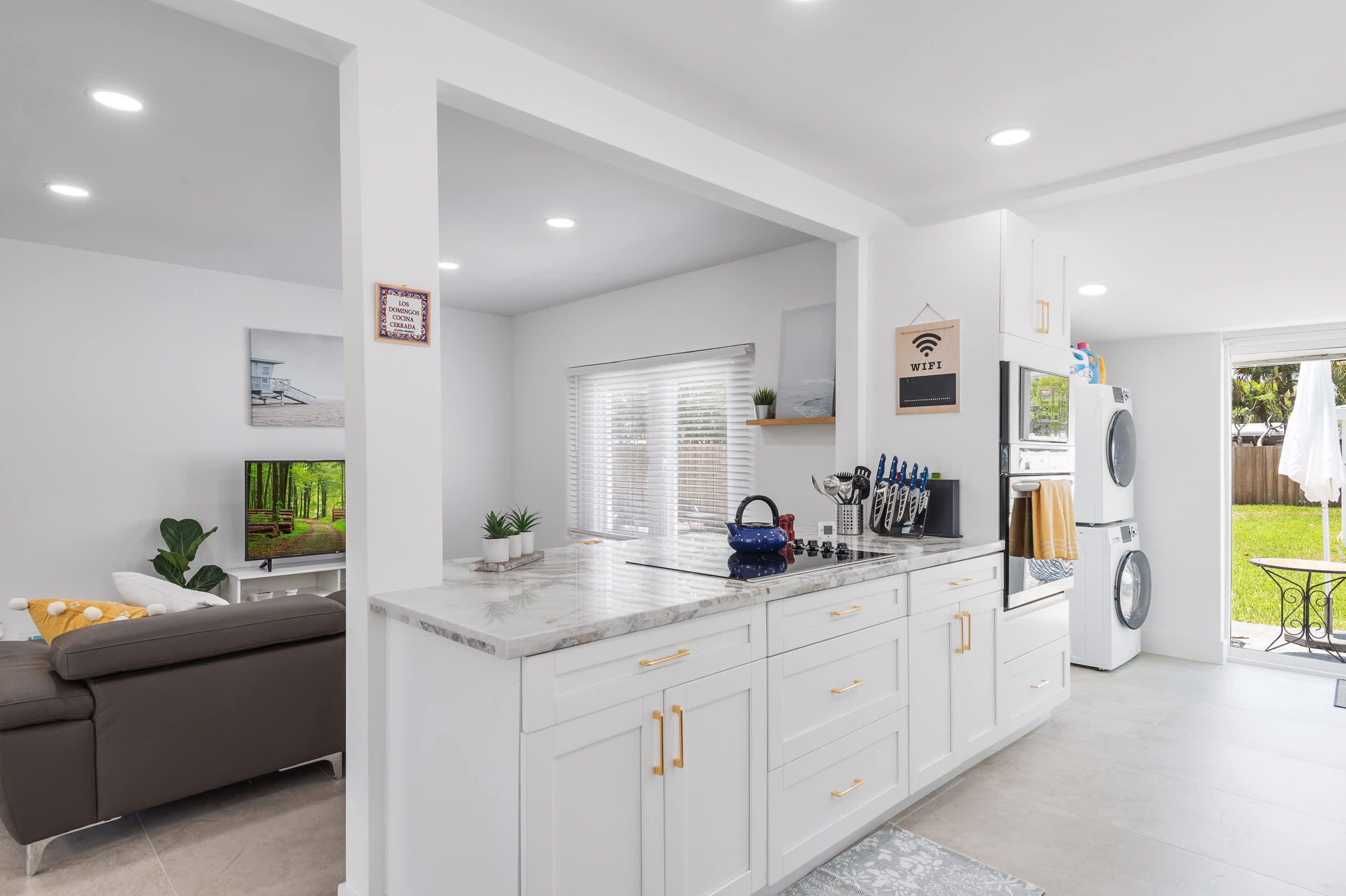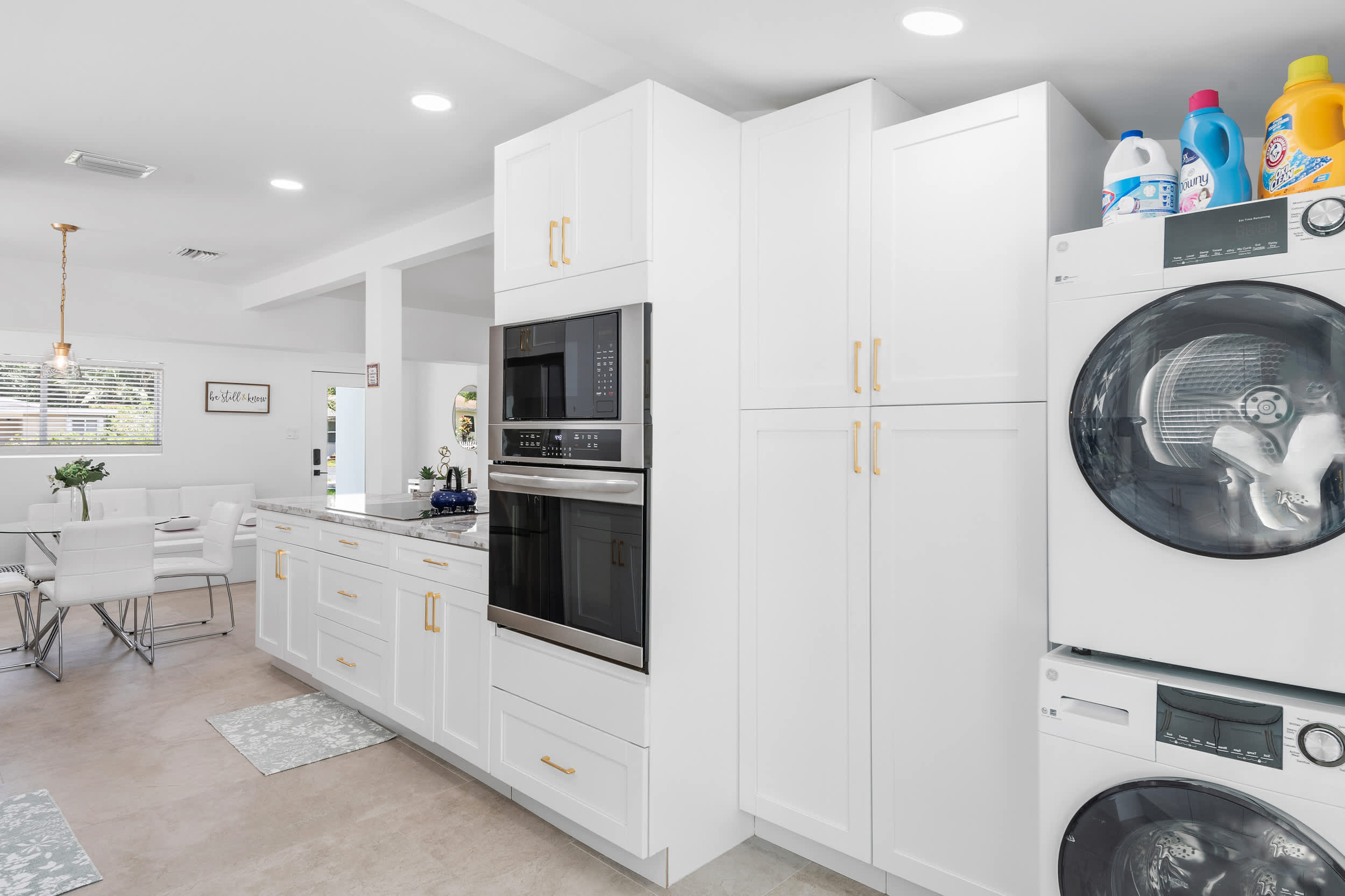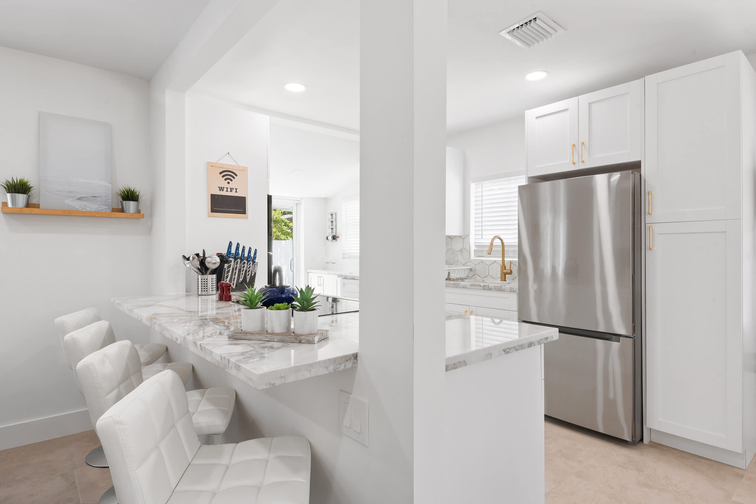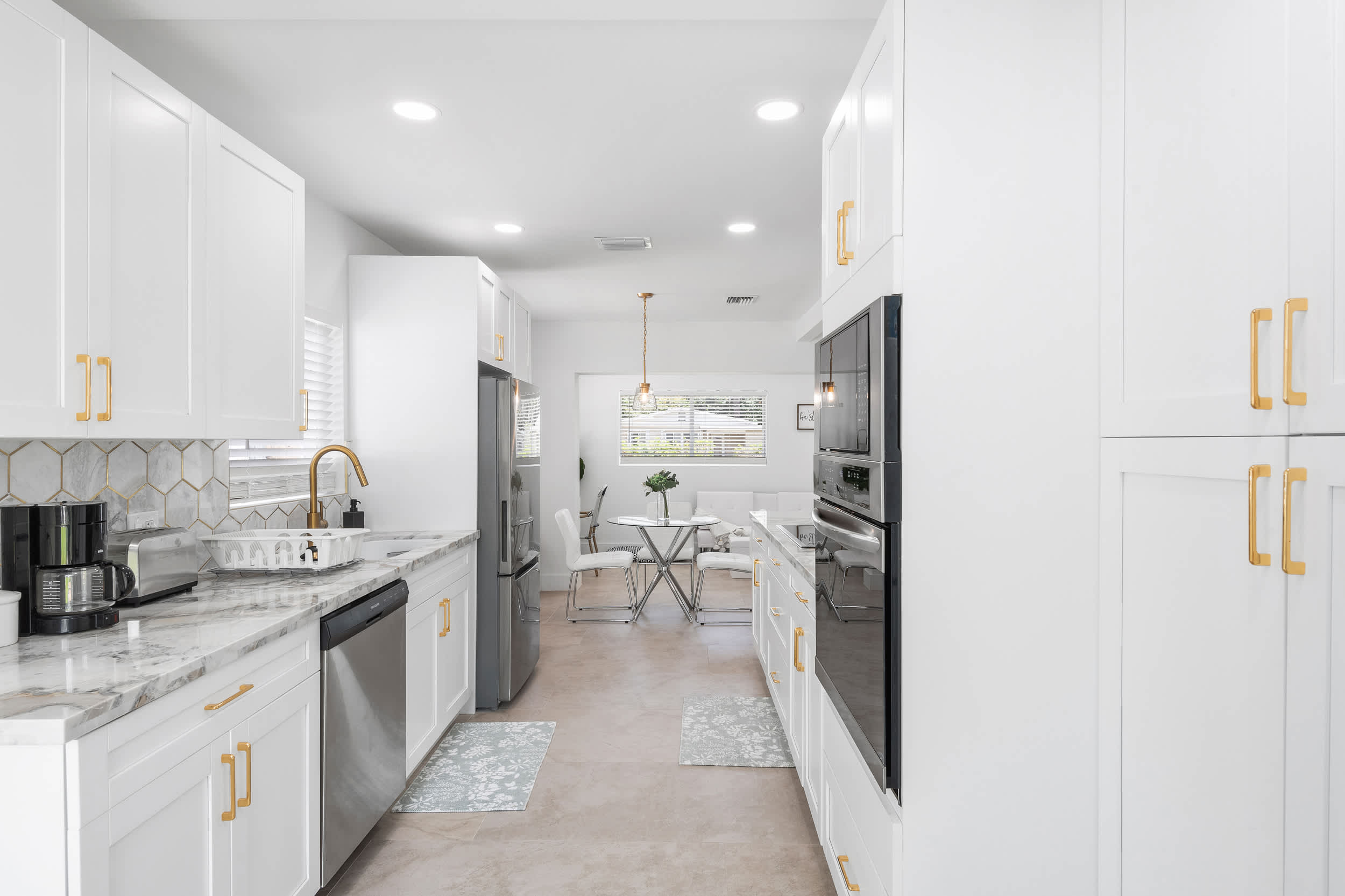 The open floorplan creates organic flow into the stylish kitchen, fully equipped for all your mealtime needs with stainless steel appliances, glossy stone counters, and sleek white cabinetry with gold finishes. Whether you’re whipping up homecooked creations or simply unpacking takeout from a newly discovered local restaurant, you’ll find everything required to make the most out of your dining experience.