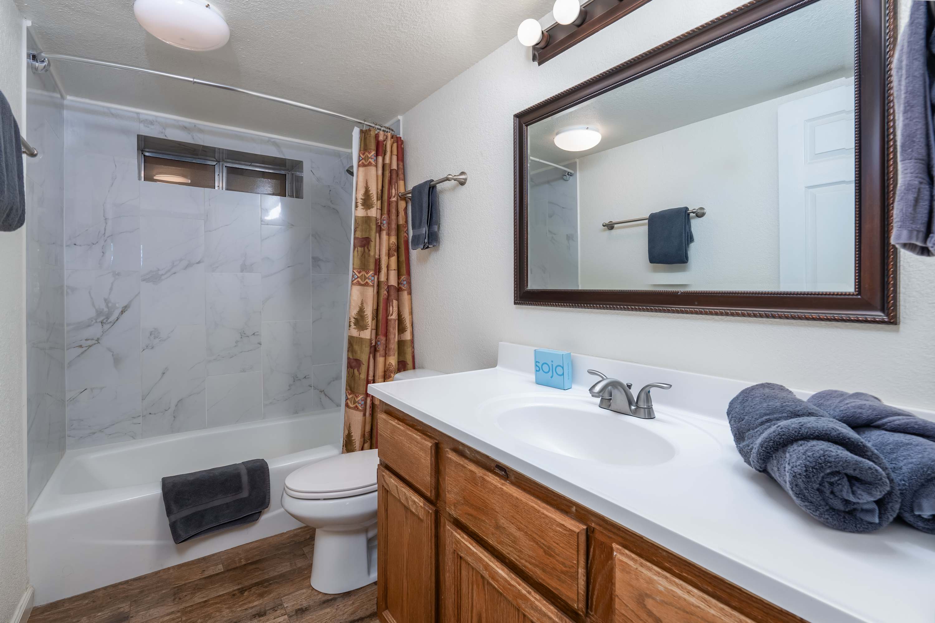 The home also includes an additional full guest bathroom with a single vanity and shower/tub combo.