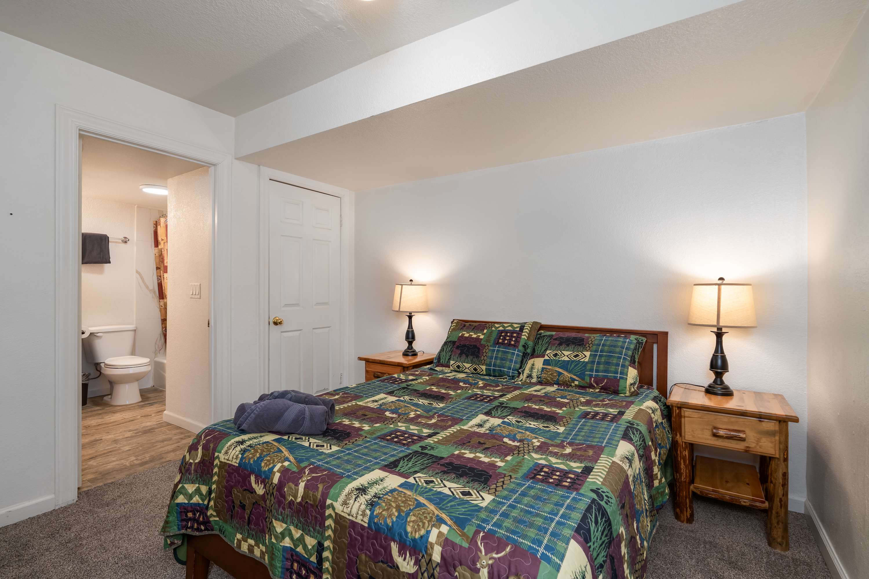 Bedroom #1 includes a queen size bed and ensuite bathroom with a single vanity and shower/tub combo.