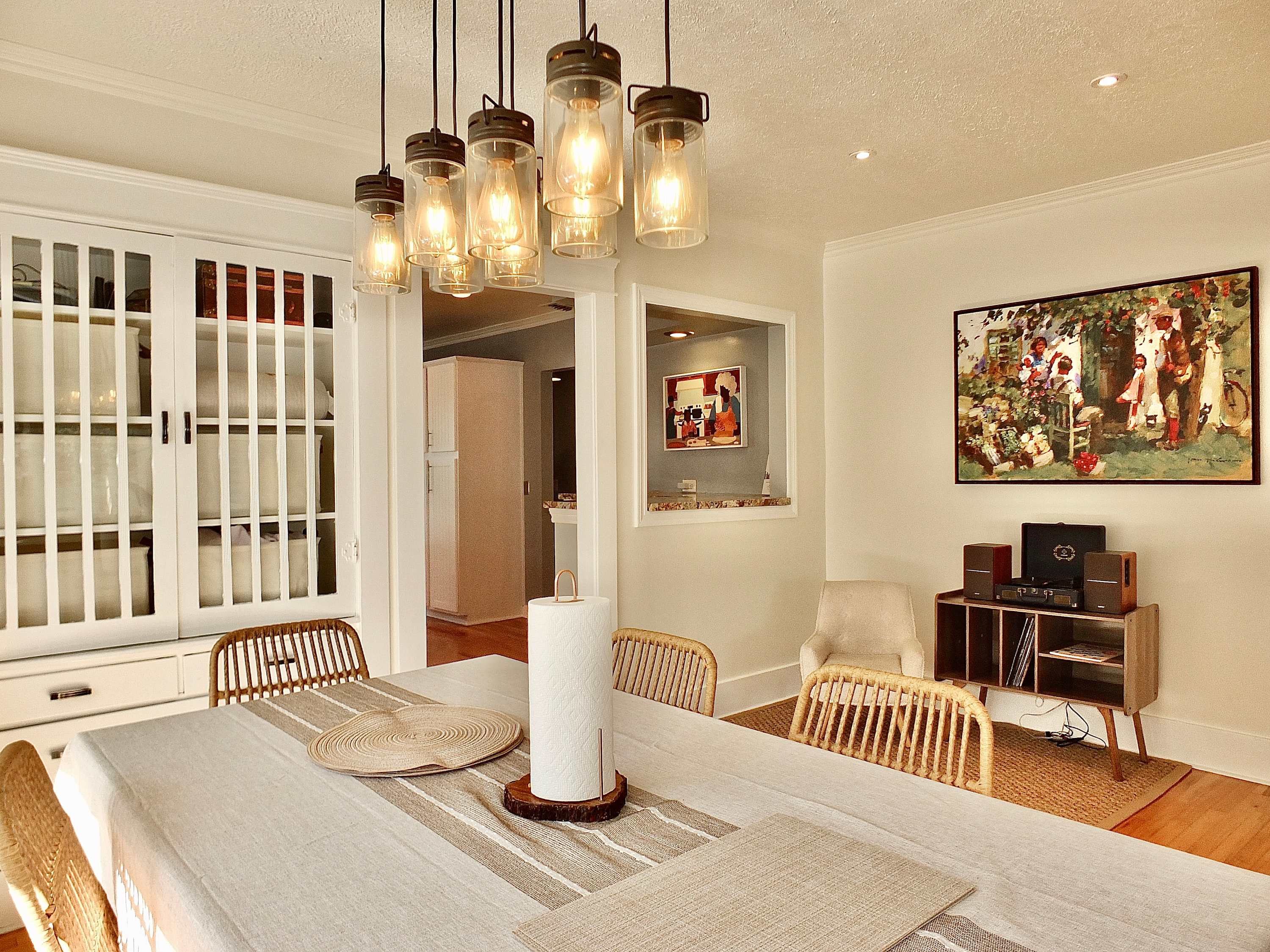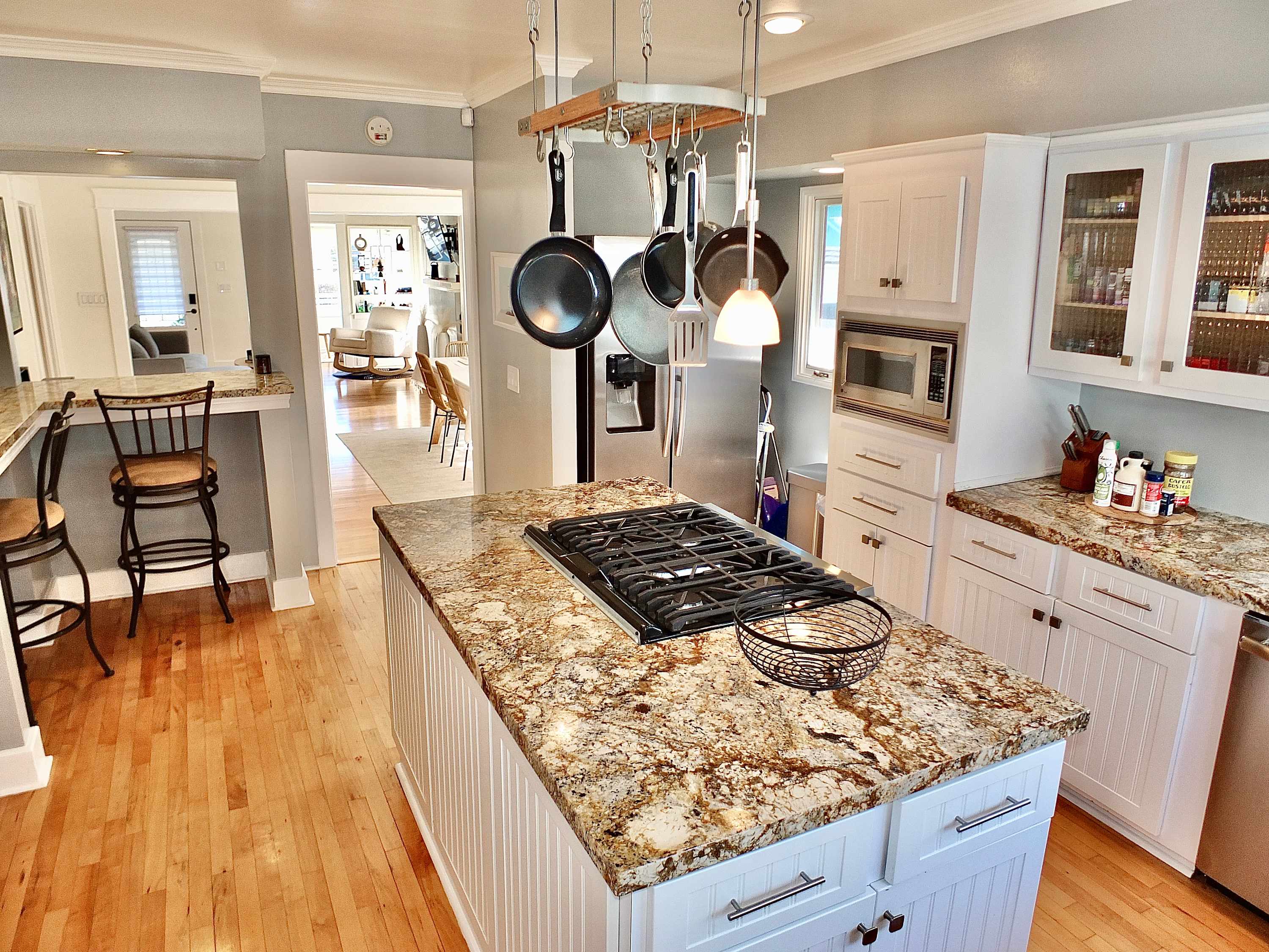 The fully equipped kitchen is a chef’s delight, showcasing stainless steel appliances, glossy stone counters, and sleek white cabinetry stocked with all the cookware and dining ware you need to whip up delicious homecooked creations. Dine in style at the formal table with seating for the whole crew or snag a high-top stool at the counter for a more quick and casual option.