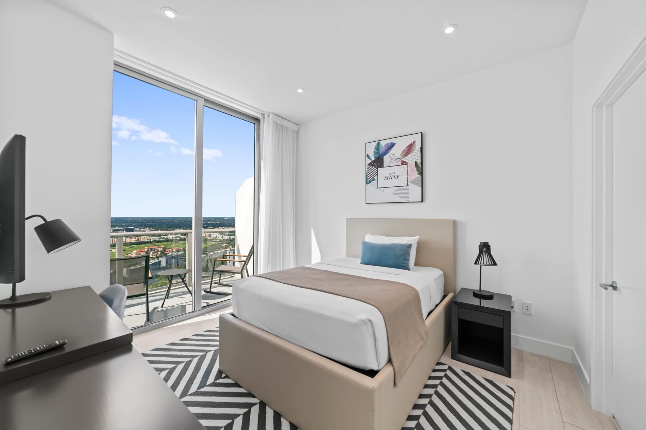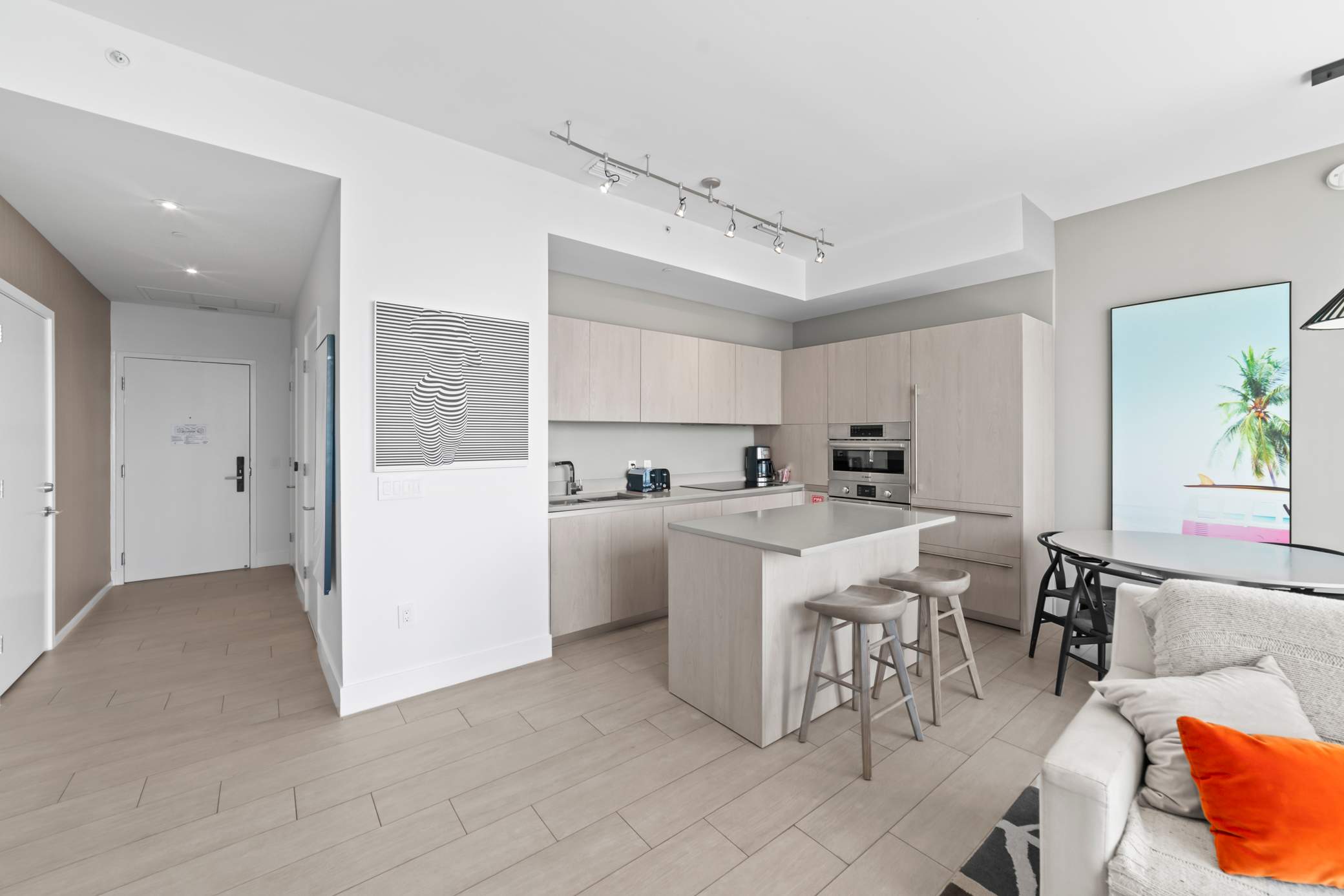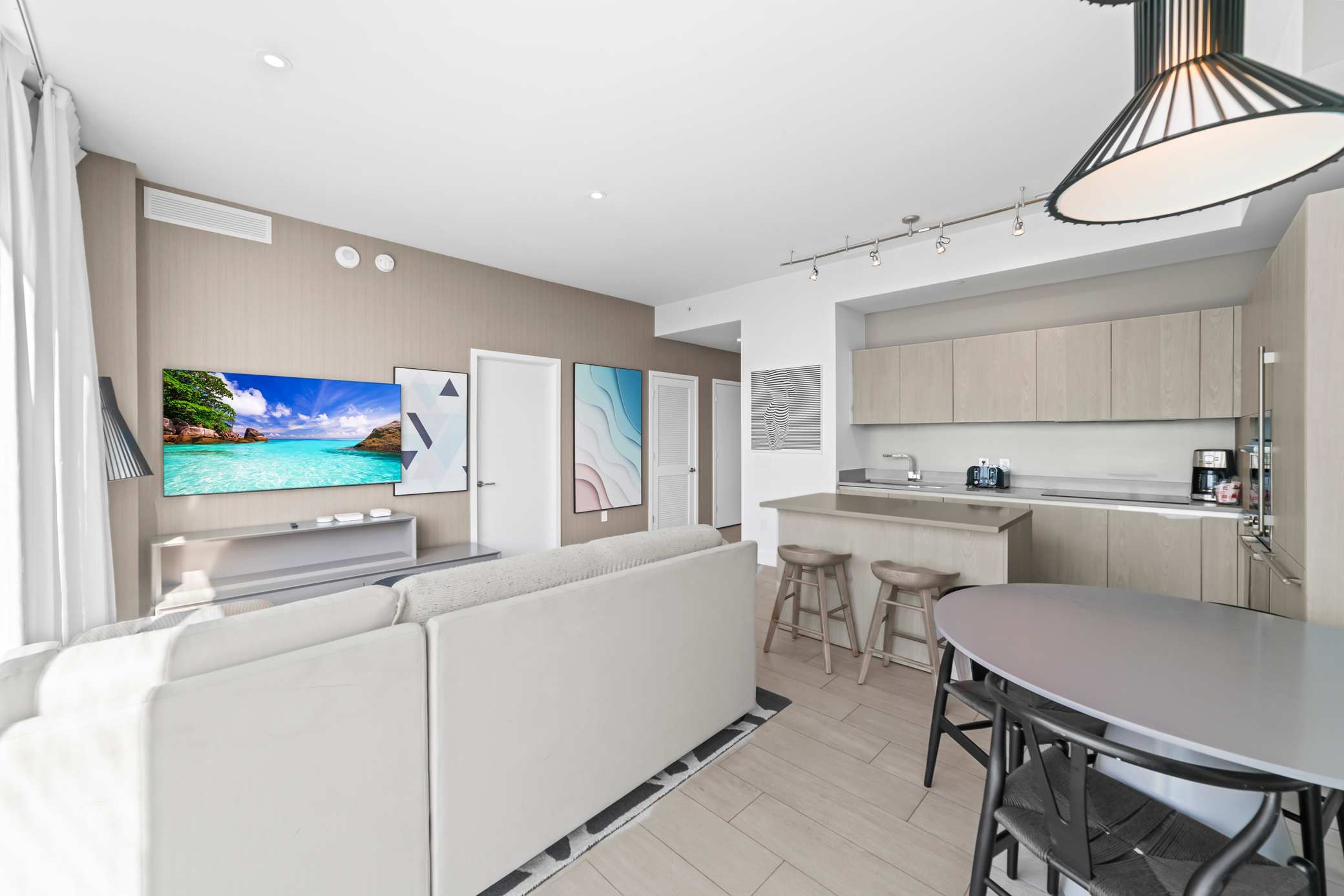 The home’s pristine interior is a chic, contemporary retreat, where tall ceilings sit atop open spaces illuminated in natural light from floor-to-ceiling picture windows. Sink into plush sofa seating while you keep up with all your stream-ready shows and movies on the mounted smart TV. Steps way, the stylish kitchen showcases stainless steel appliances, glossy stone countertops, and sleek cabinetry stocked with cookware and dining ware. Gather around the circular dining table for formal meals or snag a high-top stool at the island to nosh on a spread of afternoon hors d’oeuvres while you make plans for the evening ahead.