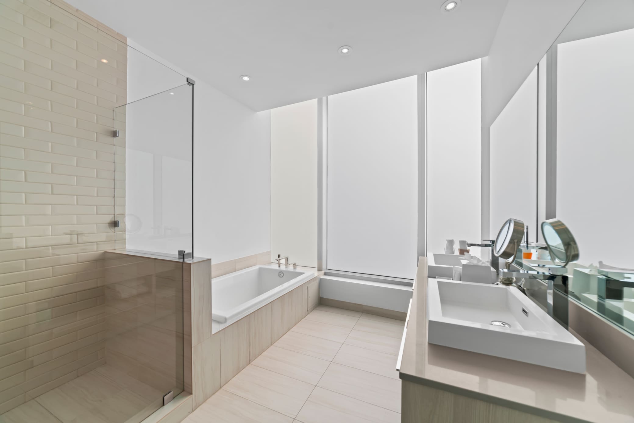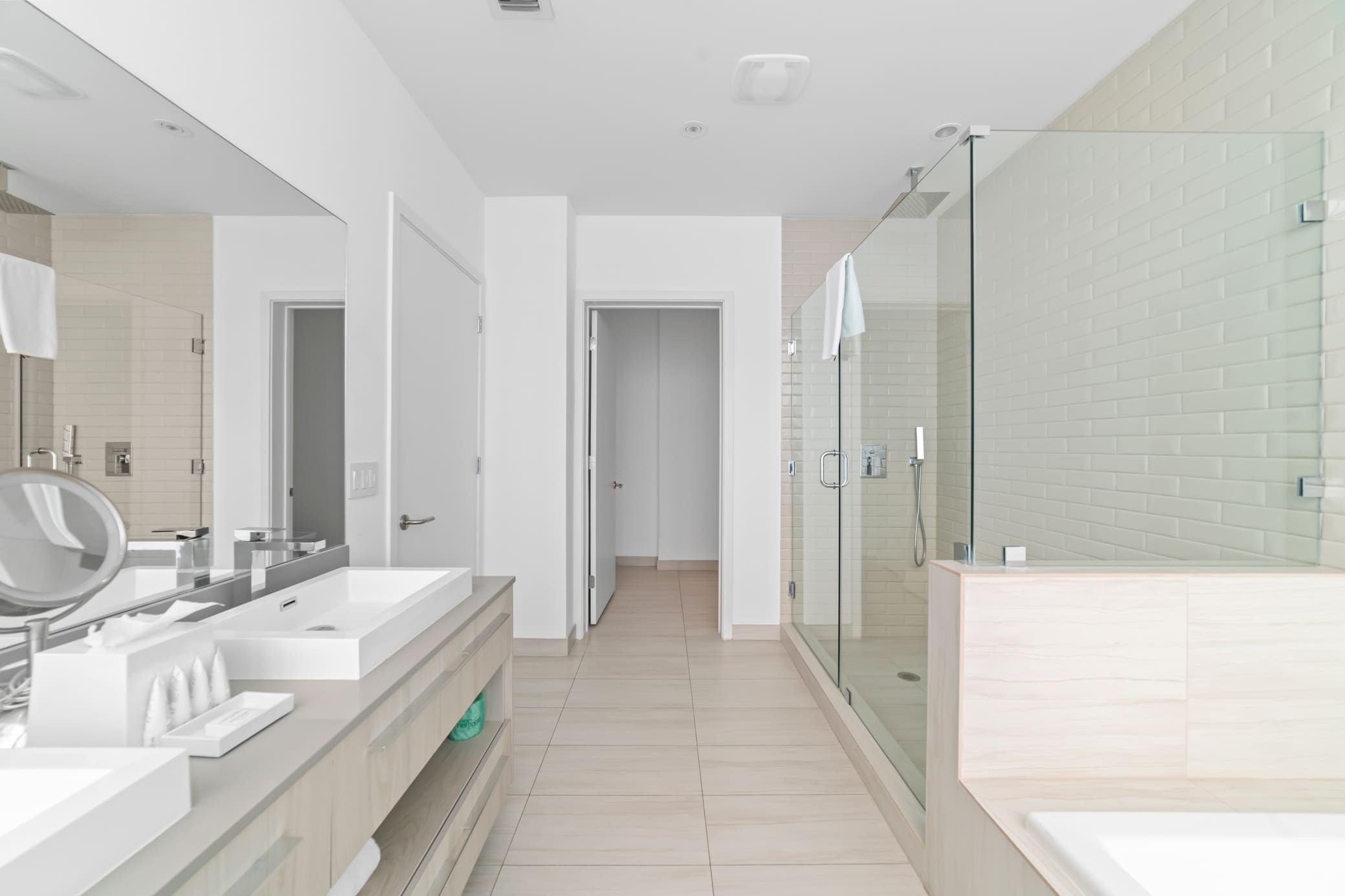 Bedroom #2 includes a king size bed, smart TV, balcony access, and ensuite bathroom with a dual vanity, soaking tub, and glass walk-in shower.