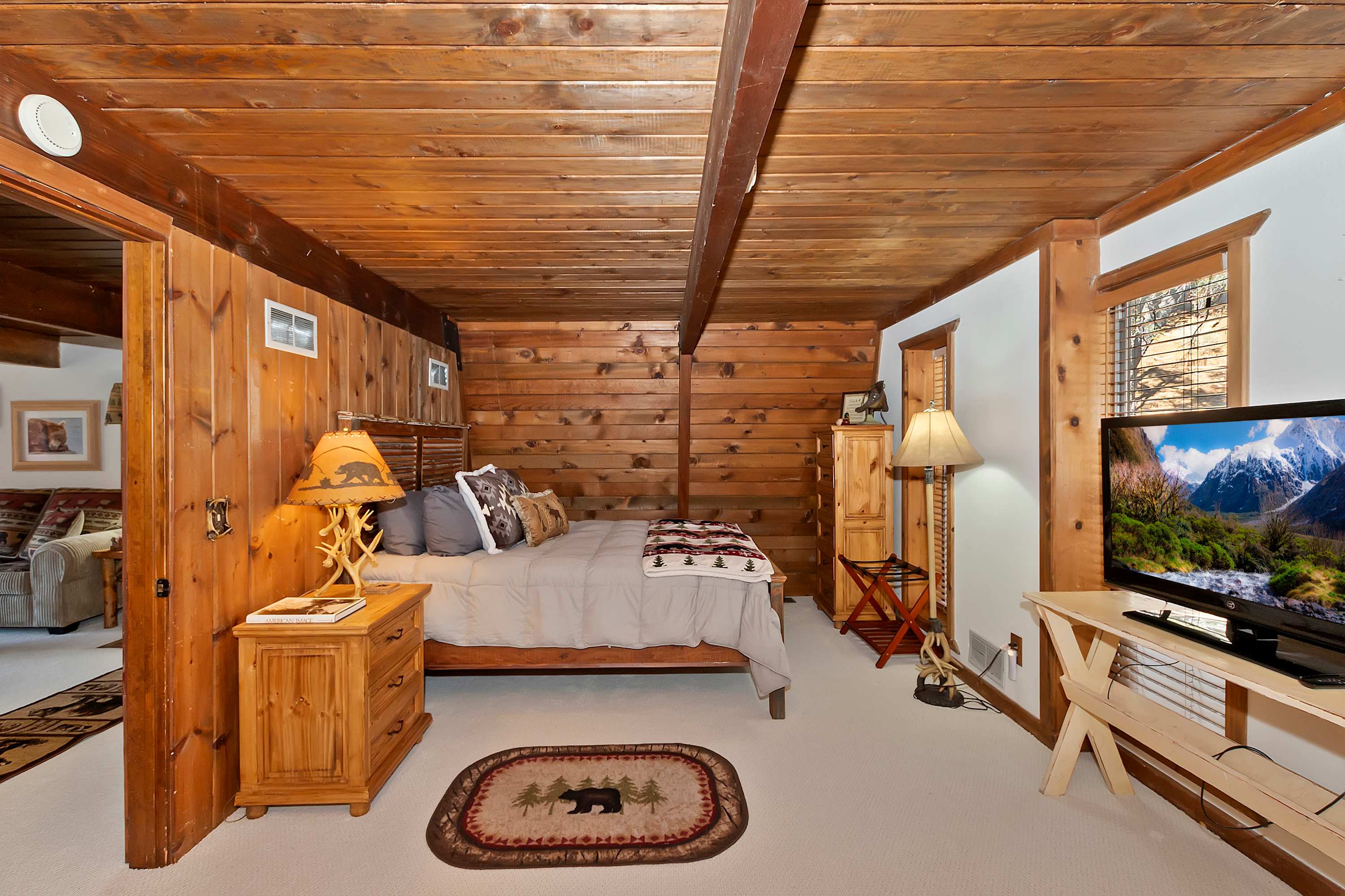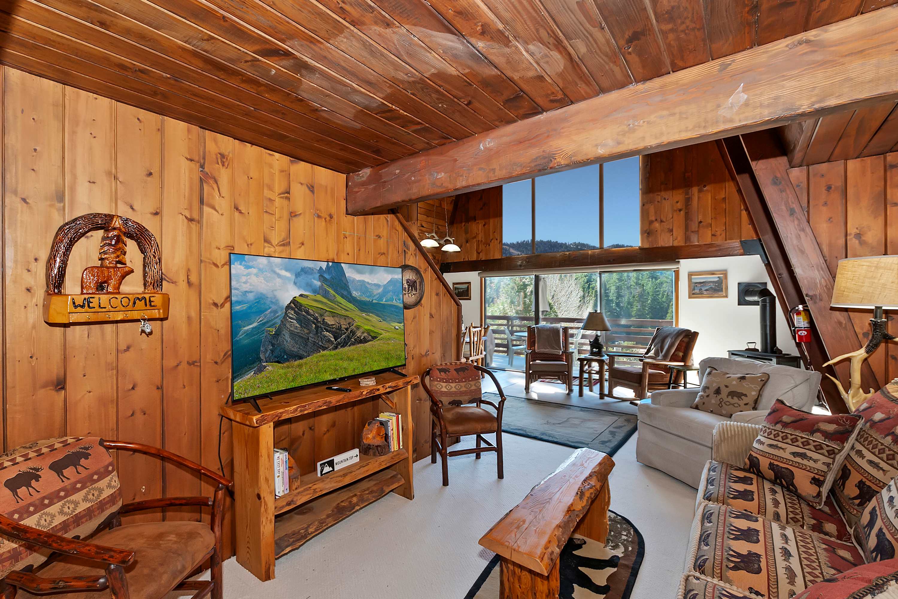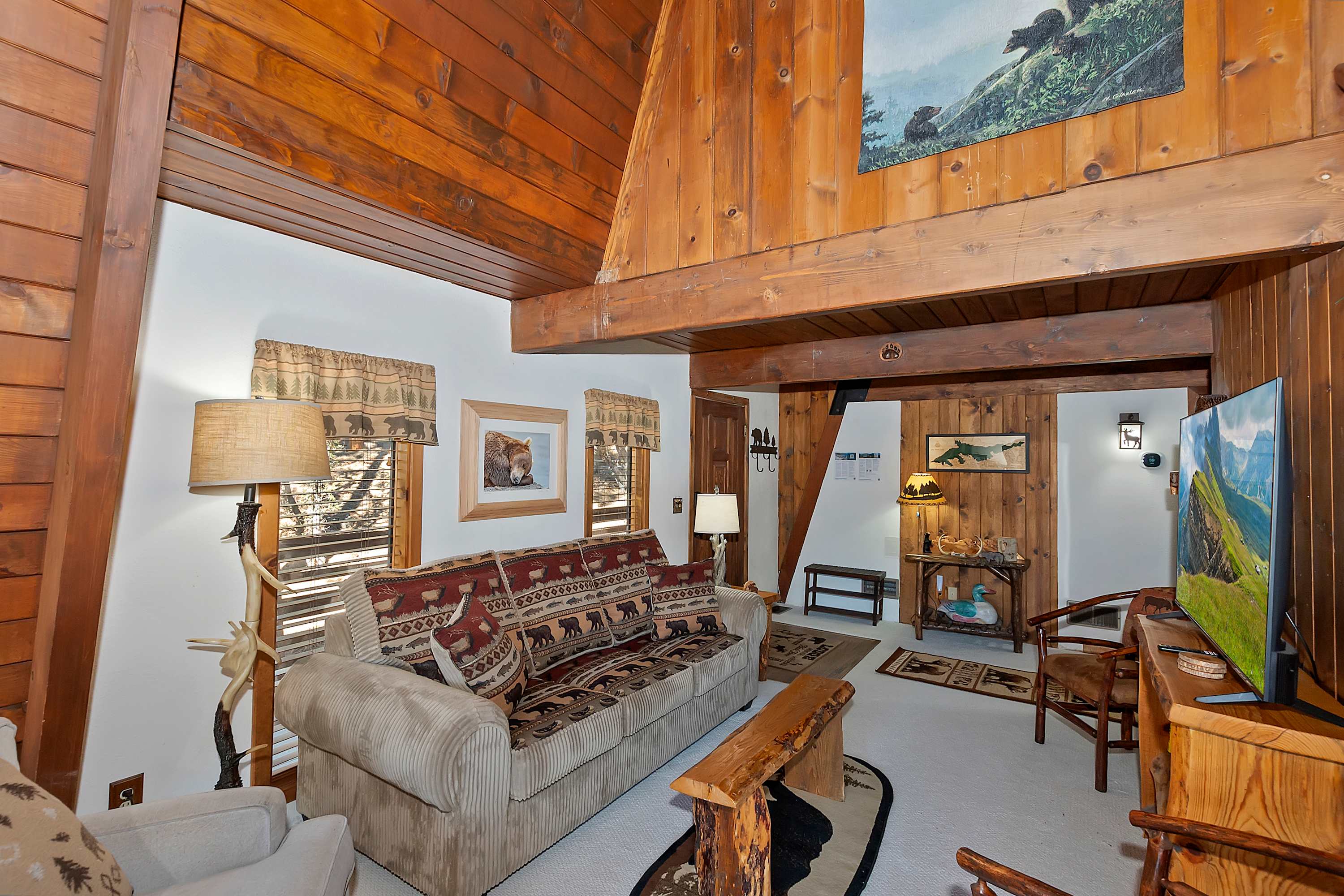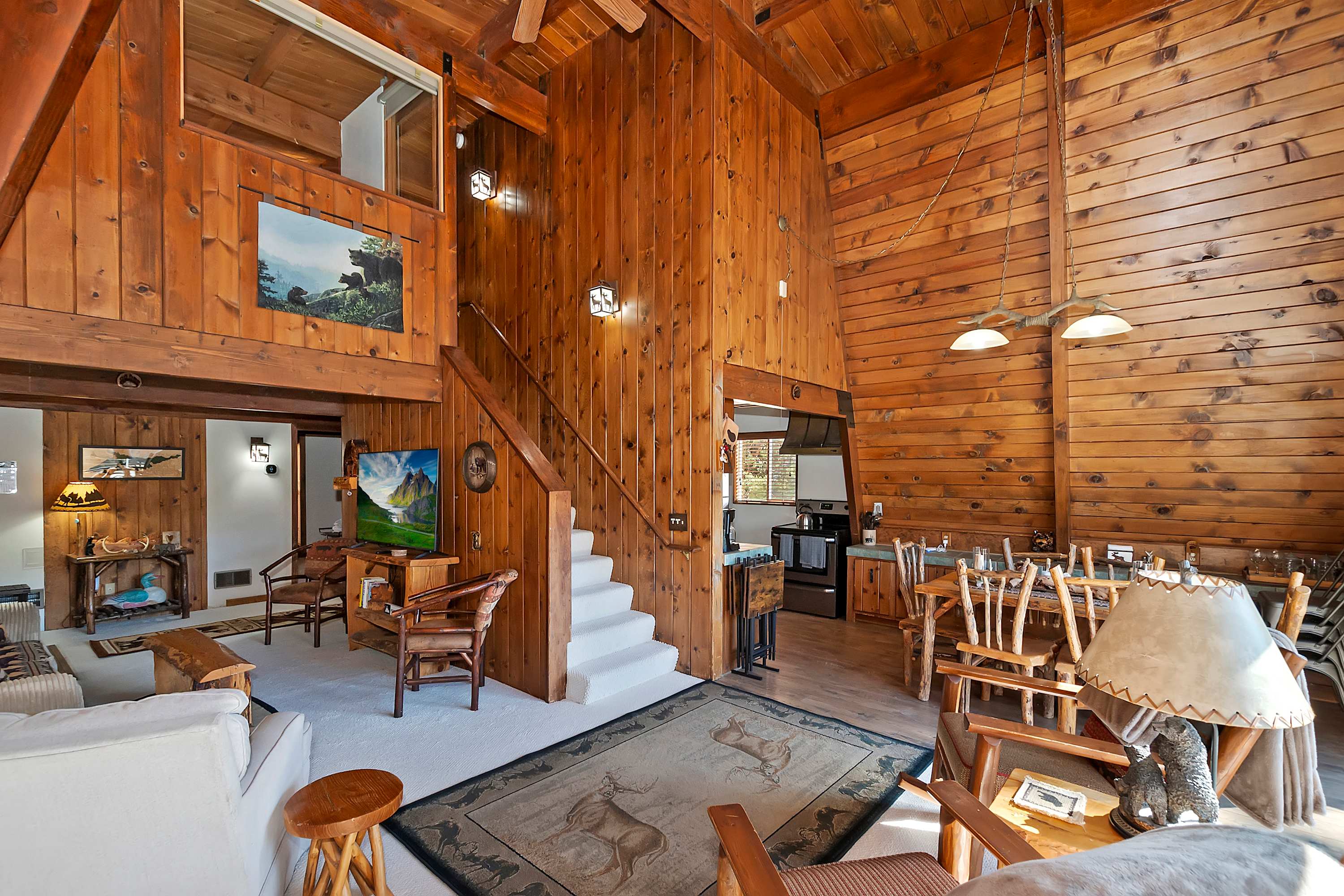 The home’s spacious interior offers impeccable cabin vibes, with wood-lined walls and ceilings adding depth to spaces illuminated in natural light from the floor-to-ceiling picture windows. The living room includes soft sofa seating and a smart TV for keeping up with all your favorite stream-ready entertainment. Relax with your morning coffee by the cozy fireplace, providing both warmth and ambiance during the cooler months.