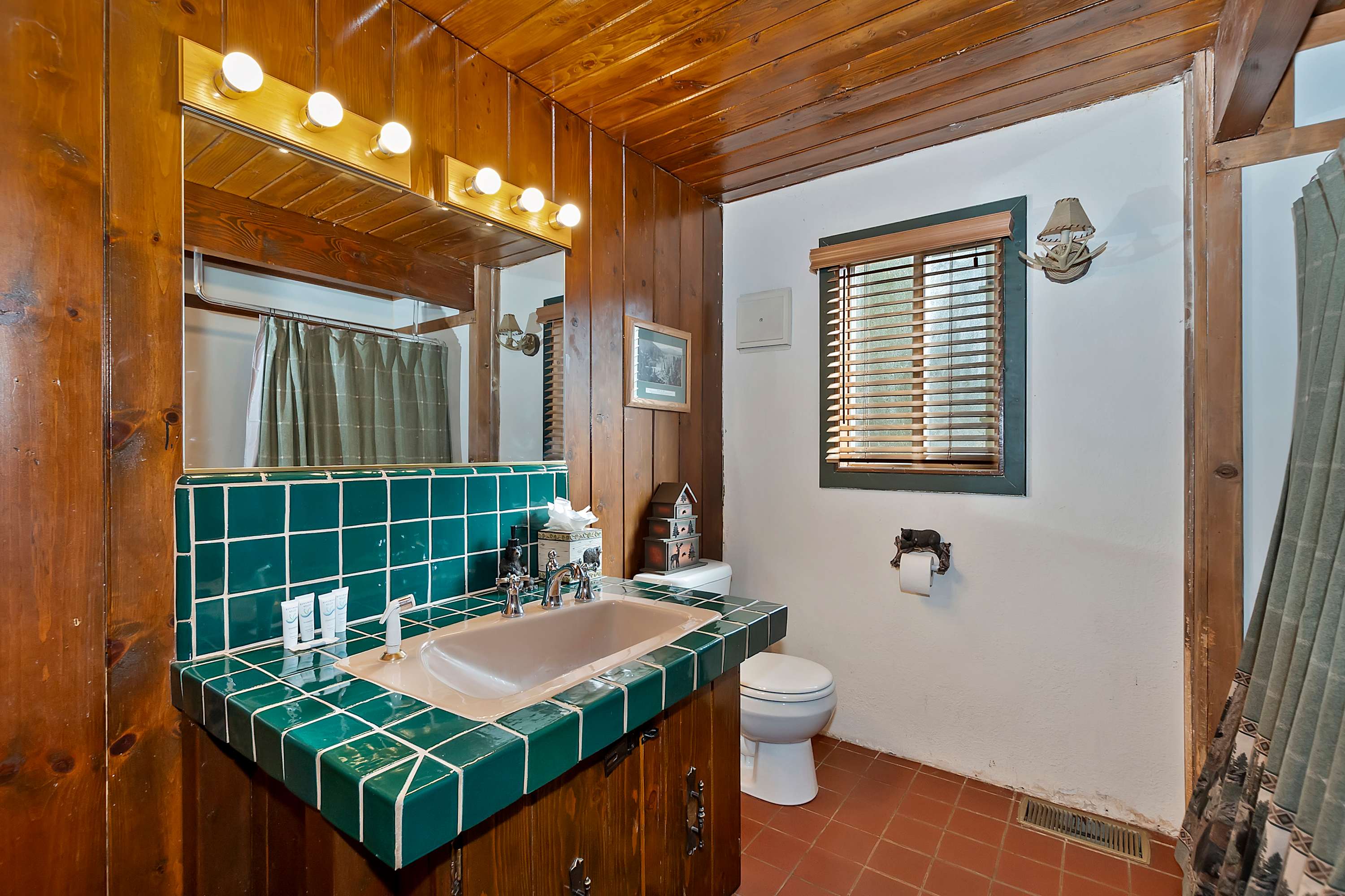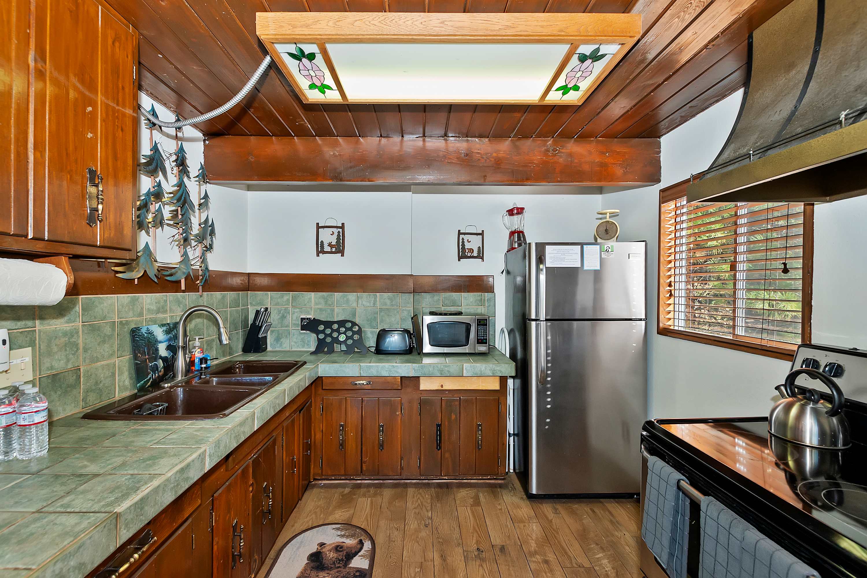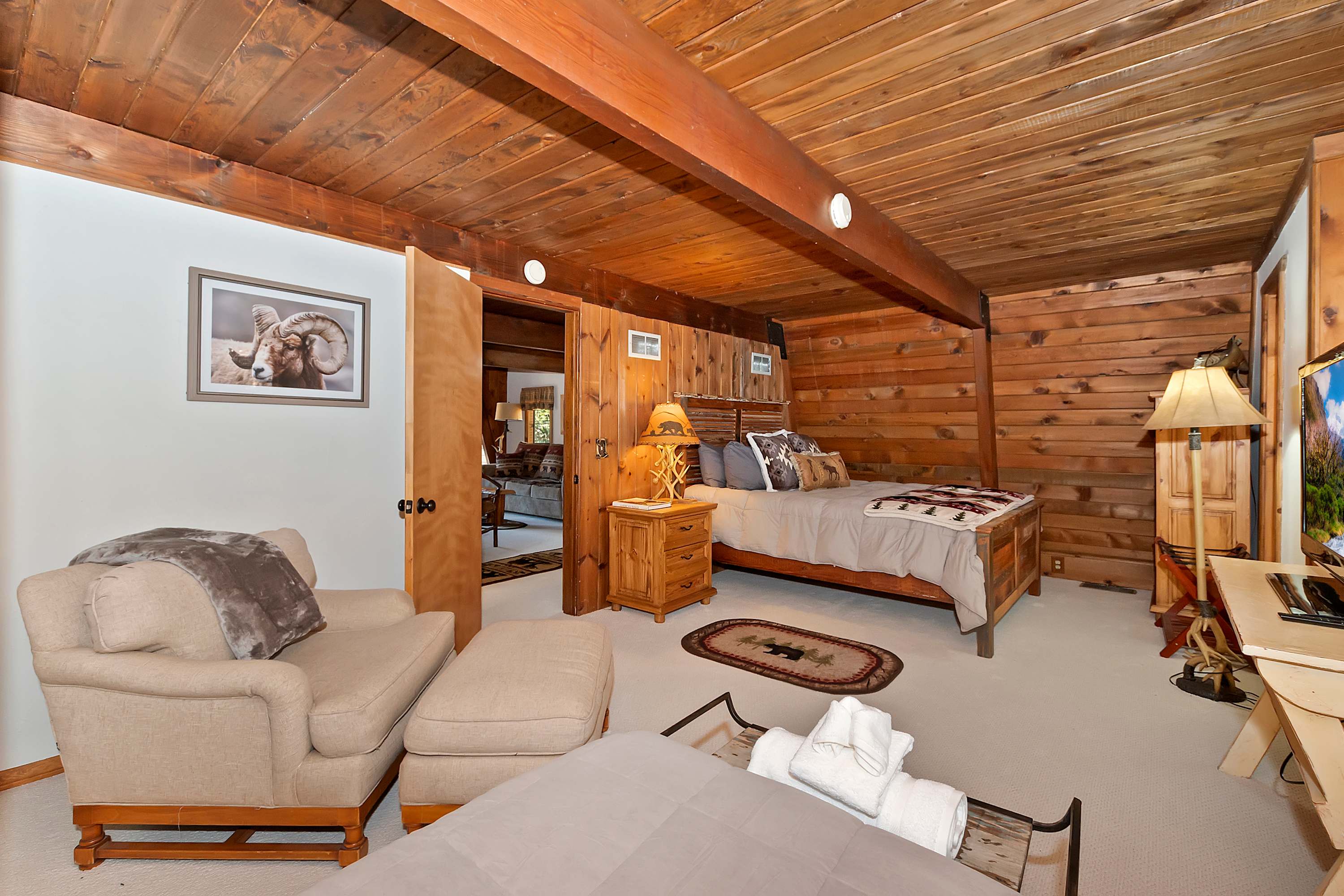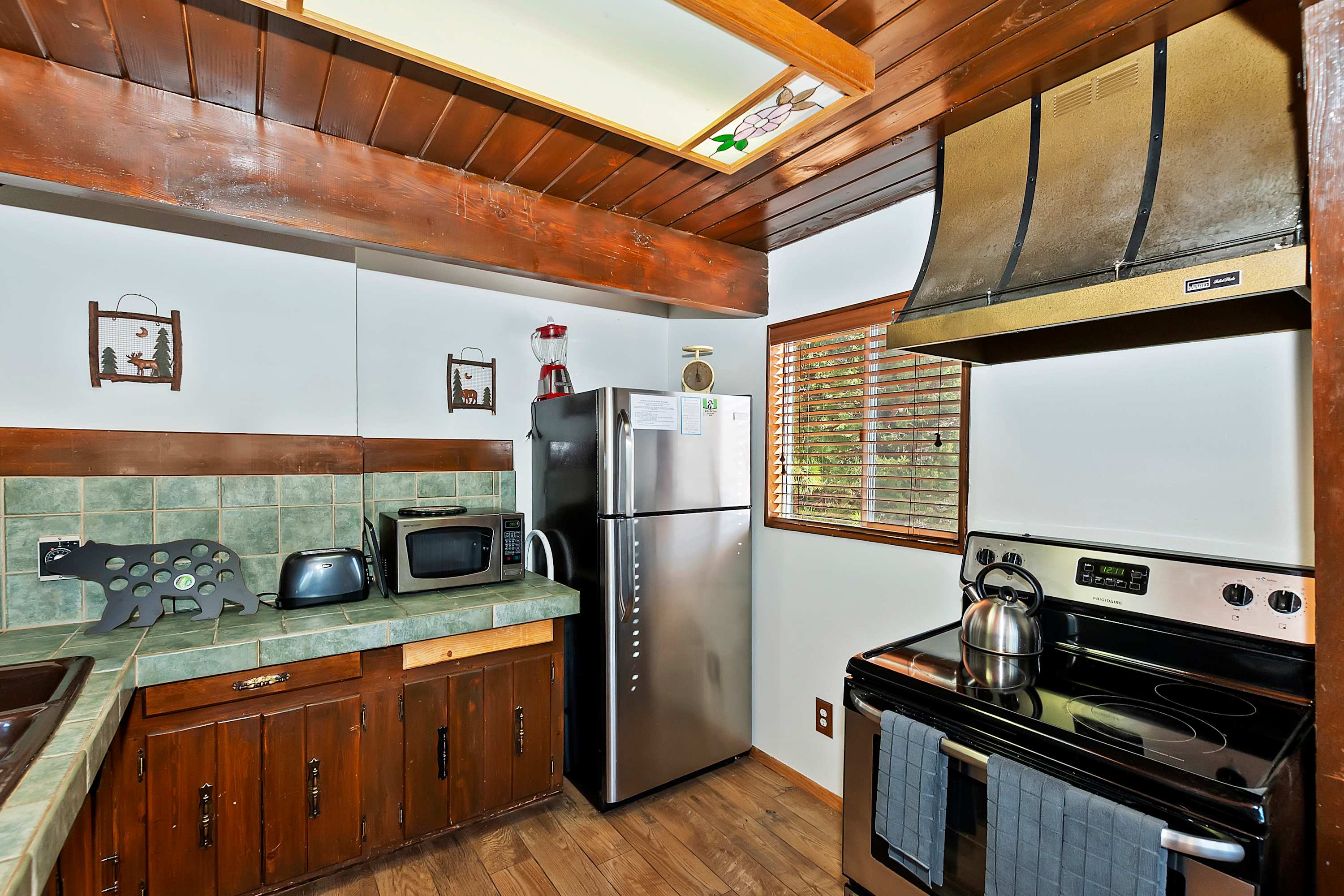 The home’s spacious interior offers impeccable cabin vibes, with wood-lined walls and ceilings adding depth to spaces illuminated in natural light from the floor-to-ceiling picture windows. The living room includes soft sofa seating and a smart TV for keeping up with all your favorite stream-ready entertainment. Relax with your morning coffee by the cozy fireplace, providing both warmth and ambiance during the cooler months.