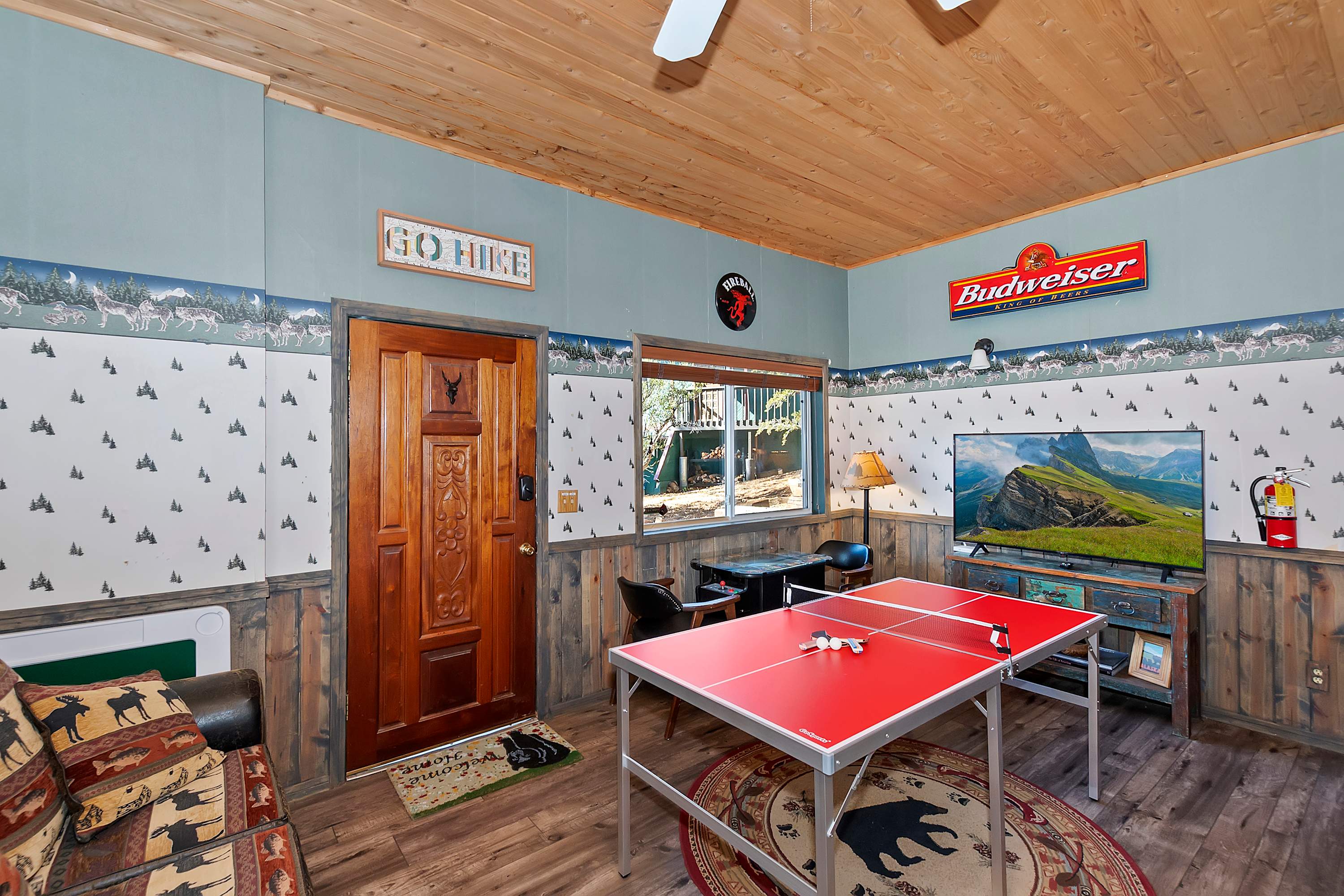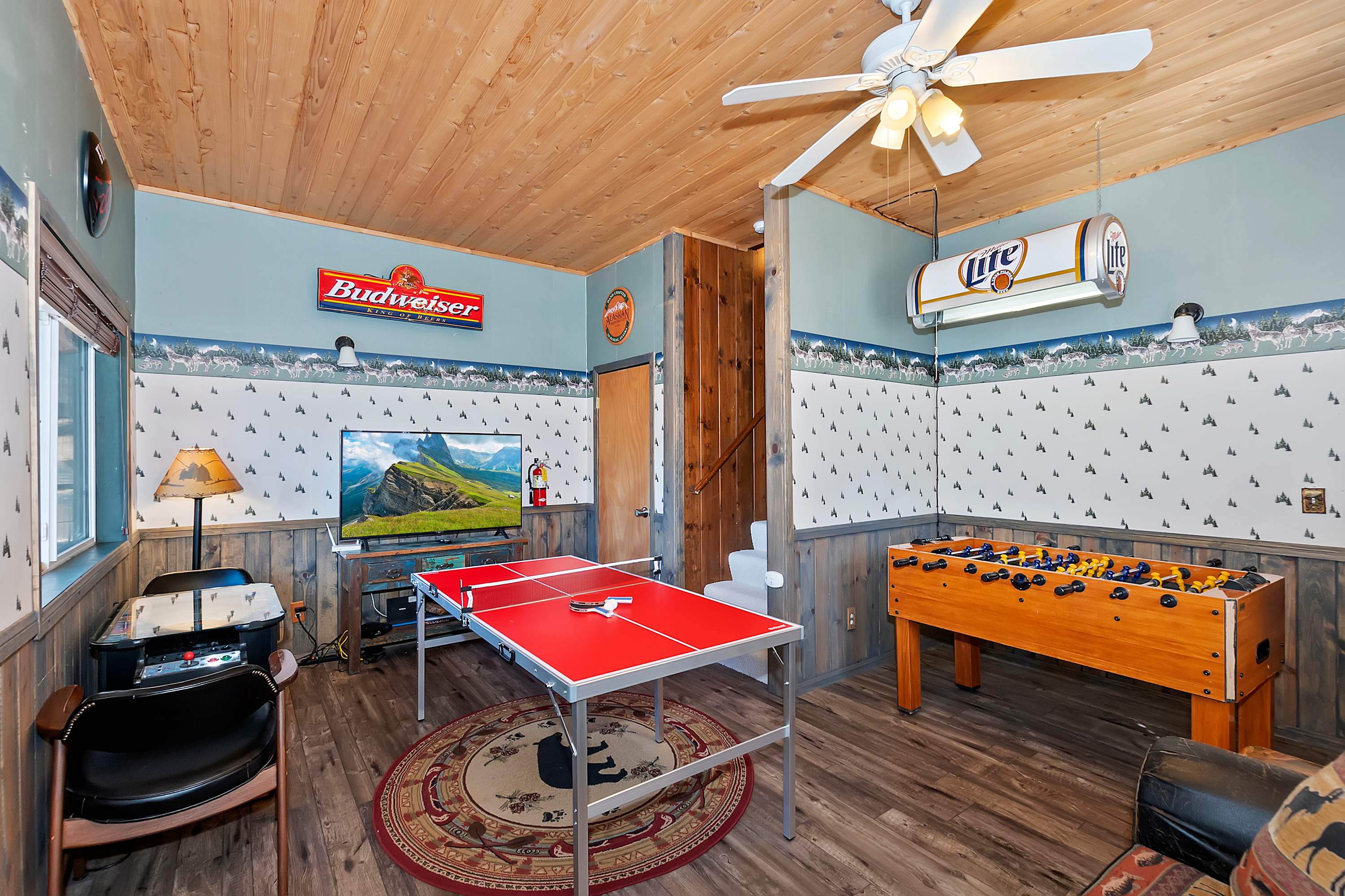 The well-equipped kitchen will have you whipping up delicious homestyle meals in no time, inclusive of stainless-steel appliances, tile countertops, and rich wood cabinetry. The stunning wood-carved dining set seats 6 for formal meals, those epic mountain views providing the perfect backdrop. If you find yourself with energy yet to burn, the game room has you covered, the ping pong, foosball, and arcade tables offering hours of endless fun while you stream the big game on the smart TV.