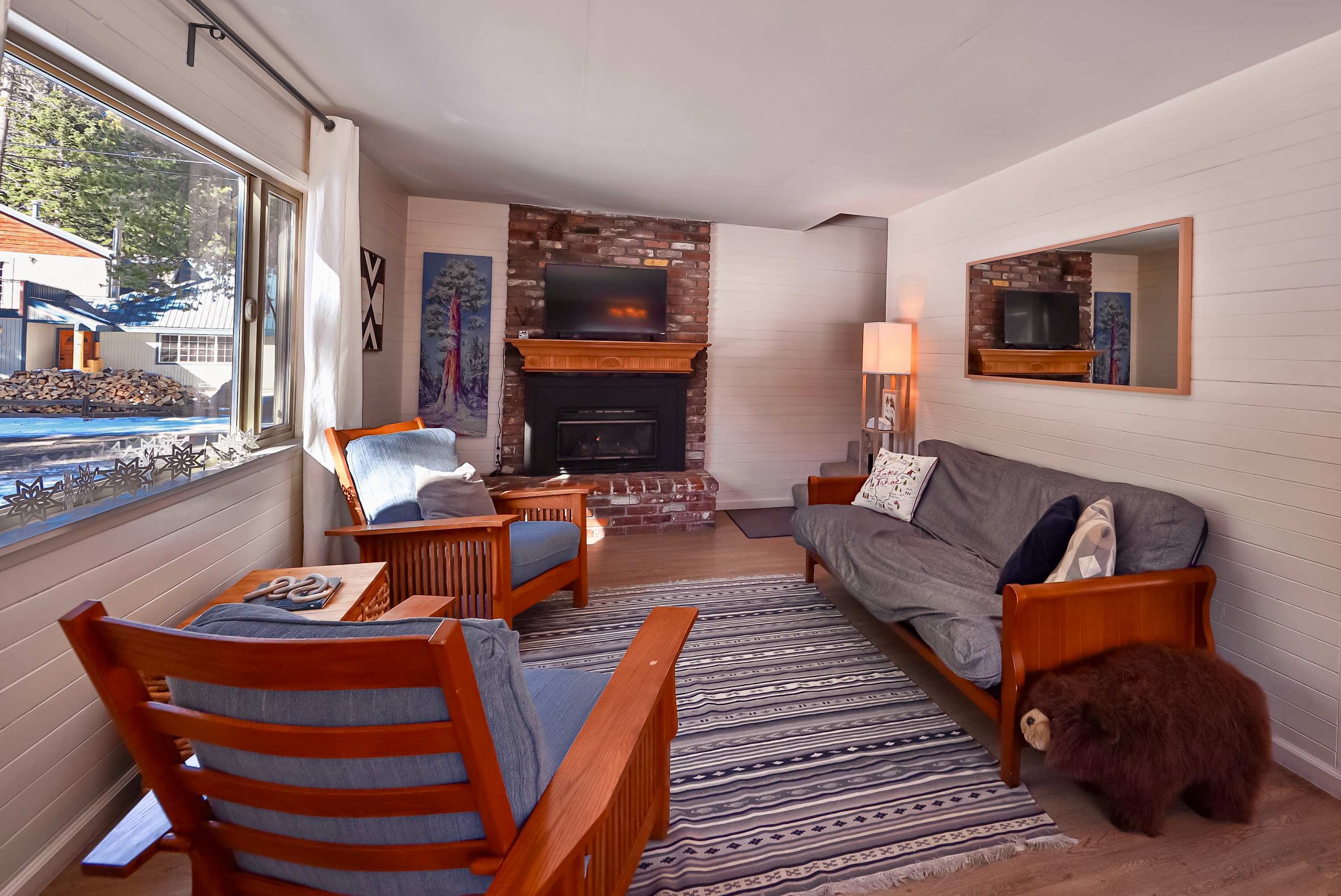 The home’s cozy interior delivers on all of its cabin-living promises, where open spaces come expertly curated with comfortable furnishings and chic décor to maximize your relaxation and connection with loved ones. Sink into plush sofa and armchair seating in the living room while you stream all your favorite shows on the smart TV, the electric fireplace creating the perfect ambiance for an immersive movie night.