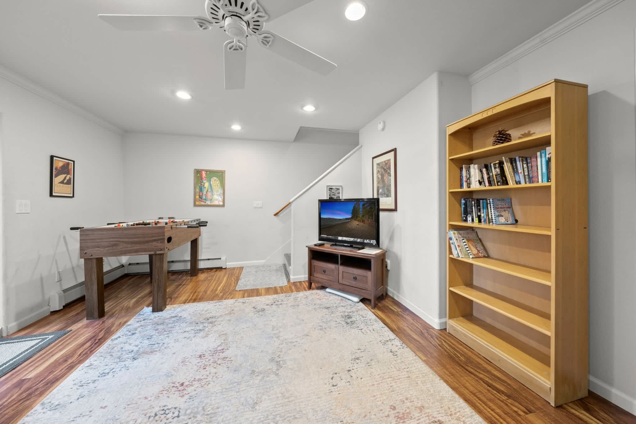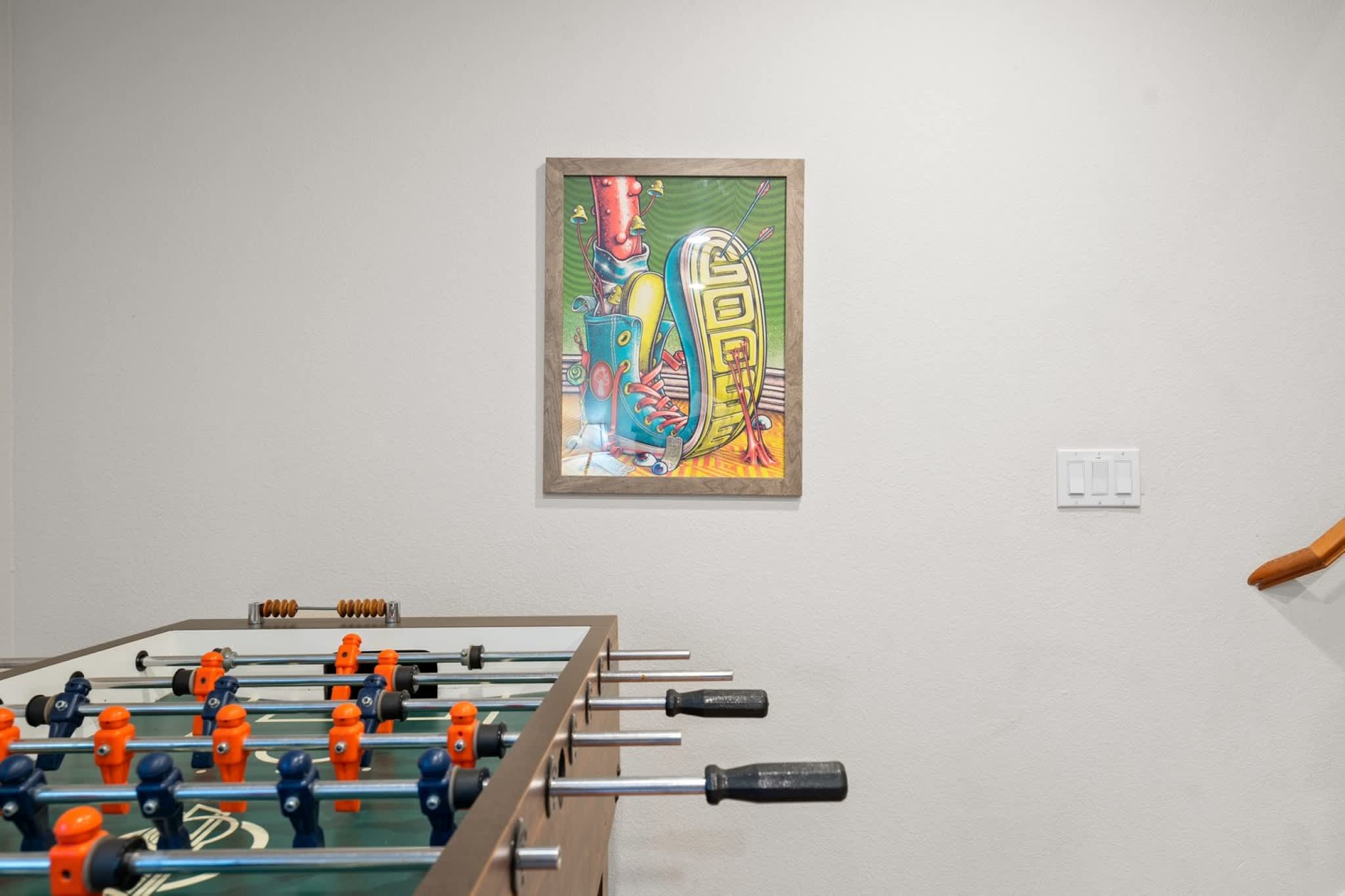 There’s a lounge area with a TV, foosball table and bookshelf to keep you entertained.
