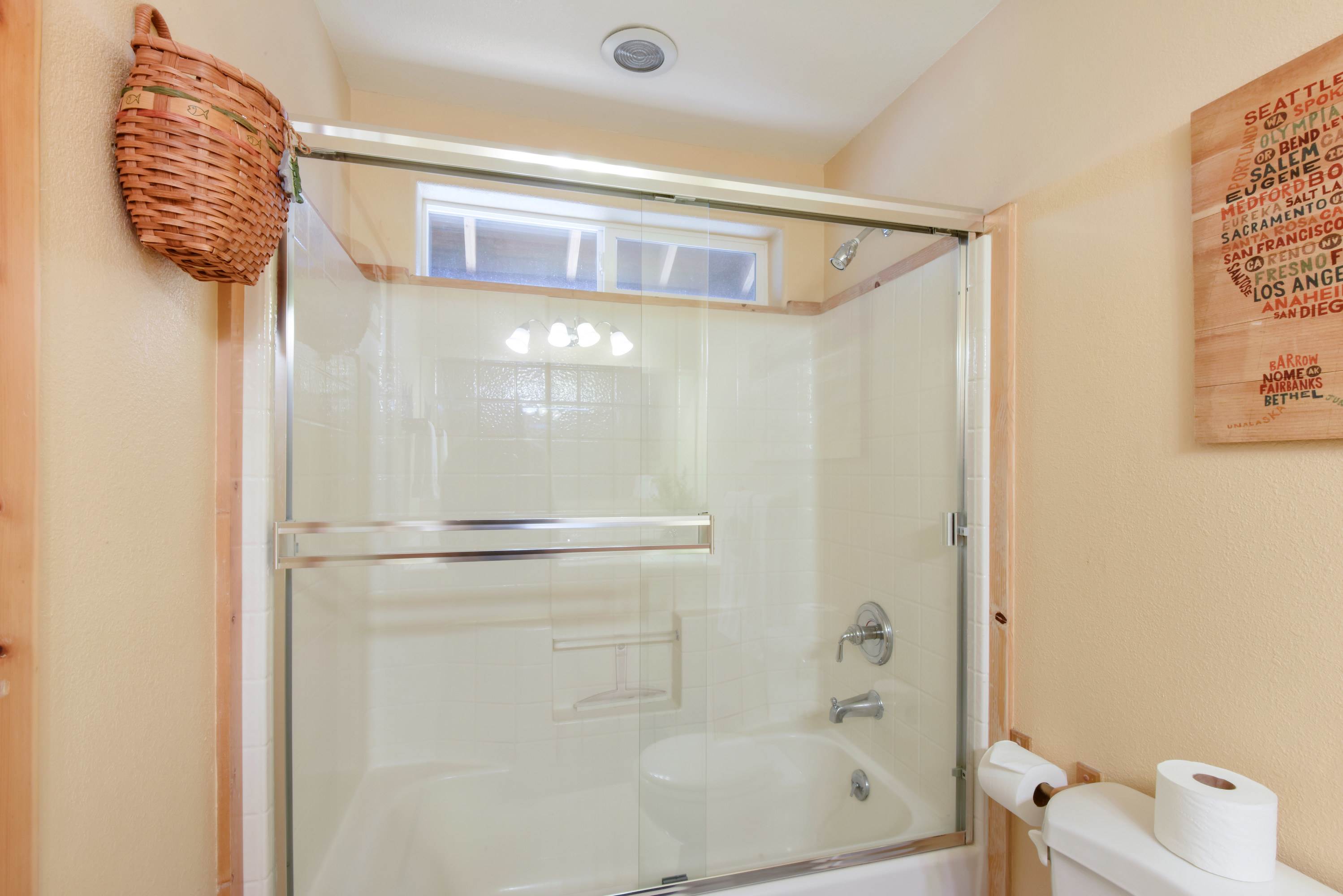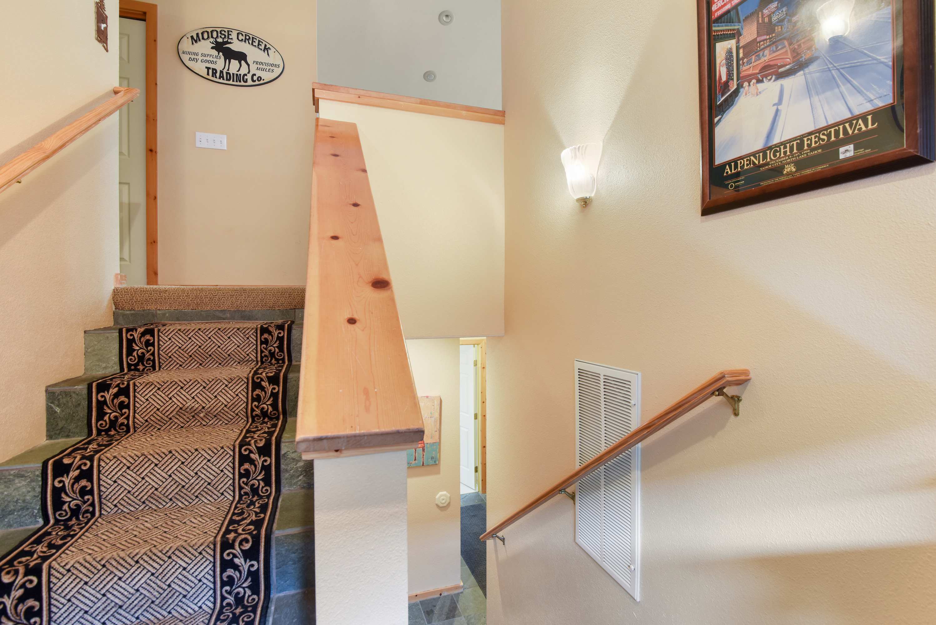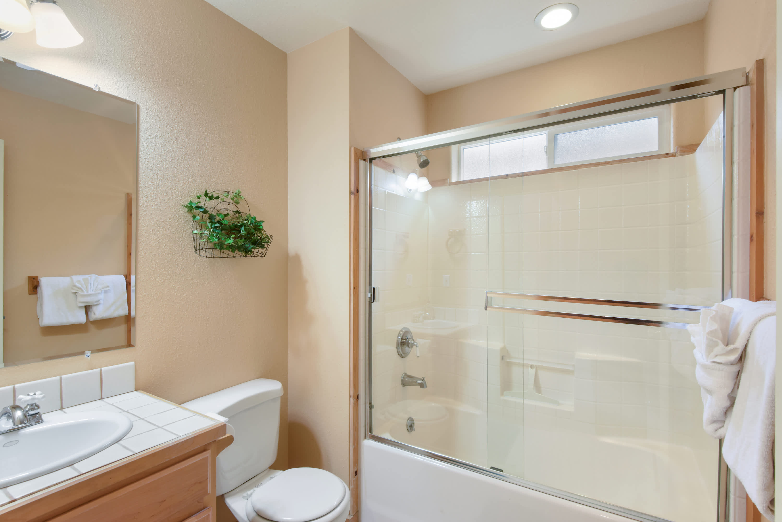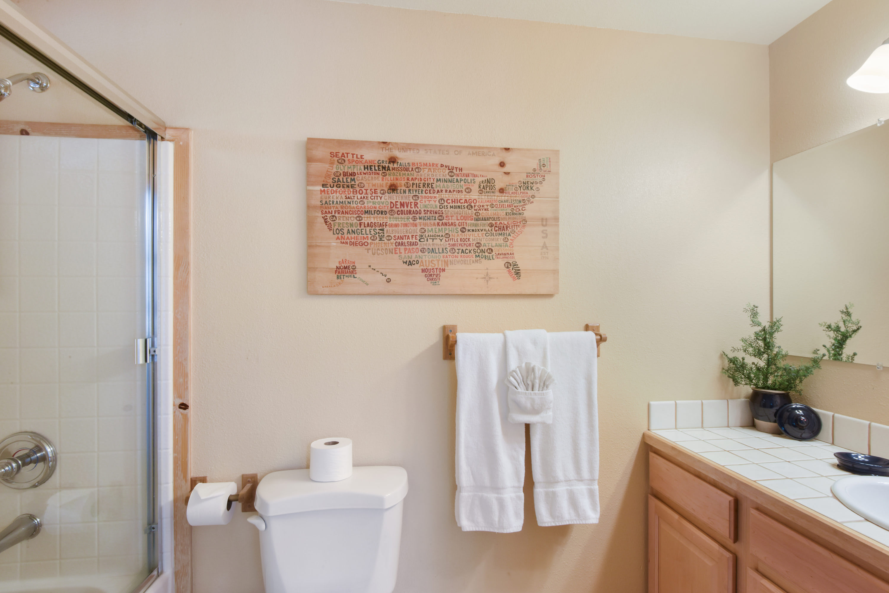 All 3 bedrooms are located downstairs. The main bedroom holds a Queen bed and an en suite bathroom. The en suite bathroom has a shower/tub combo. The 2nd bedroom has a Queen bed. The last bedroom has 2 Twin beds with a TV/DVD player, great for the kids! There is a shared full bathroom and half bathroom available.