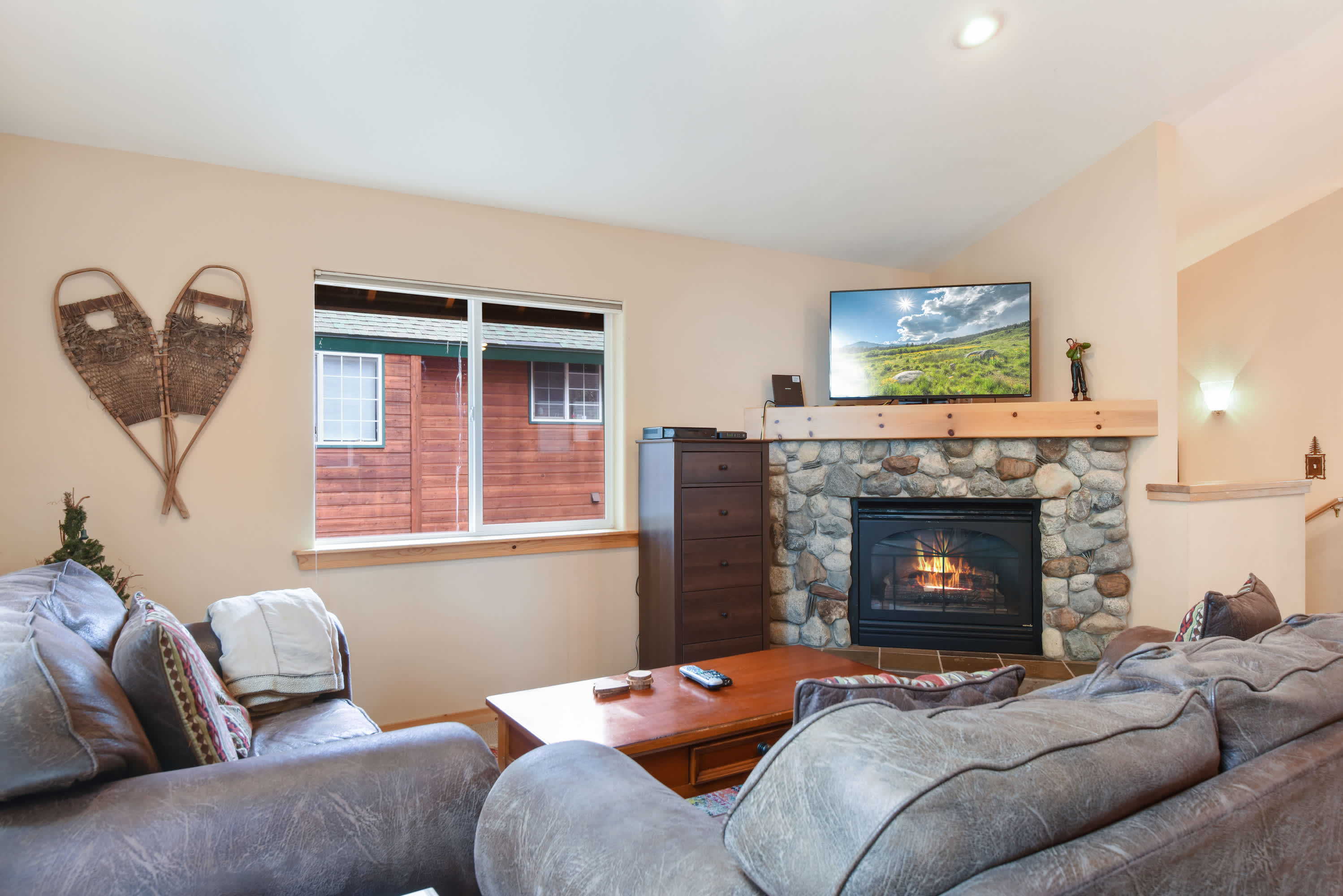 The living room welcomes you with high ceilings, Smart TV (with cable), gas fireplace and comfortable seating. The sliding glass doors lead you to a balcony with gas BBQ and patio seating.