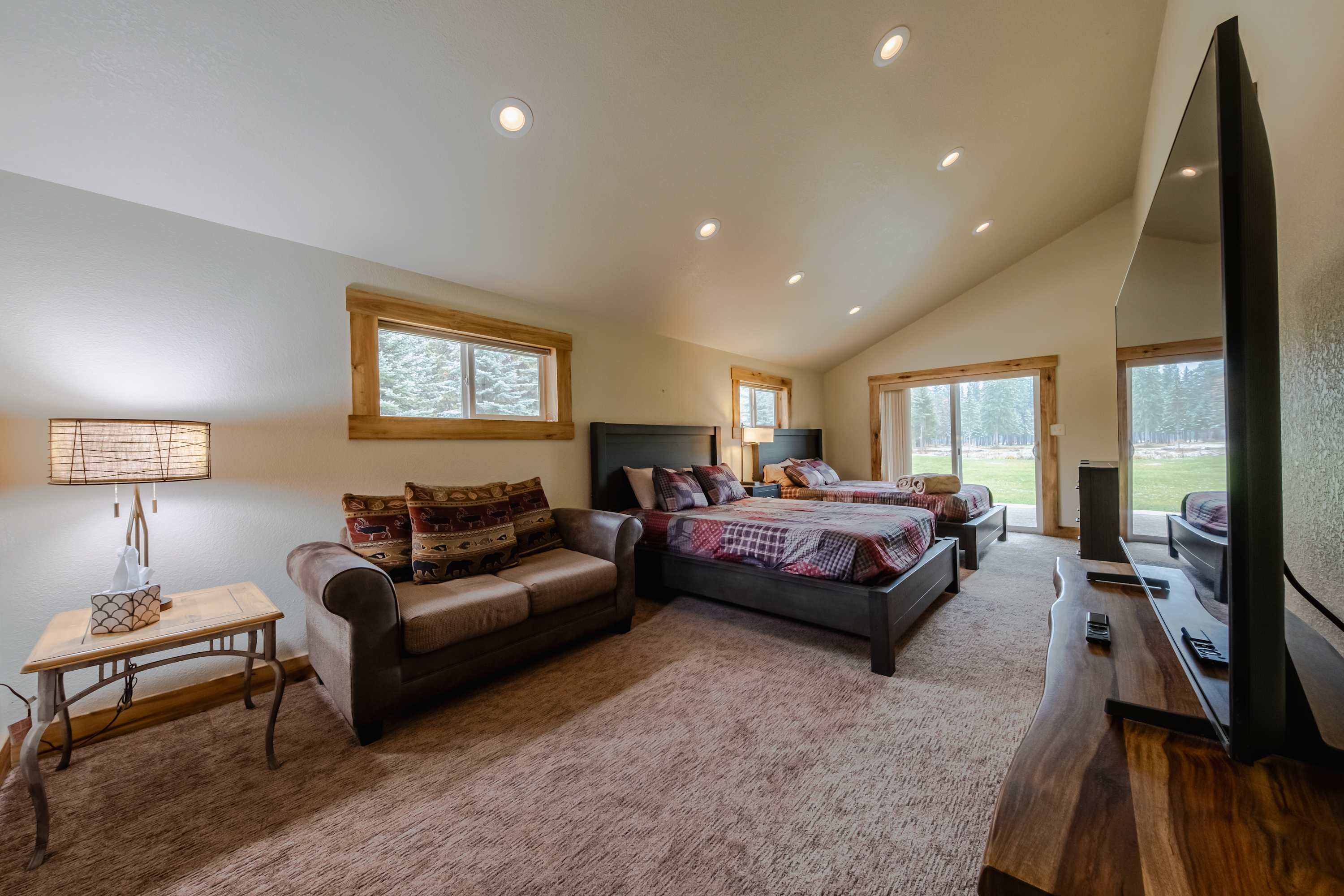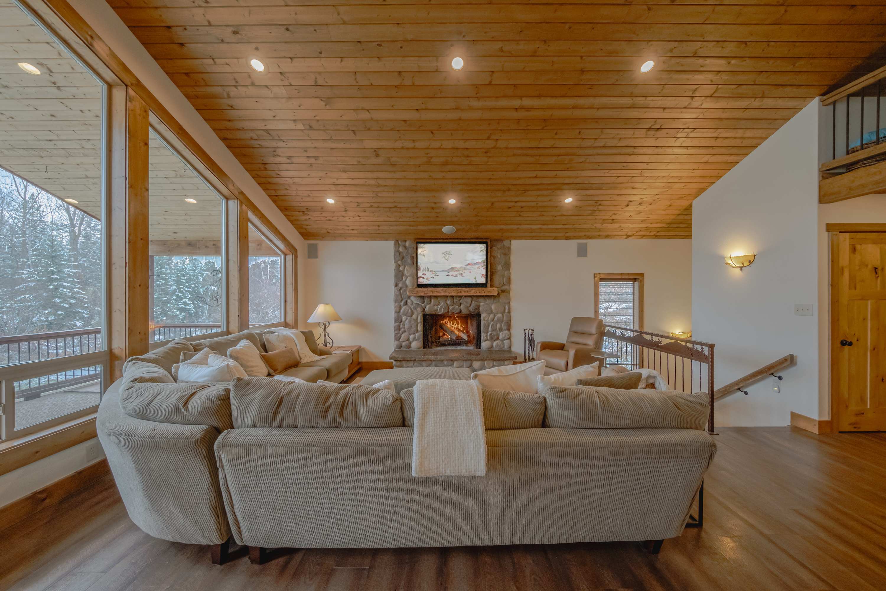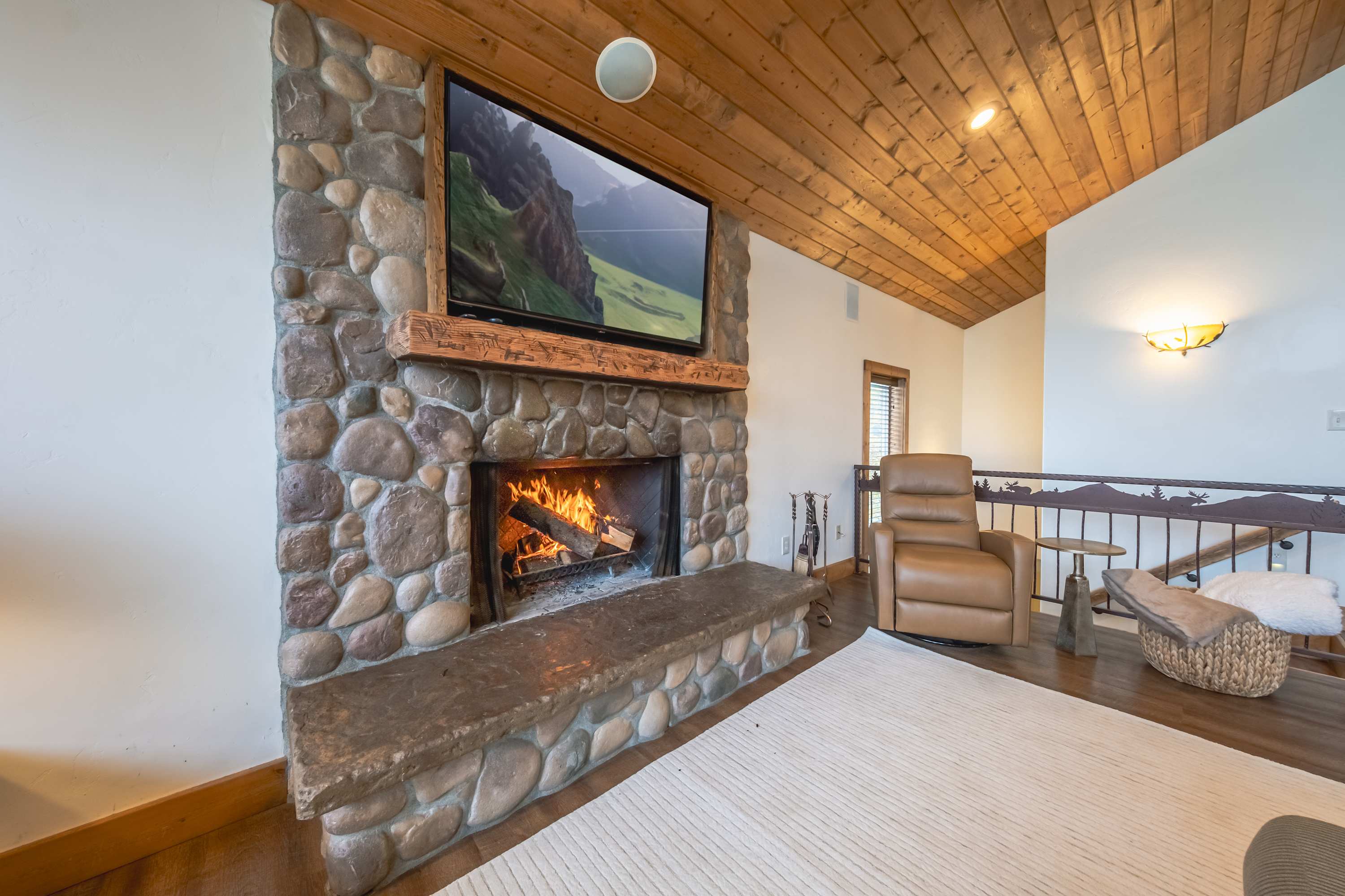 The home’s interior is fit for your crowd, offering plenty of space for everyone to spread out and find their own corner while communal spaces bring you back together for entertainment and connectivity. Soaring, wood-paneled vaulted ceilings create a cozy cabin atmosphere while floor-to-ceiling picture windows illuminate each room in bright, natural light. With two separate living spaces on the main and lower levels, each offering plush sofa seating, smart TVs, and ambient fireplaces, there will never be a need to argue over what to watch. For a quiet place to read or sneak in a quick afternoon nap, the loft has you covered.