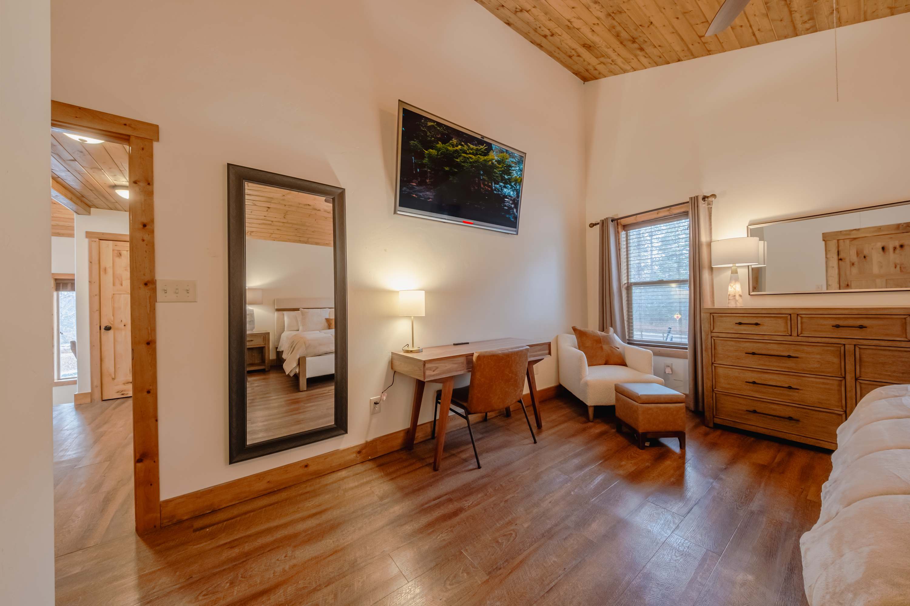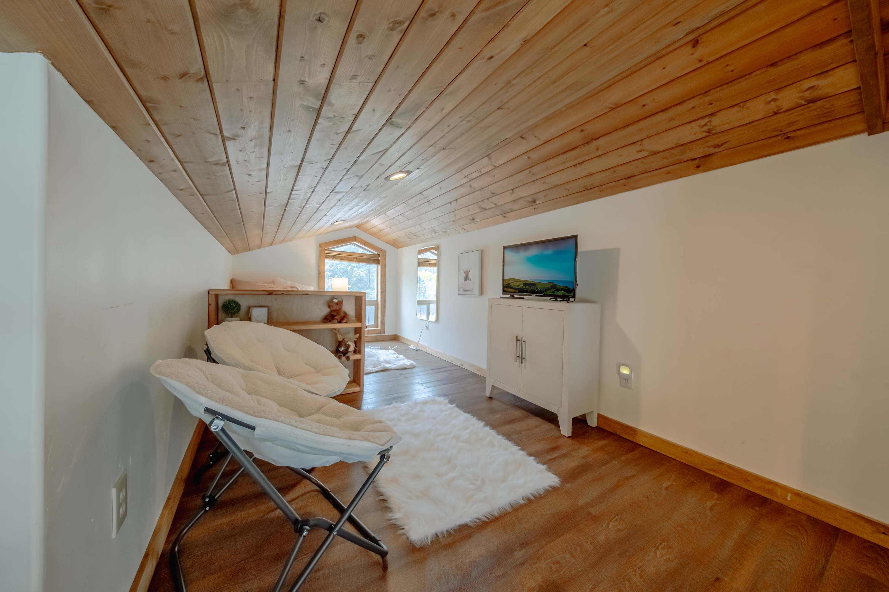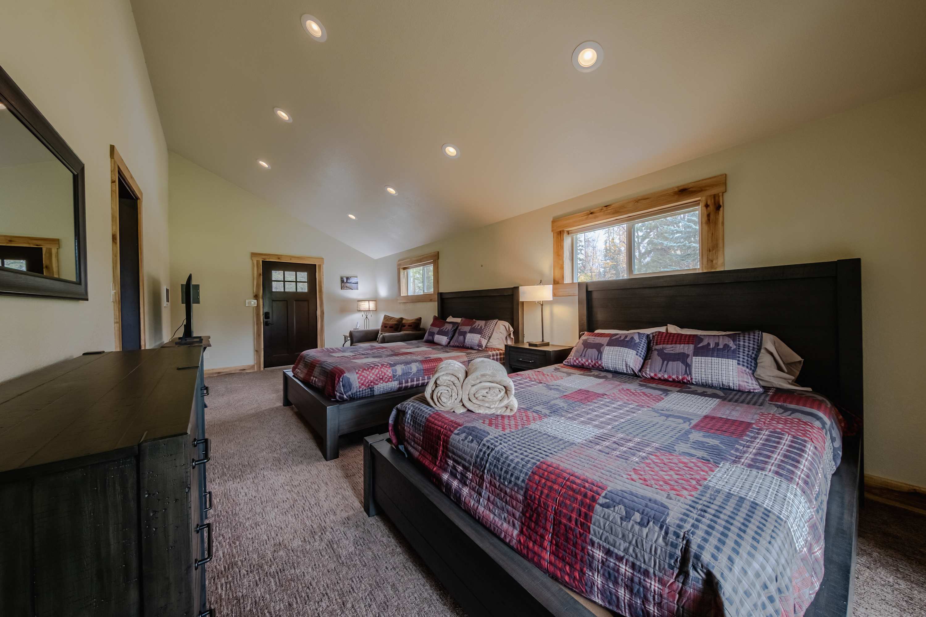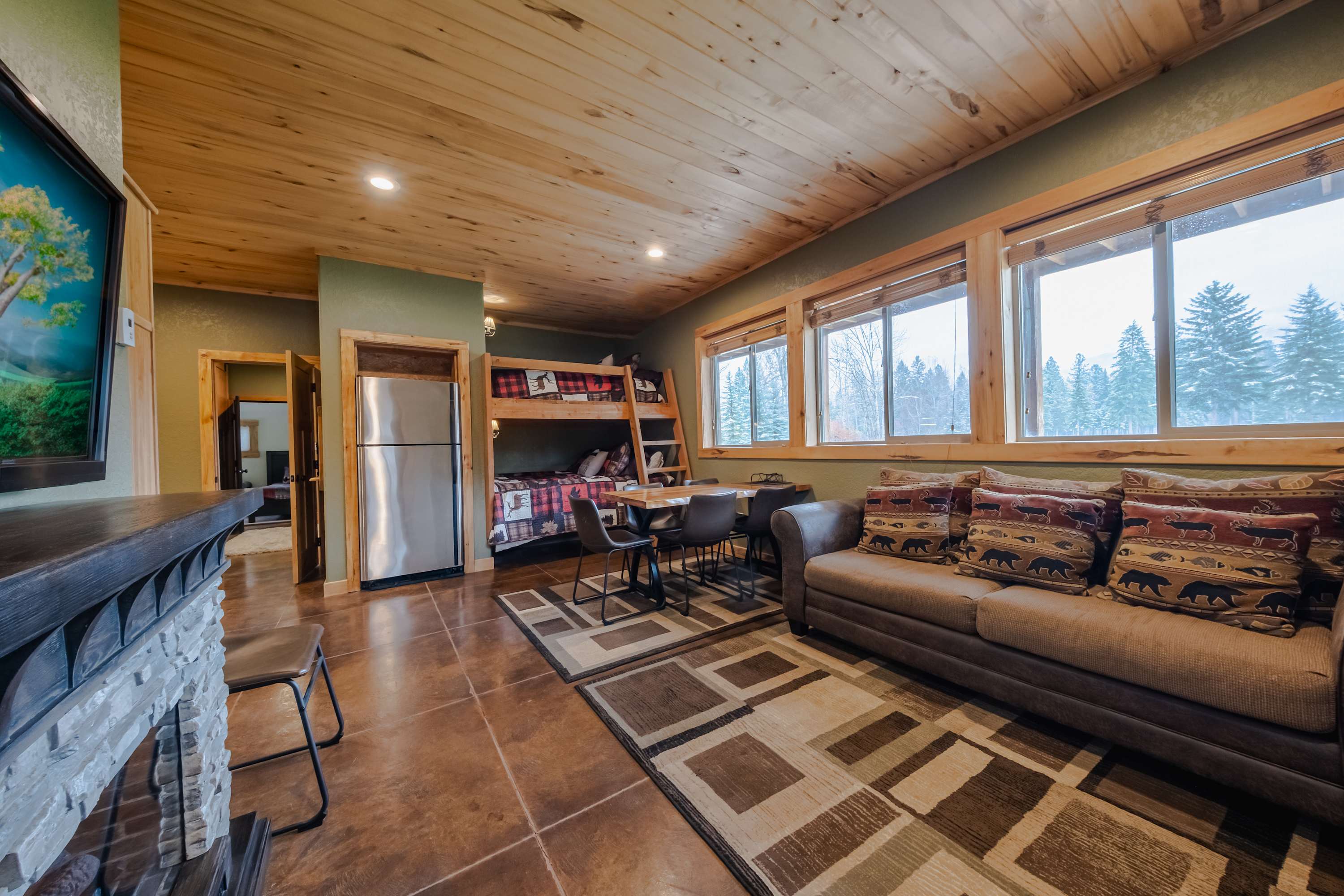 The home’s interior is fit for your crowd, offering plenty of space for everyone to spread out and find their own corner while communal spaces bring you back together for entertainment and connectivity. Soaring, wood-paneled vaulted ceilings create a cozy cabin atmosphere while floor-to-ceiling picture windows illuminate each room in bright, natural light. With two separate living spaces on the main and lower levels, each offering plush sofa seating, smart TVs, and ambient fireplaces, there will never be a need to argue over what to watch. For a quiet place to read or sneak in a quick afternoon nap, the loft has you covered.