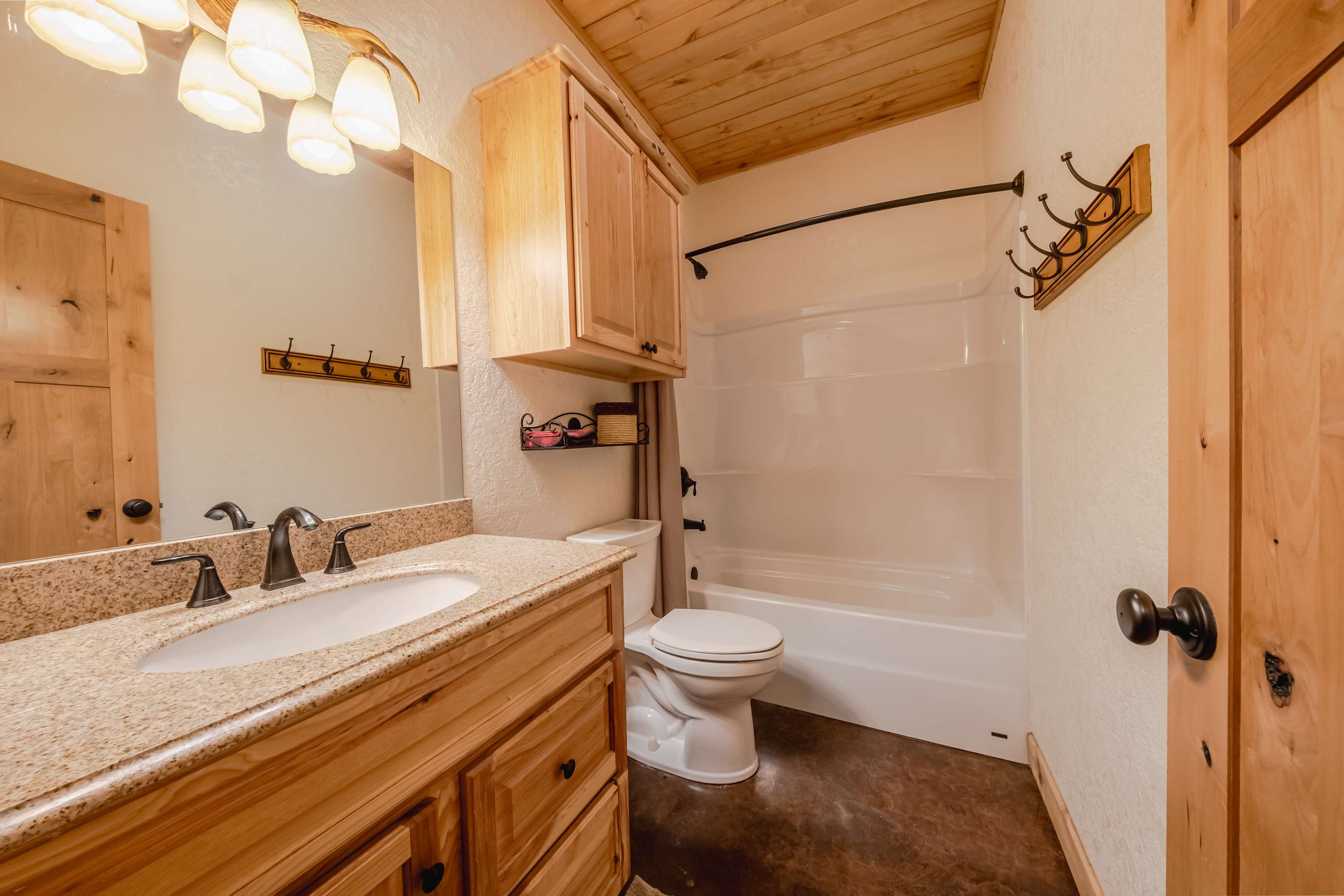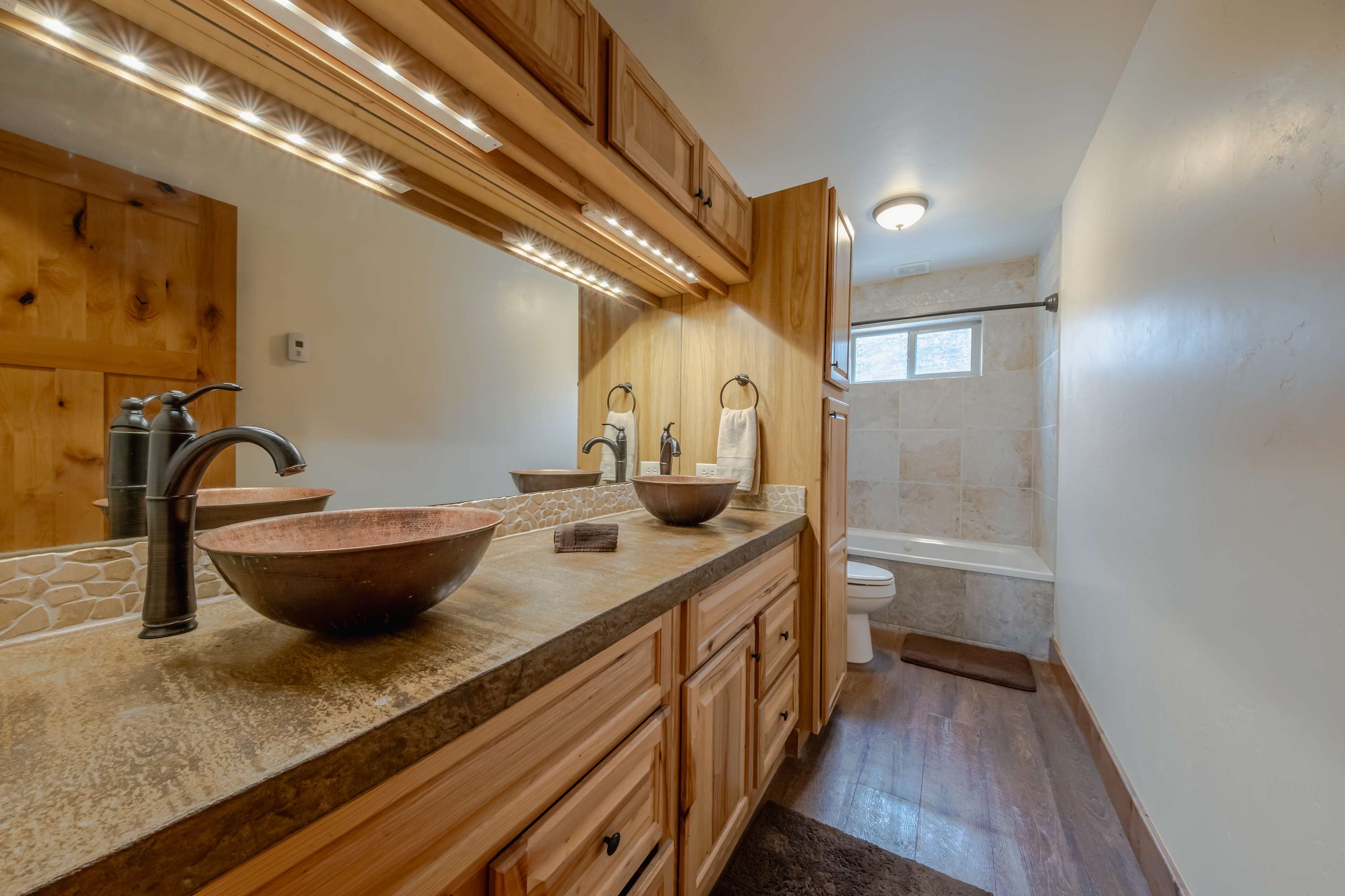The home also includes 2 full guest bathrooms, the first with a dual vanity and shower/tub combo and the second with a single vanity and shower/tub combo.