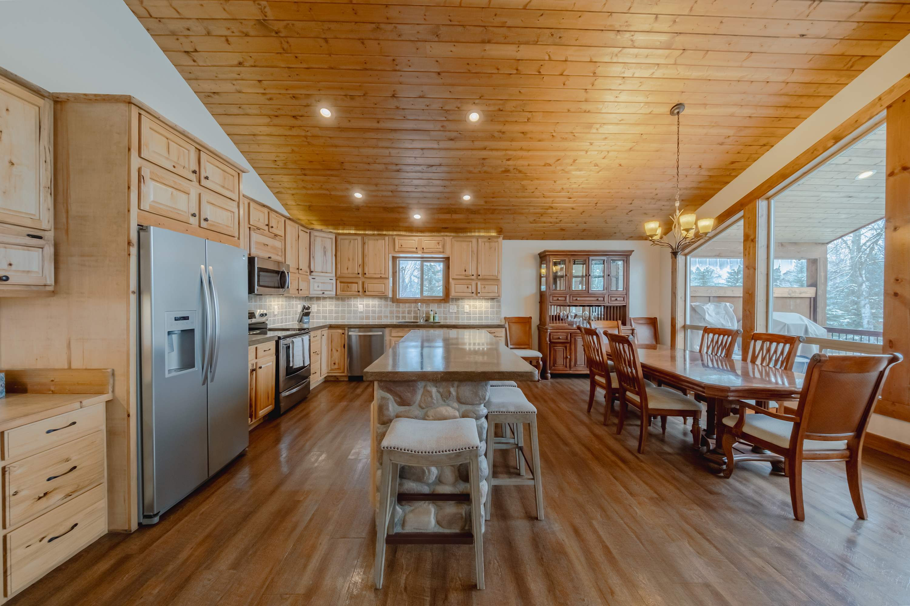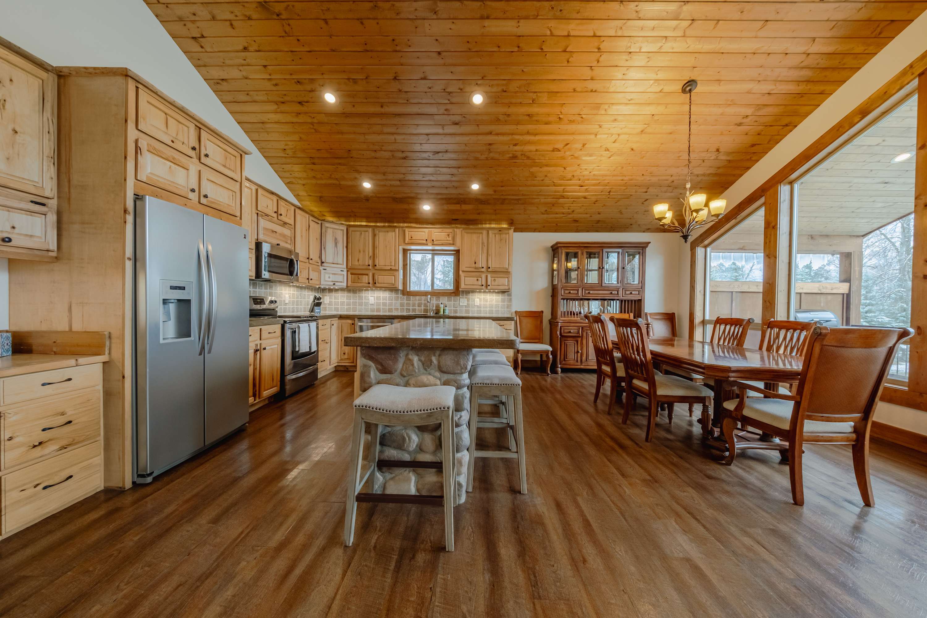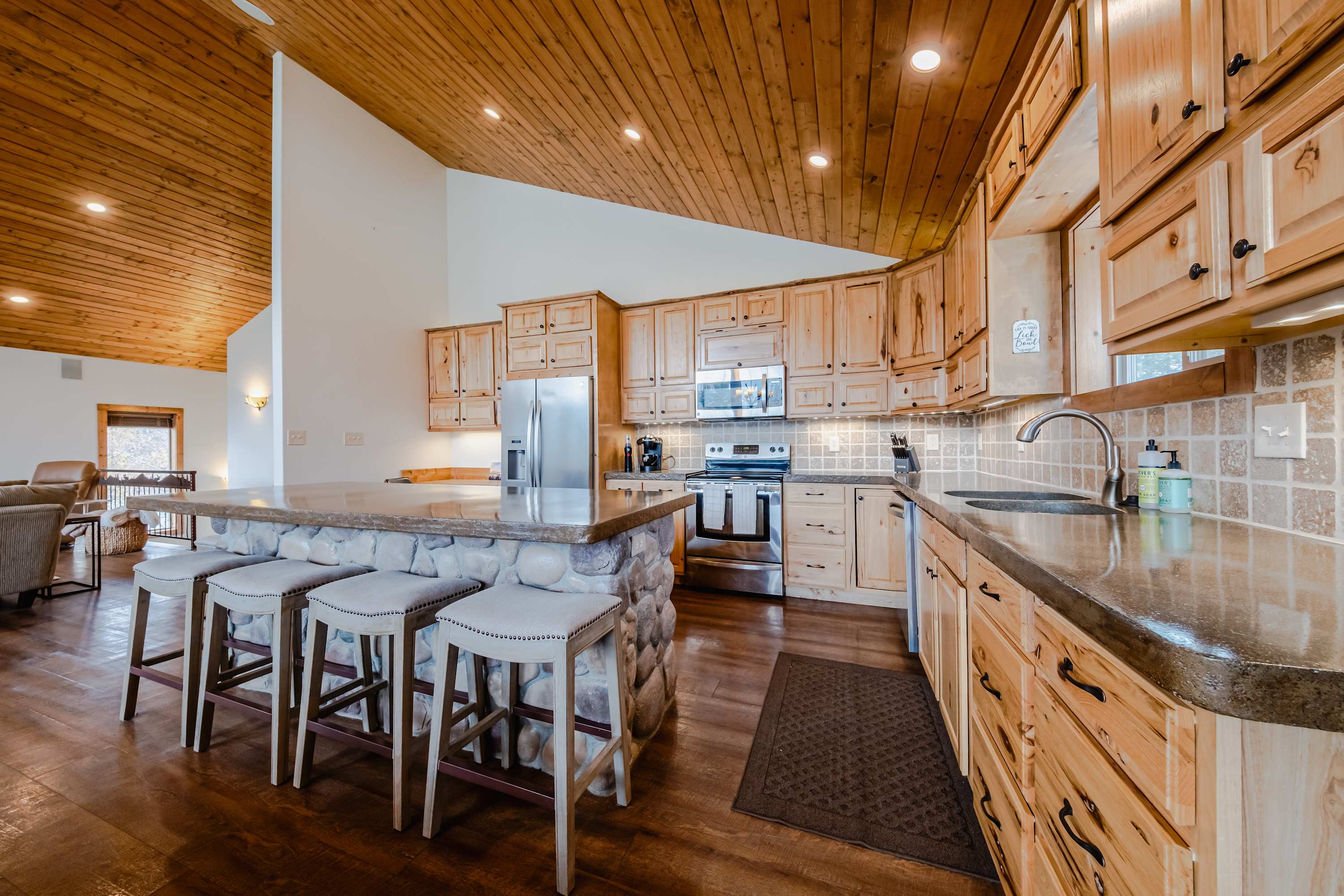 The main level’s fully equipped kitchen showcases stainless steel appliances, smooth stone countertops, and natural wood cabinetry stocked with cookware and dining ware for all your mealtime endeavors. The downstairs kitchenette can be used for storage or overflow cooking in the oven and microwave as needed. You’ll find ample dining venues between floors as well, from elegant formal dining for 6 and high-top stools for 5 alongside the main kitchen to a second dining table on the lower level, seating another 6 for meals both large and light.
