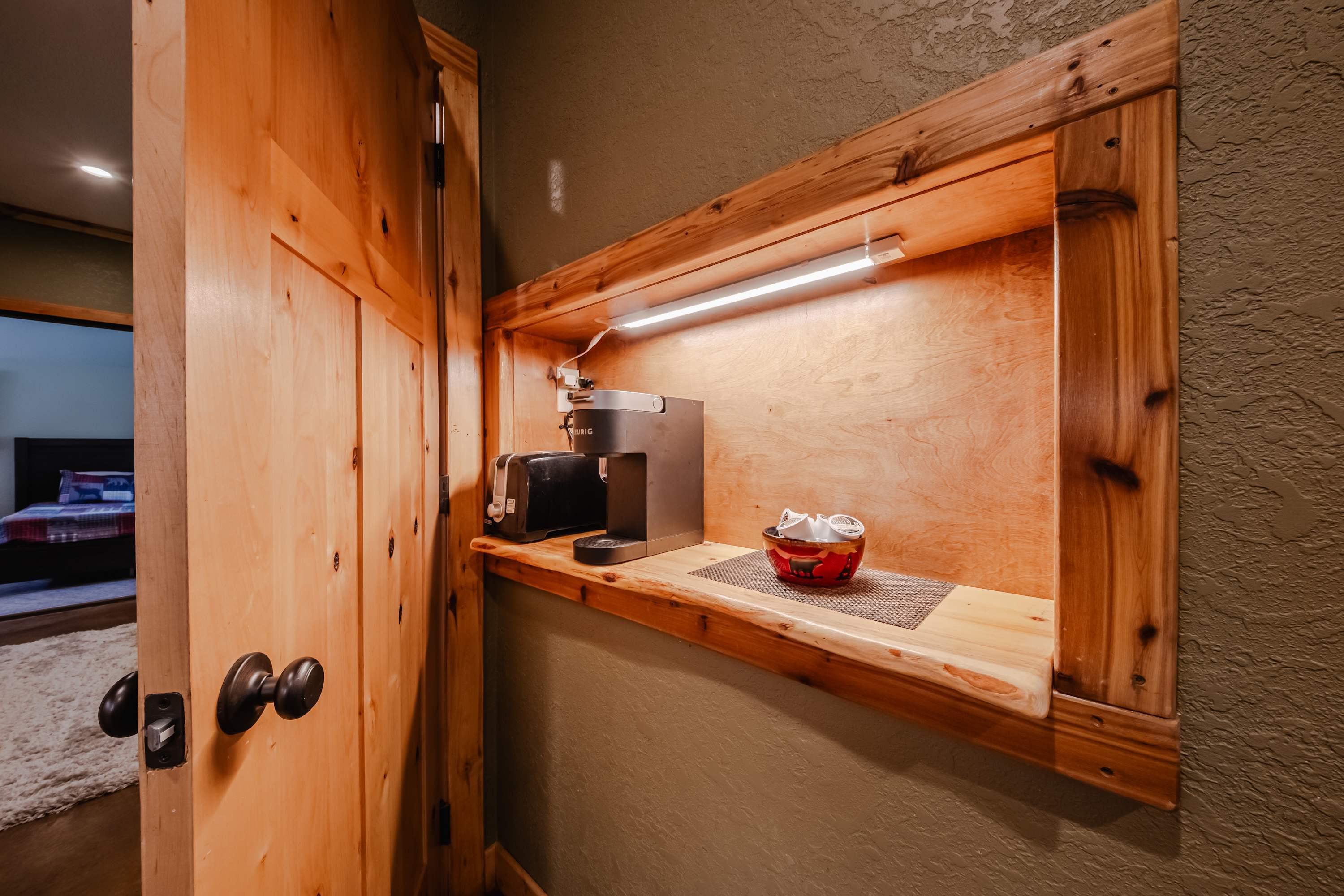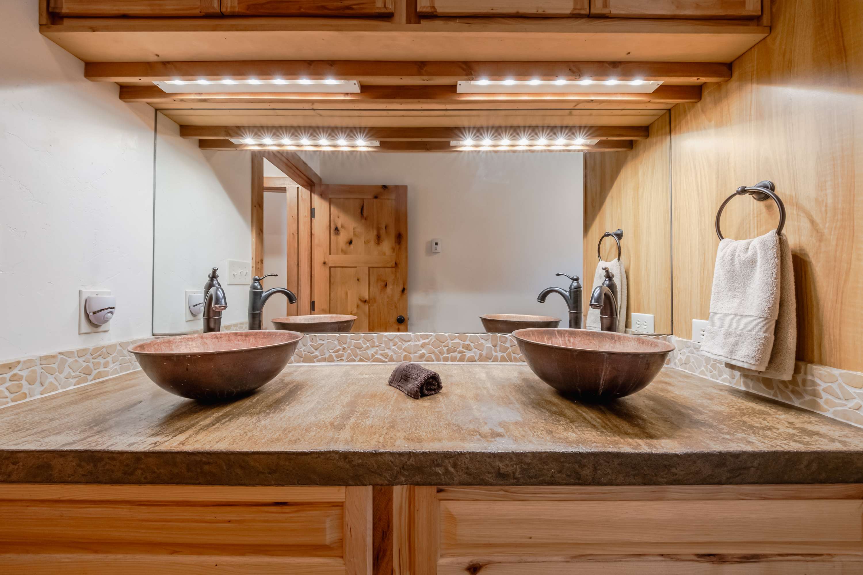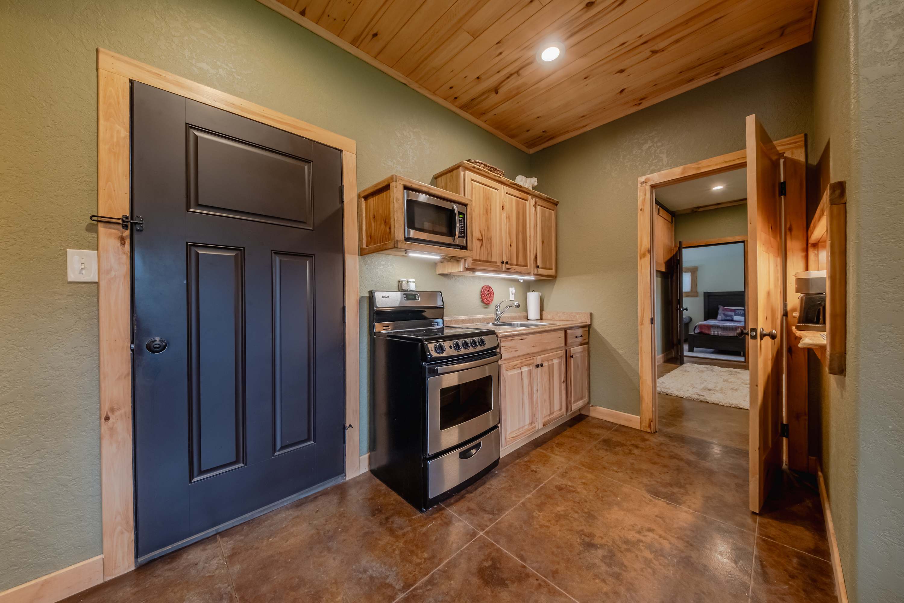 The main level’s fully equipped kitchen showcases stainless steel appliances, smooth stone countertops, and natural wood cabinetry stocked with cookware and dining ware for all your mealtime endeavors. The downstairs kitchenette can be used for storage or overflow cooking in the oven and microwave as needed. You’ll find ample dining venues between floors as well, from elegant formal dining for 6 and high-top stools for 5 alongside the main kitchen to a second dining table on the lower level, seating another 6 for meals both large and light.
