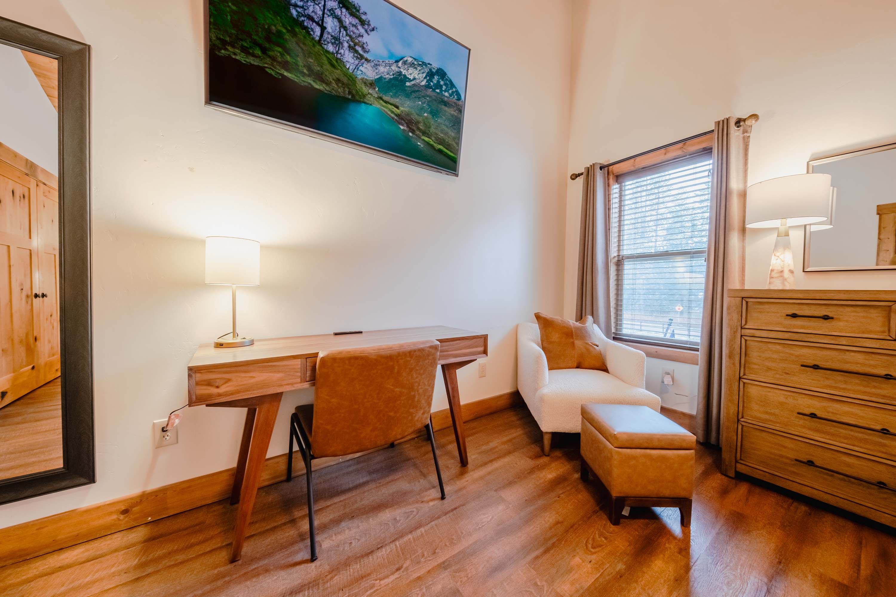 Bedroom #1 includes a king size bed, dedicated workspace, and smart TV.