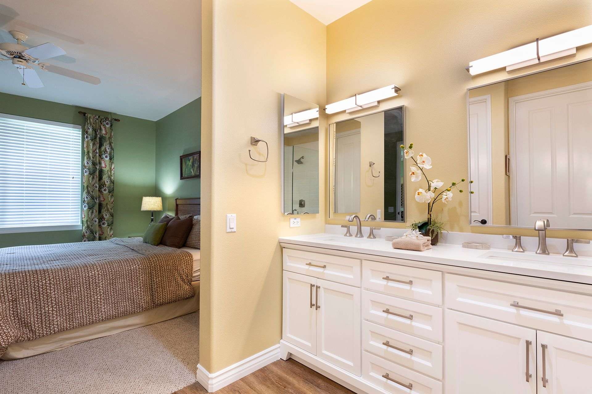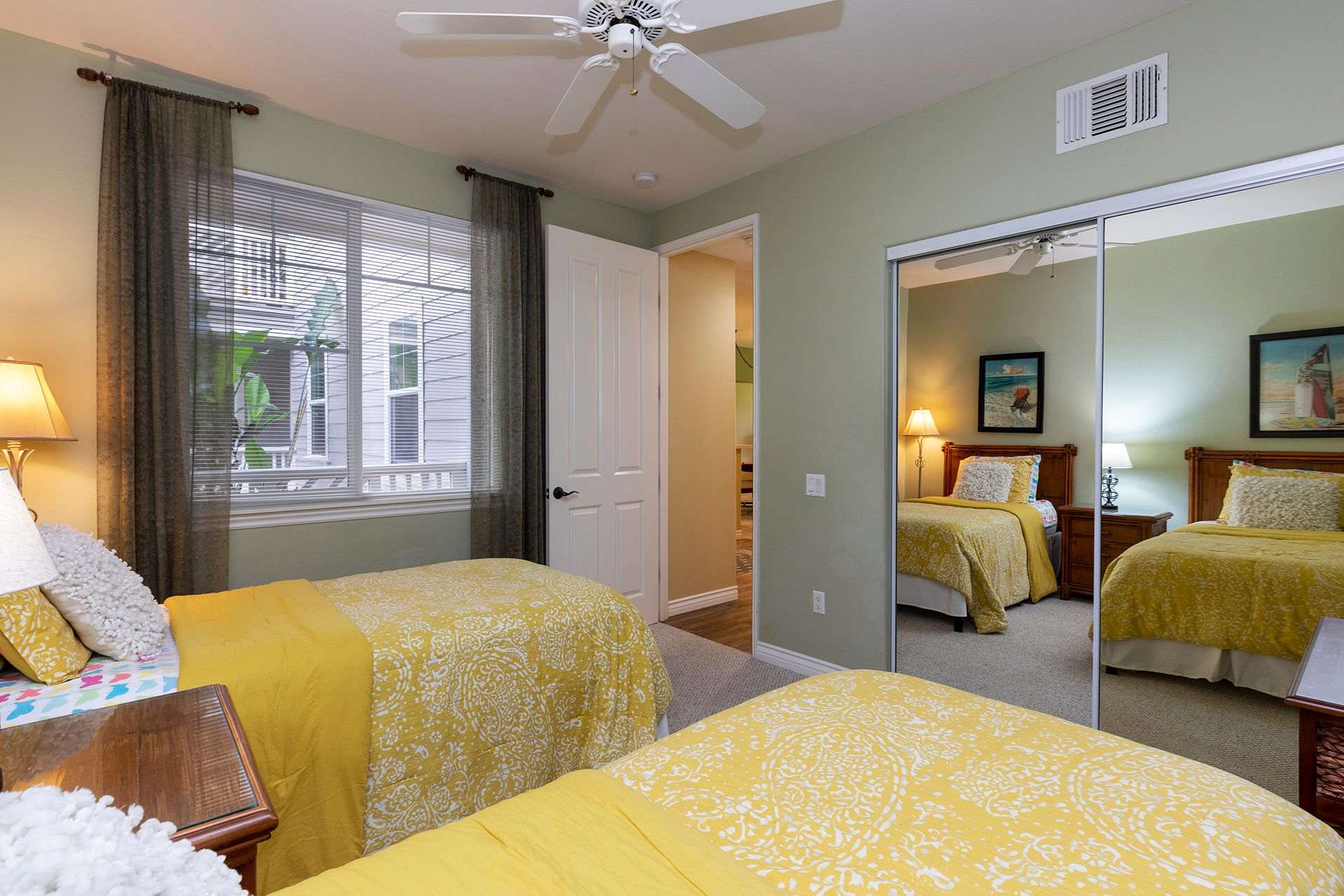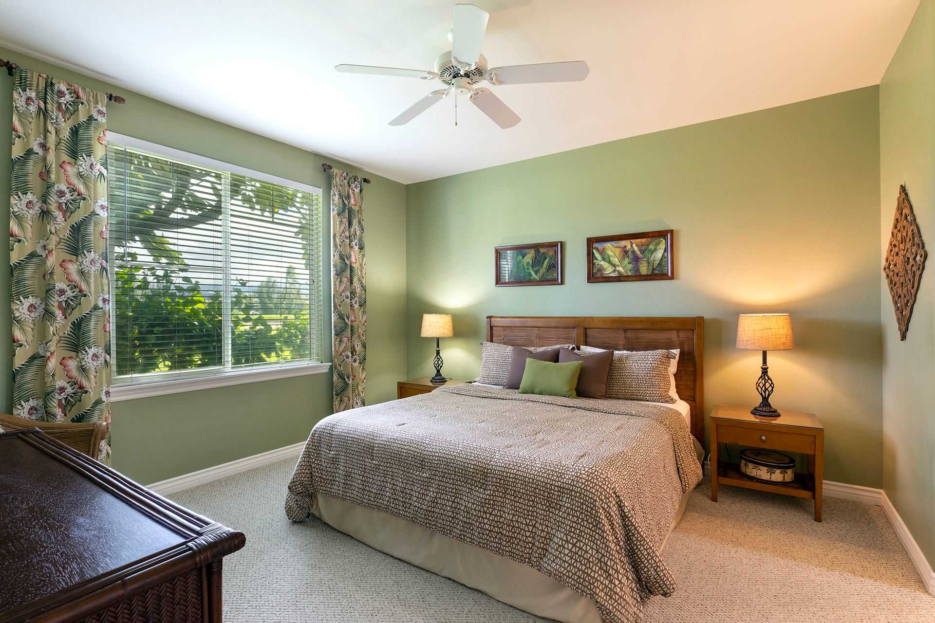 Sleeping for up to four guests between the two bedrooms. The master bedroom is furnished with a luxurious King-sized bed, ceiling fan, TV, and private bathroom. Your mornings will be tranquil as you get ready in the master bathroom by taking a soak in the garden bathtub. There is also a standalone shower and dual sinks. The guest bedroom is perfect for housing the kids. There are two Twin-sized beds, a ceiling fan, and TV. The guest bathroom has a shower/tub combo and spacious vanity.