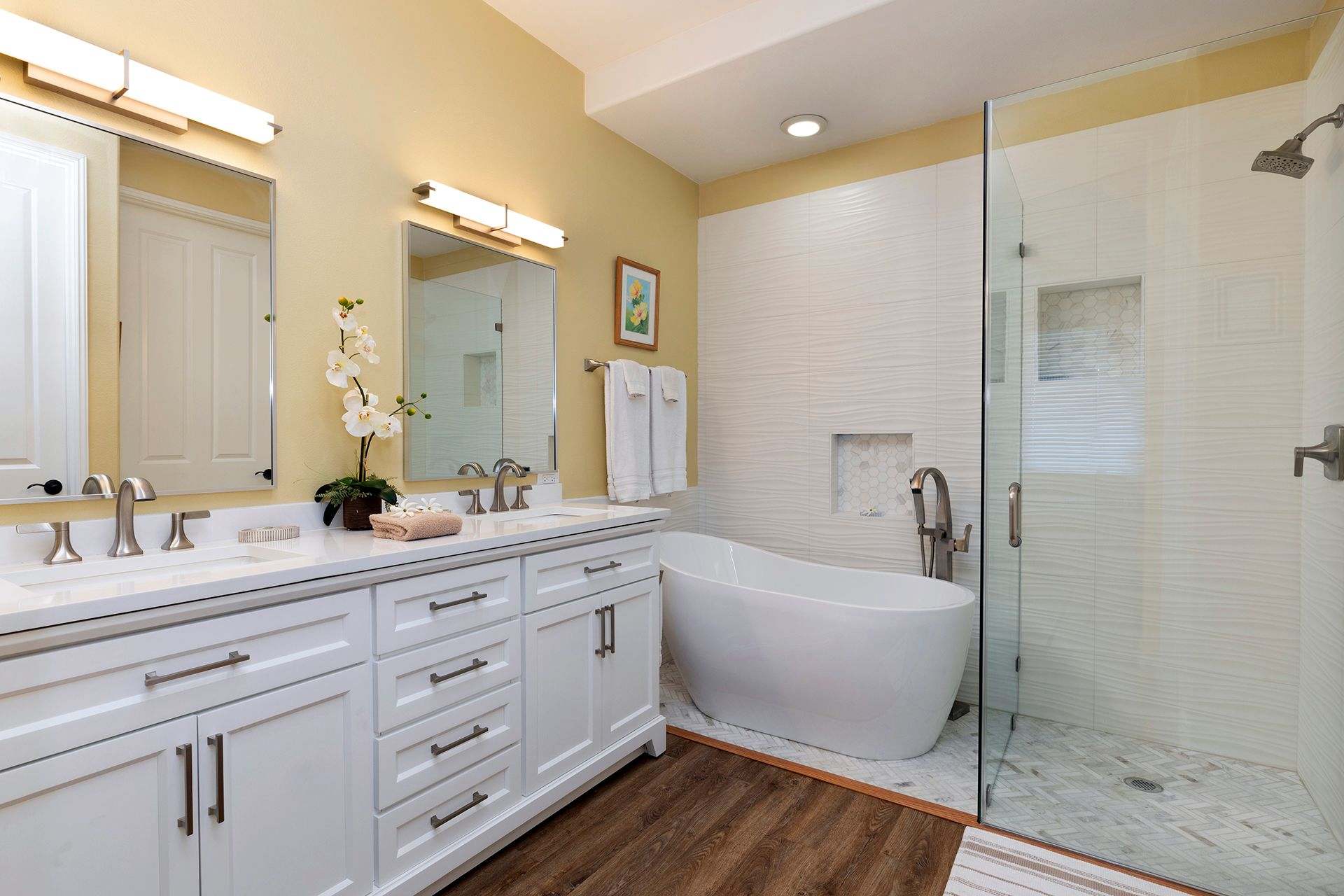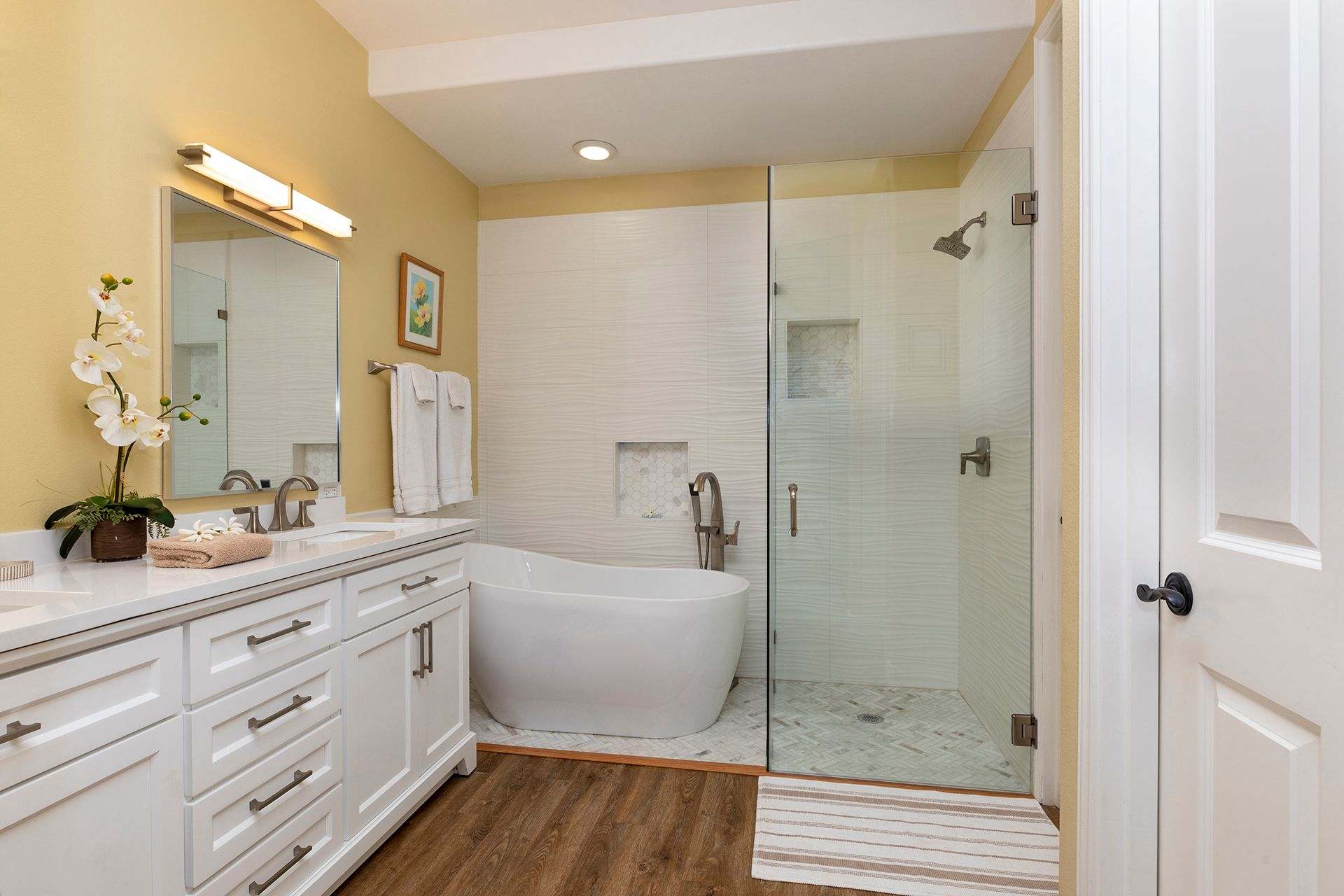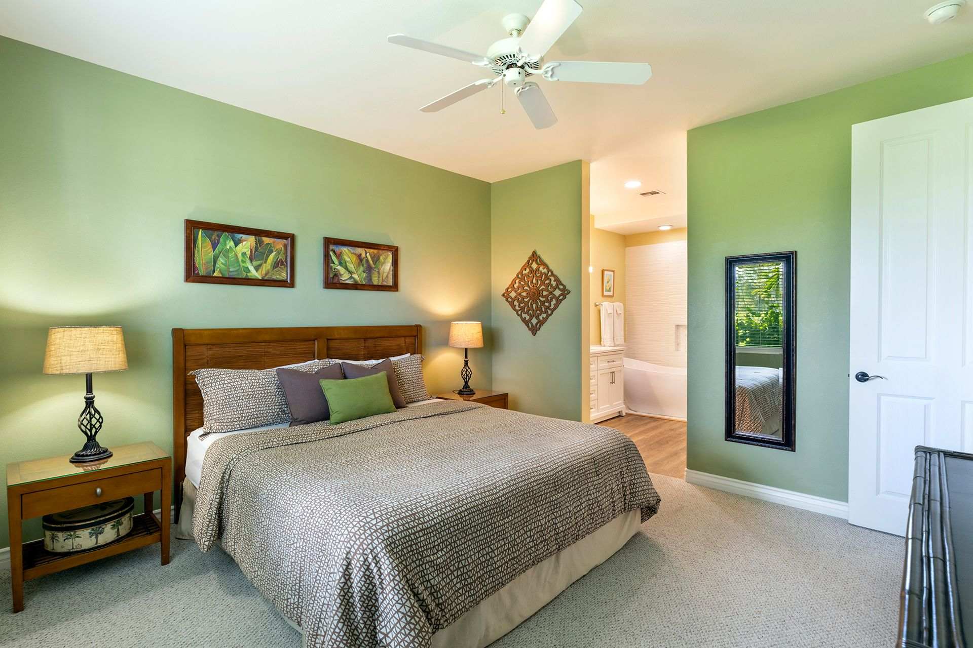 Sleeping for up to four guests between the two bedrooms. The master bedroom is furnished with a luxurious King-sized bed, ceiling fan, TV, and private bathroom. Your mornings will be tranquil as you get ready in the master bathroom by taking a soak in the garden bathtub. There is also a standalone shower and dual sinks. The guest bedroom is perfect for housing the kids. There are two Twin-sized beds, a ceiling fan, and TV. The guest bathroom has a shower/tub combo and spacious vanity.