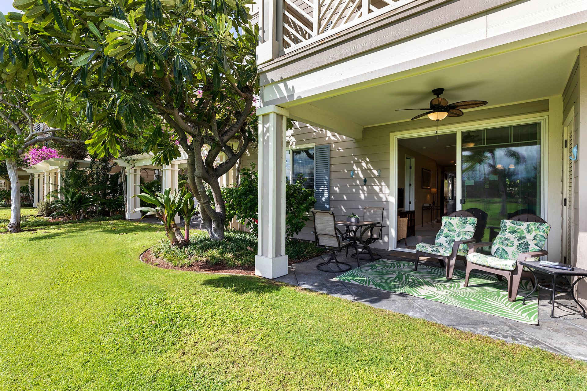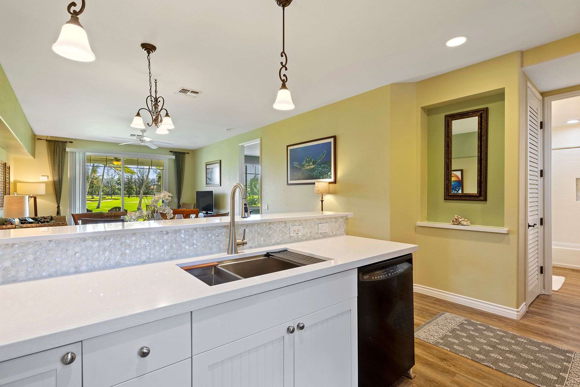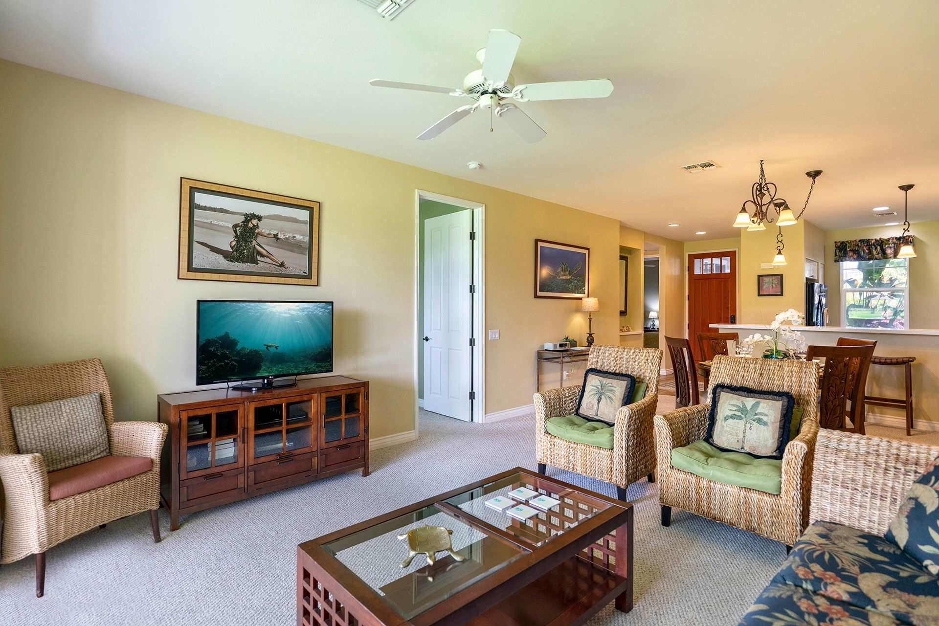 Enter the home to be welcomed by a bright open floor plan. Connected are the kitchen, dining area, living room, and lanai. The kitchen is on your left, fully-equipped with upgraded black appliances and granite countertops. Seating for two is arranged at the built-in breakfast bar creating additional dining space and a way for guests to keep the chef company. Set your meals down at the formal dining table with seating for four to enjoy a home cooked dinner with all your guests. Alternatively, dine alfresco and enjoy the coastal breezes outside. A patio table and chairs are arranged for you to eat and sip on a Mai Tai while you watch the sunset over the lush golf course.