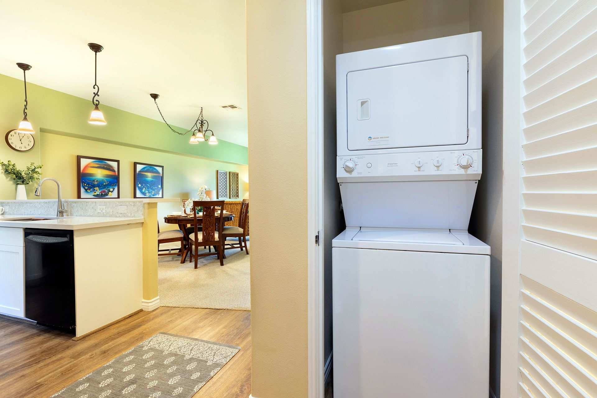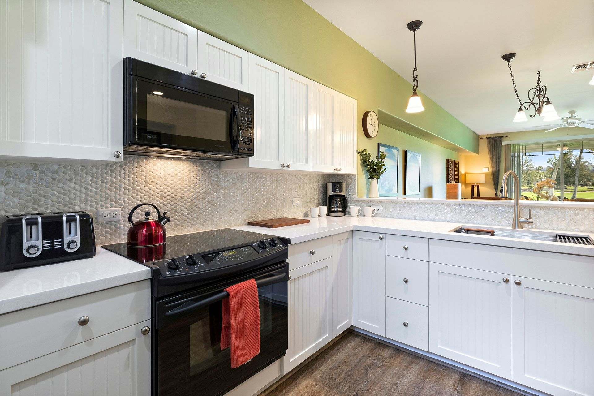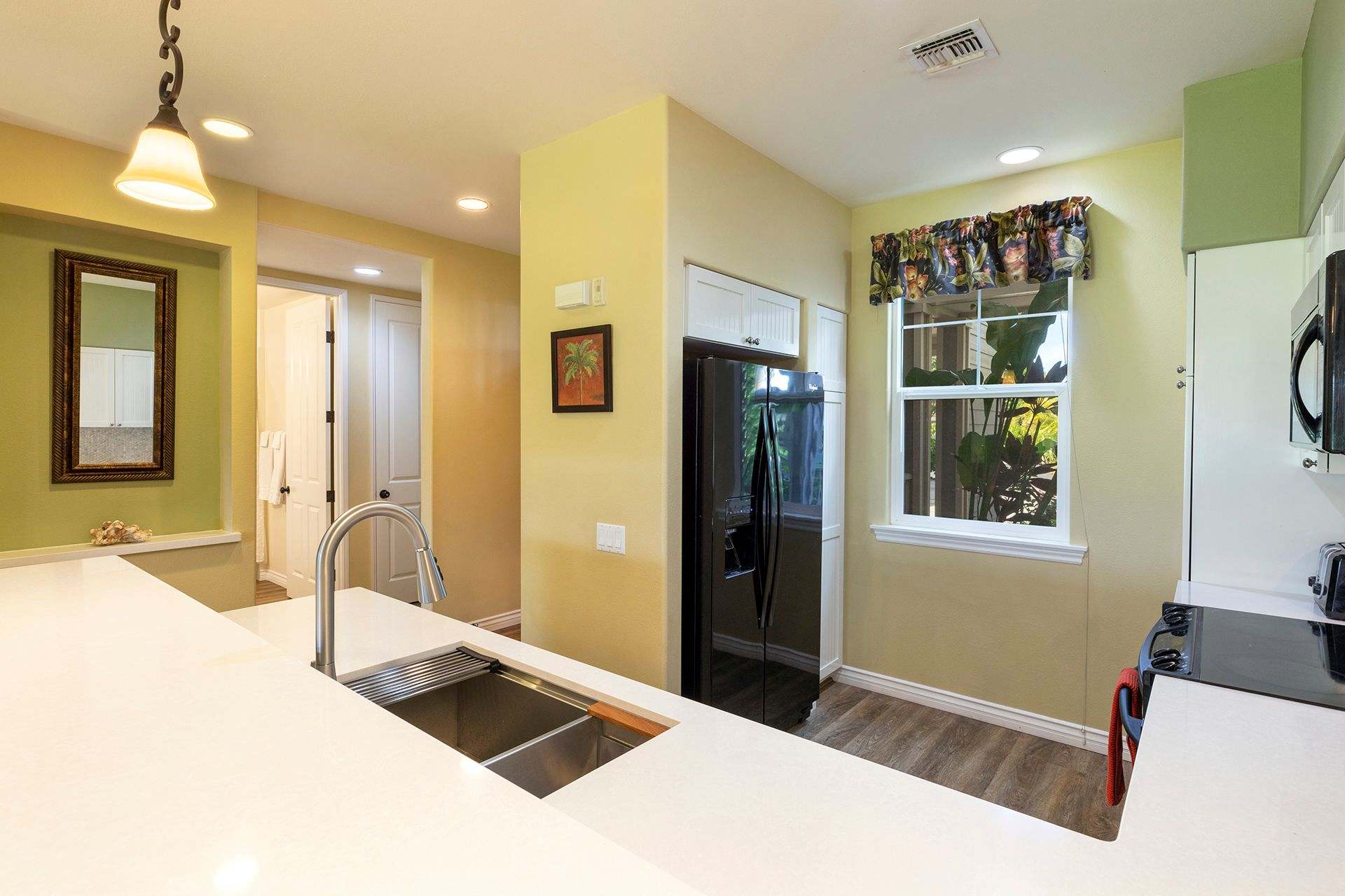 Enter the home to be welcomed by a bright open floor plan. Connected are the kitchen, dining area, living room, and lanai. The kitchen is on your left, fully-equipped with upgraded black appliances and granite countertops. Seating for two is arranged at the built-in breakfast bar creating additional dining space and a way for guests to keep the chef company. Set your meals down at the formal dining table with seating for four to enjoy a home cooked dinner with all your guests. Alternatively, dine alfresco and enjoy the coastal breezes outside. A patio table and chairs are arranged for you to eat and sip on a Mai Tai while you watch the sunset over the lush golf course.