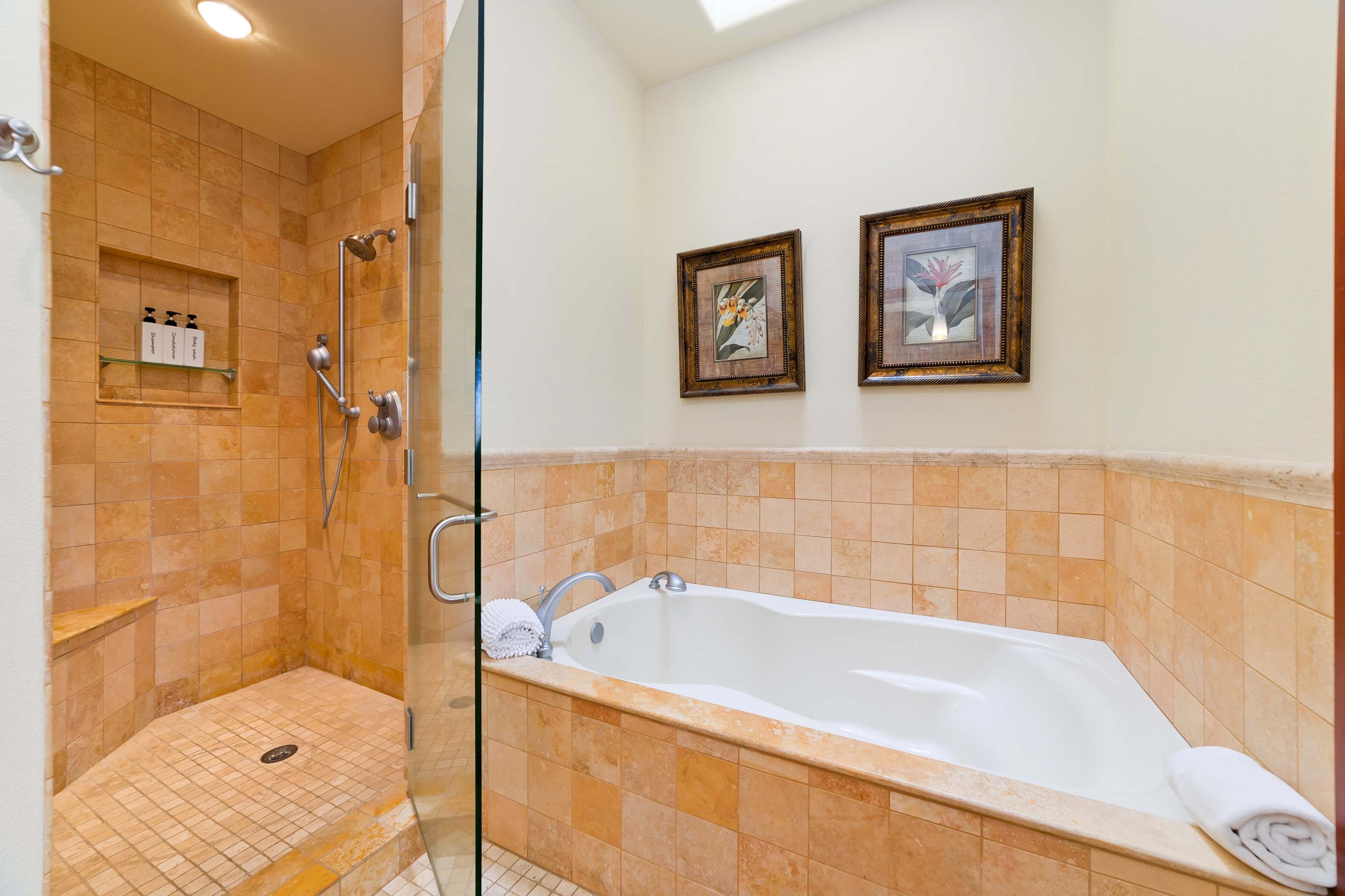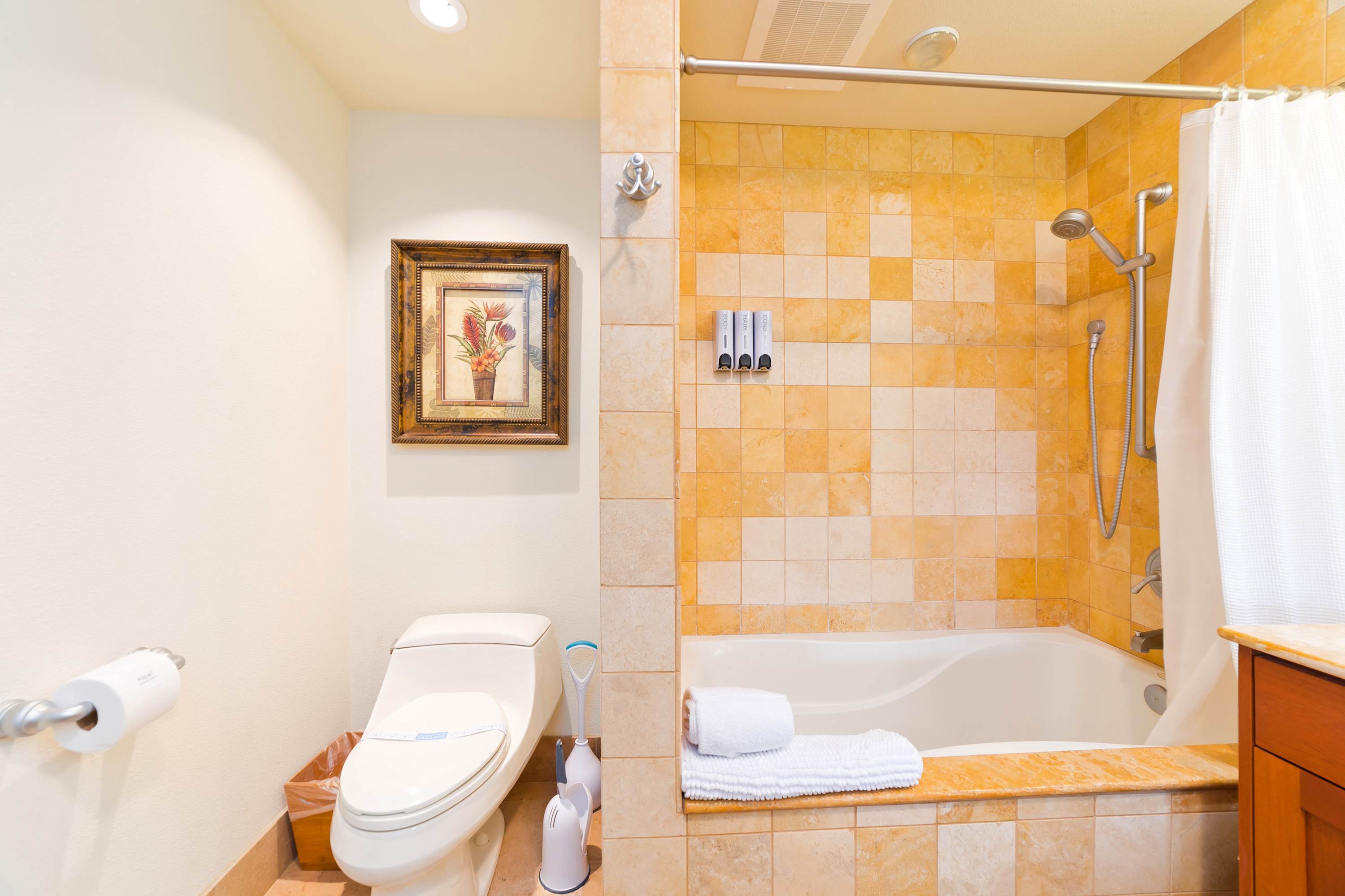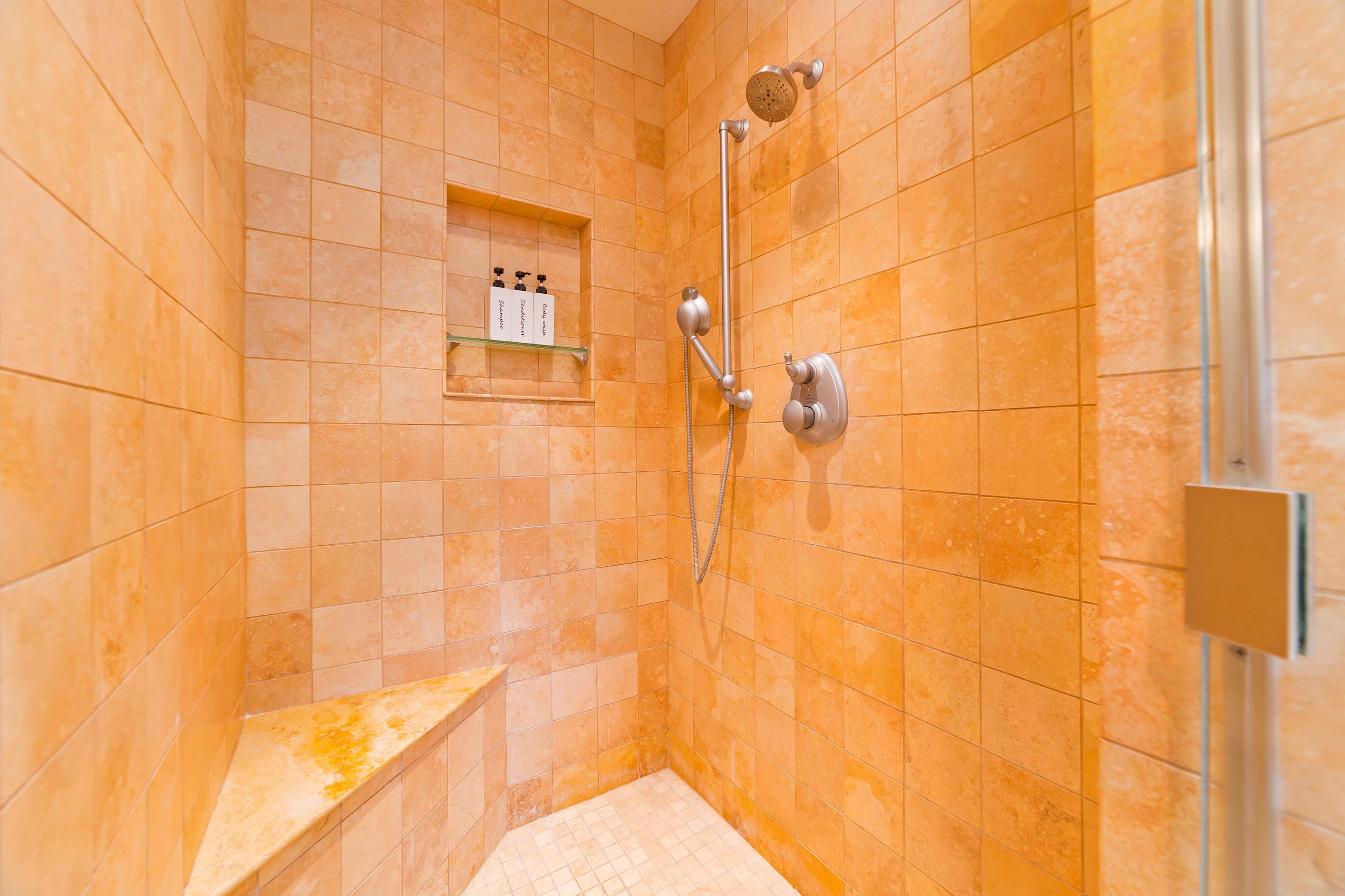 The master bedroom has a luxurious California King-sized bed, TV, and an attached bathroom. The master bathroom has a Jacuzzi tub, ideal for relaxing, a standalone shower, and vanity. The second bedroom is suitable for accommodating the kids as it has two Twin-sized beds and a TV. The guest bathroom has a shower/tub combo.