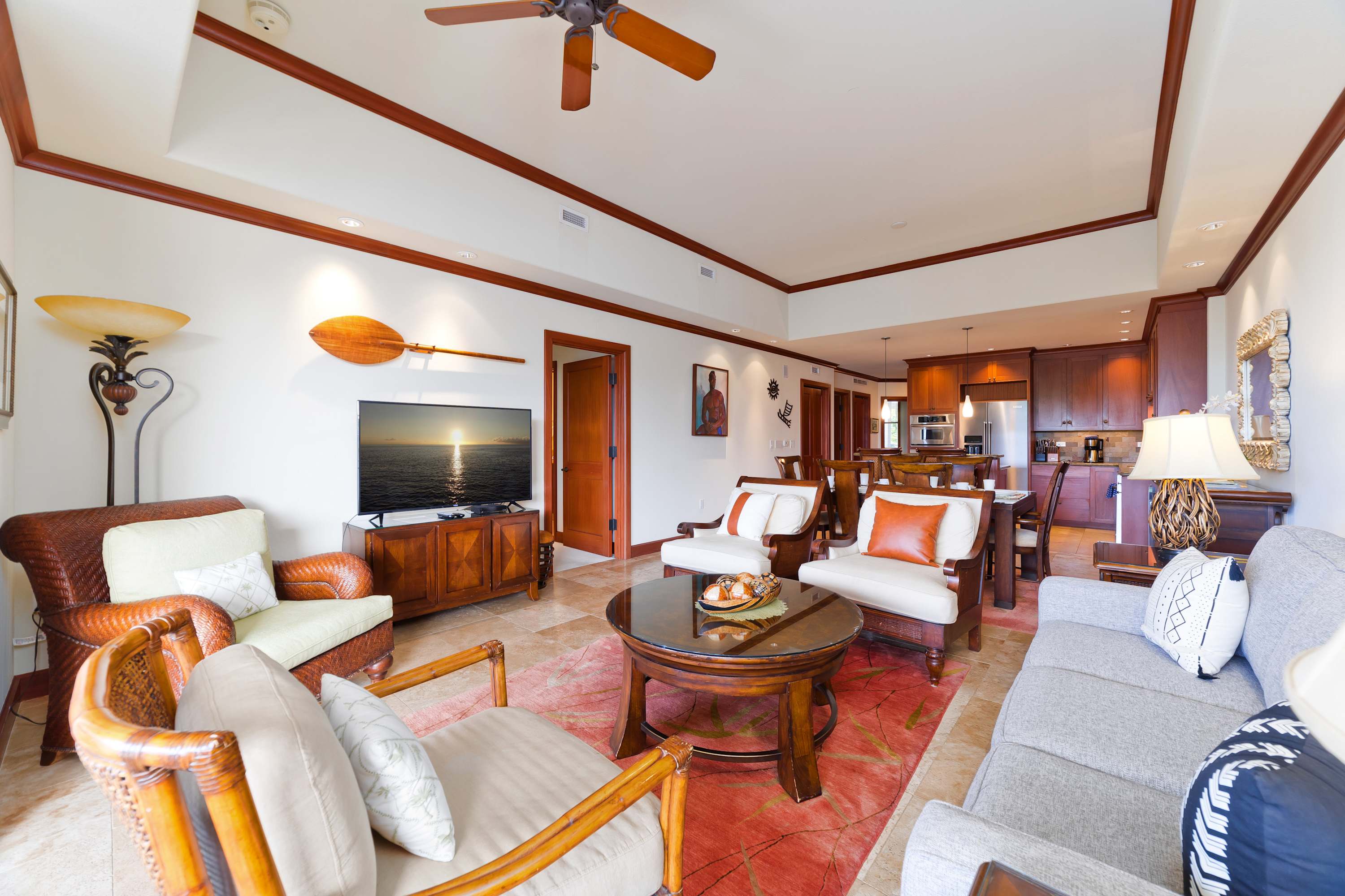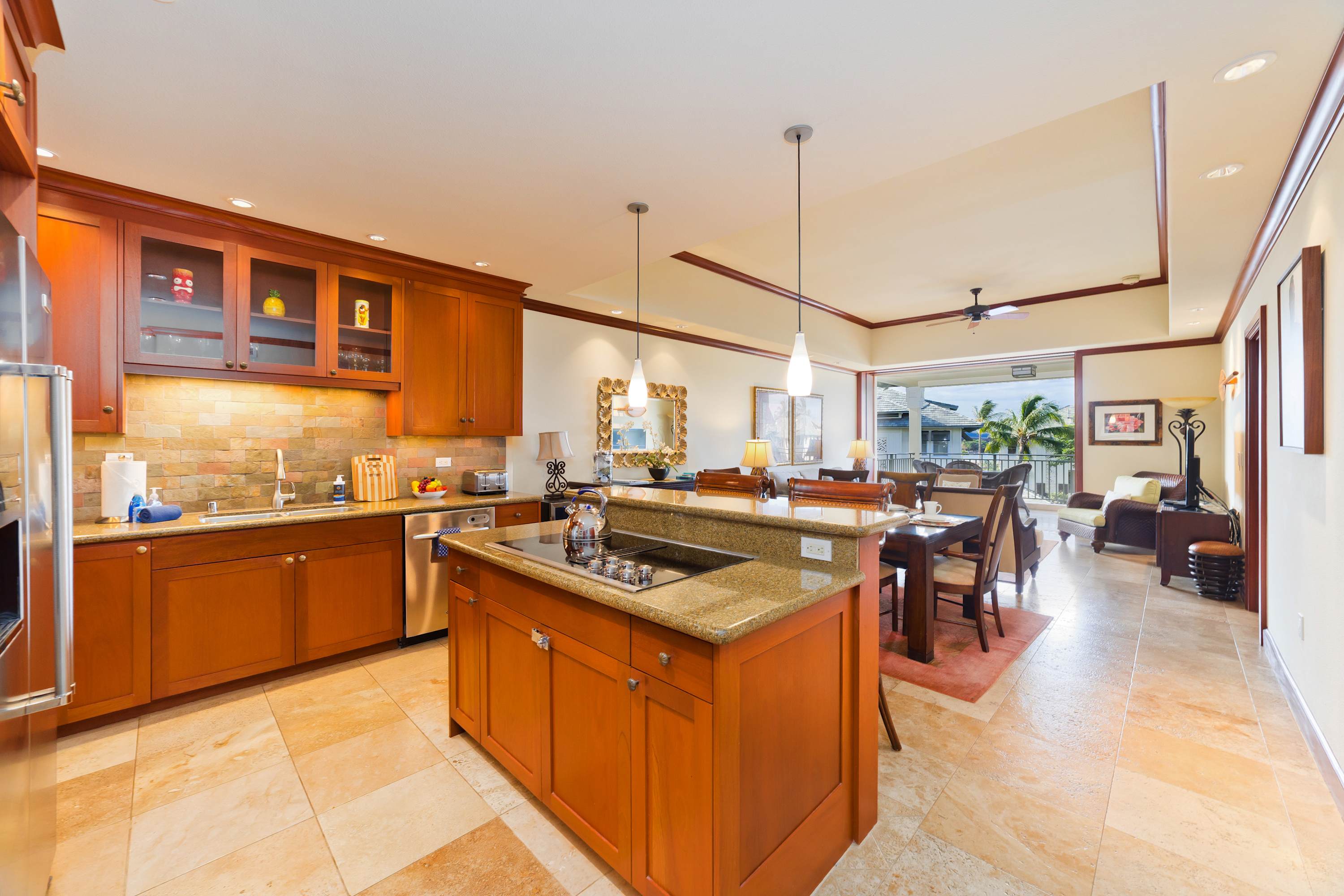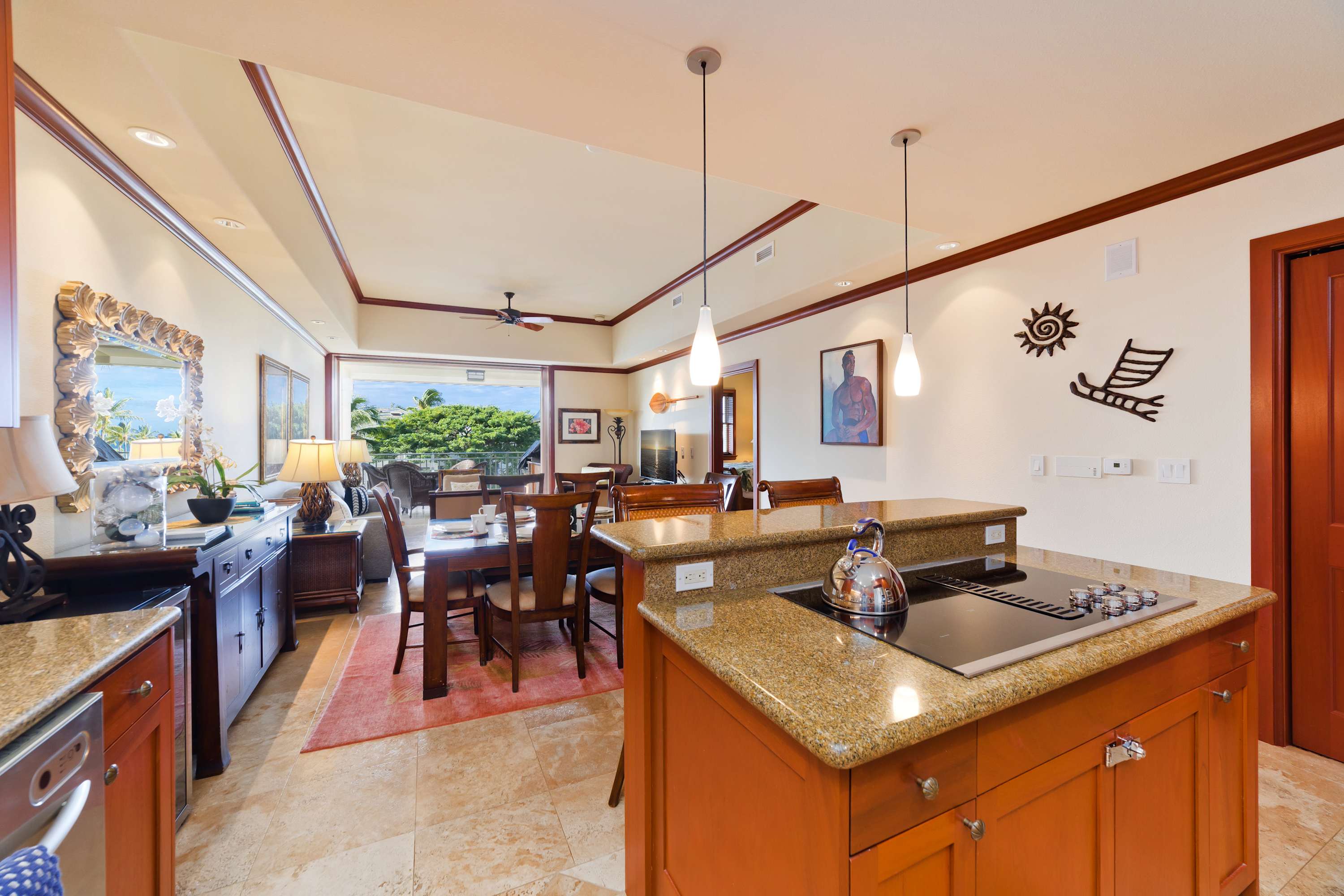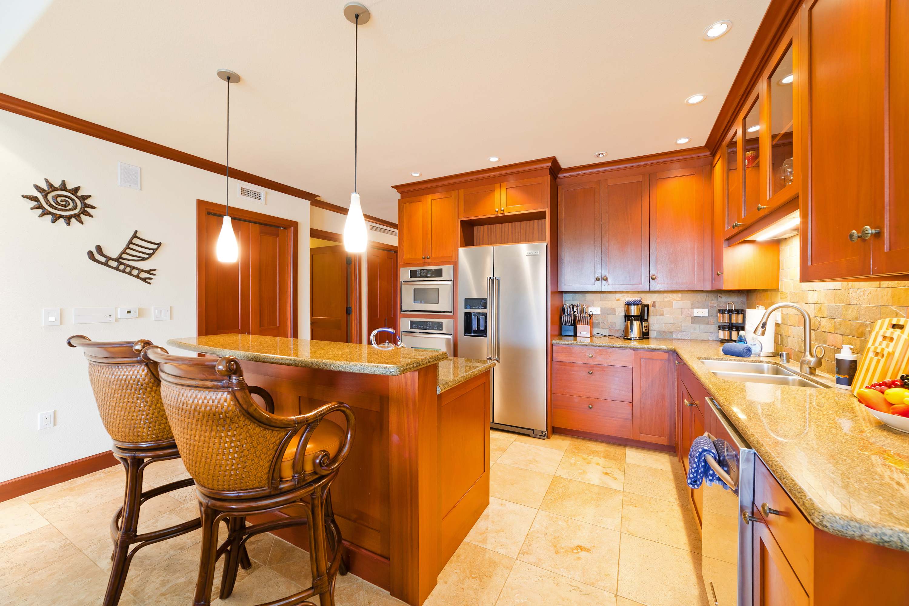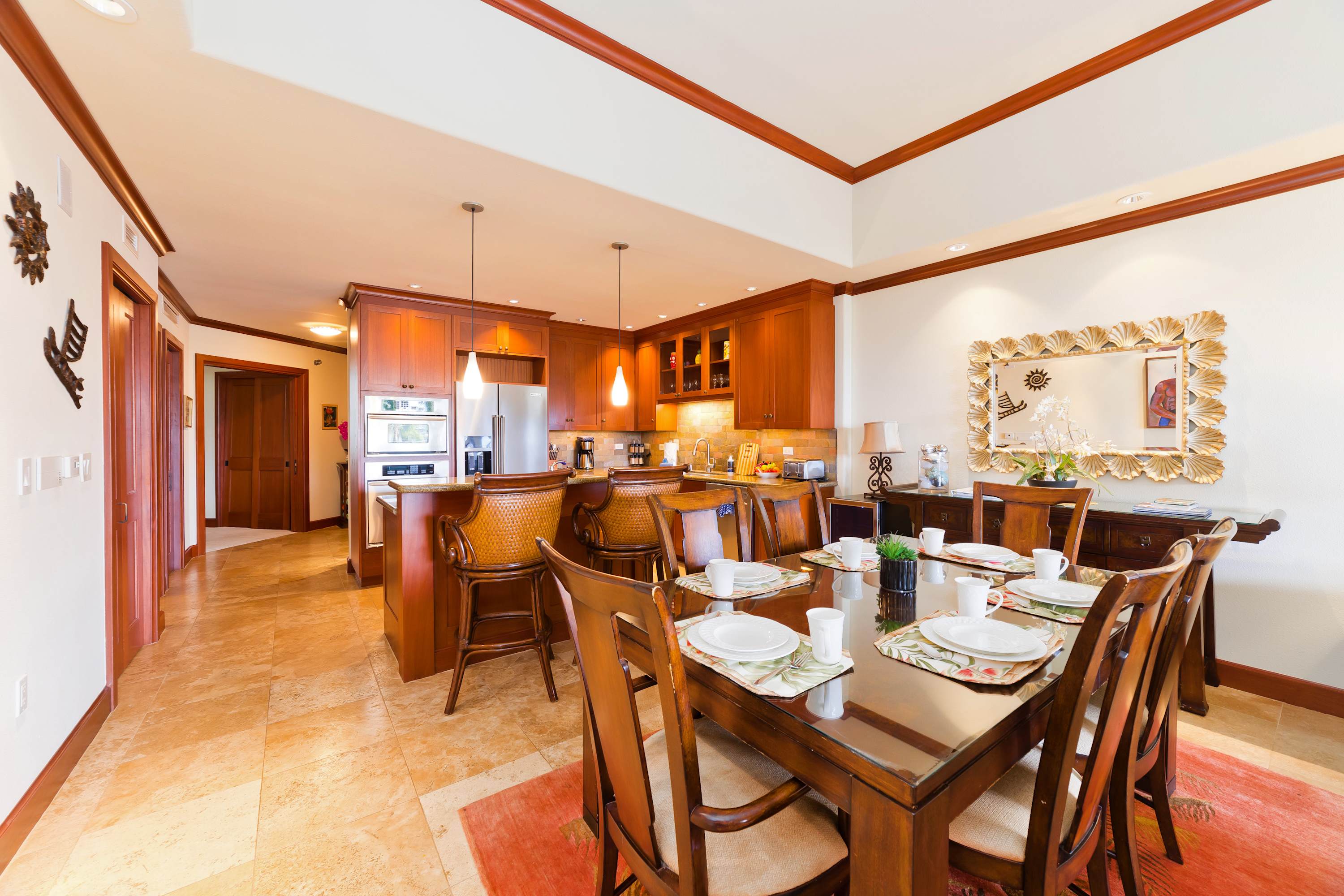 Each room features modern and island decor creating a Hawaiian atmosphere. The gourmet kitchen has everything a chef could need. Stainless steel appliances and ample granite countertops are prepared for home cooking. 2 guests can enjoy sitting at the built-in breakfast bar. Call everyone to the dining table with seating for 6 to enjoy a meal together.