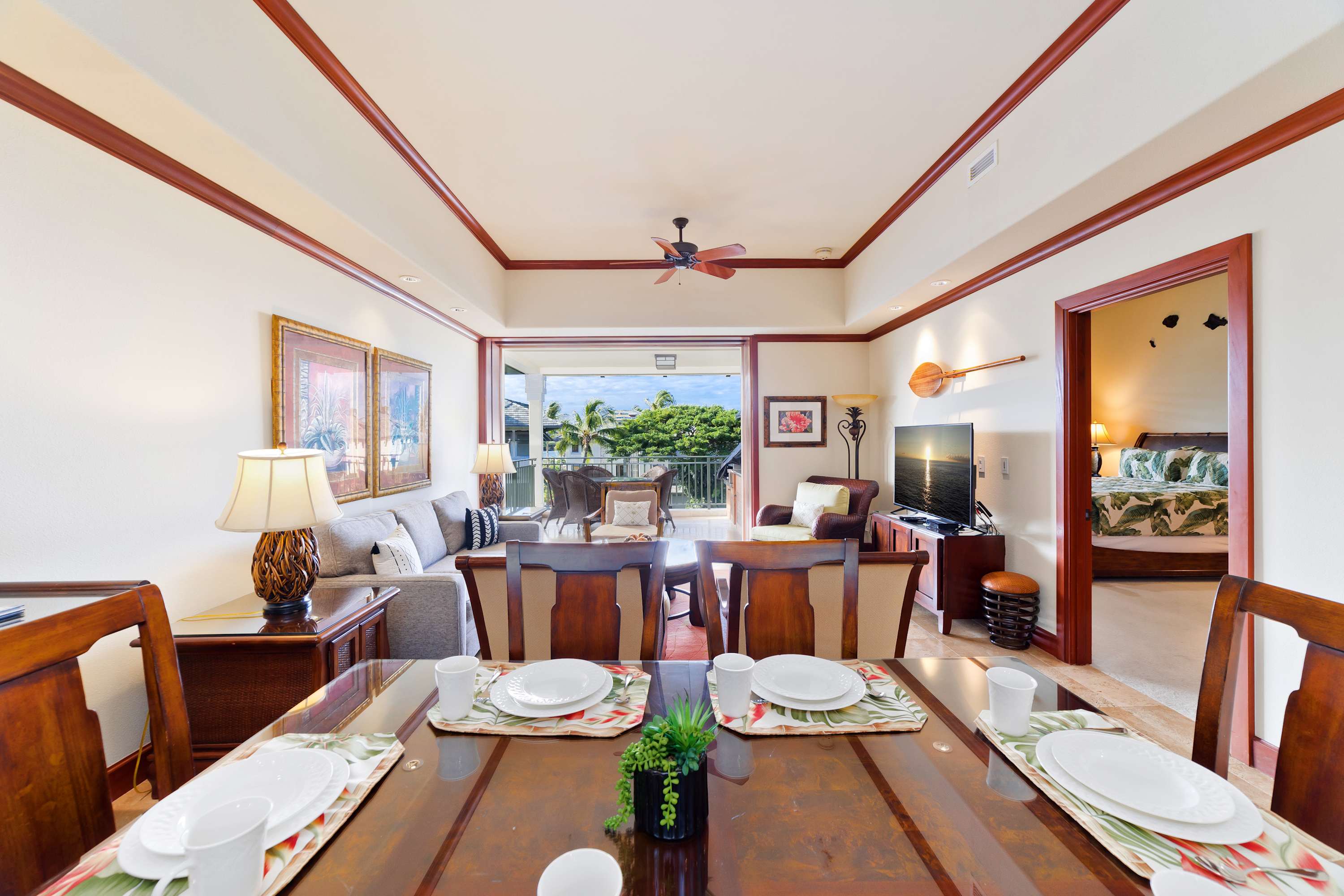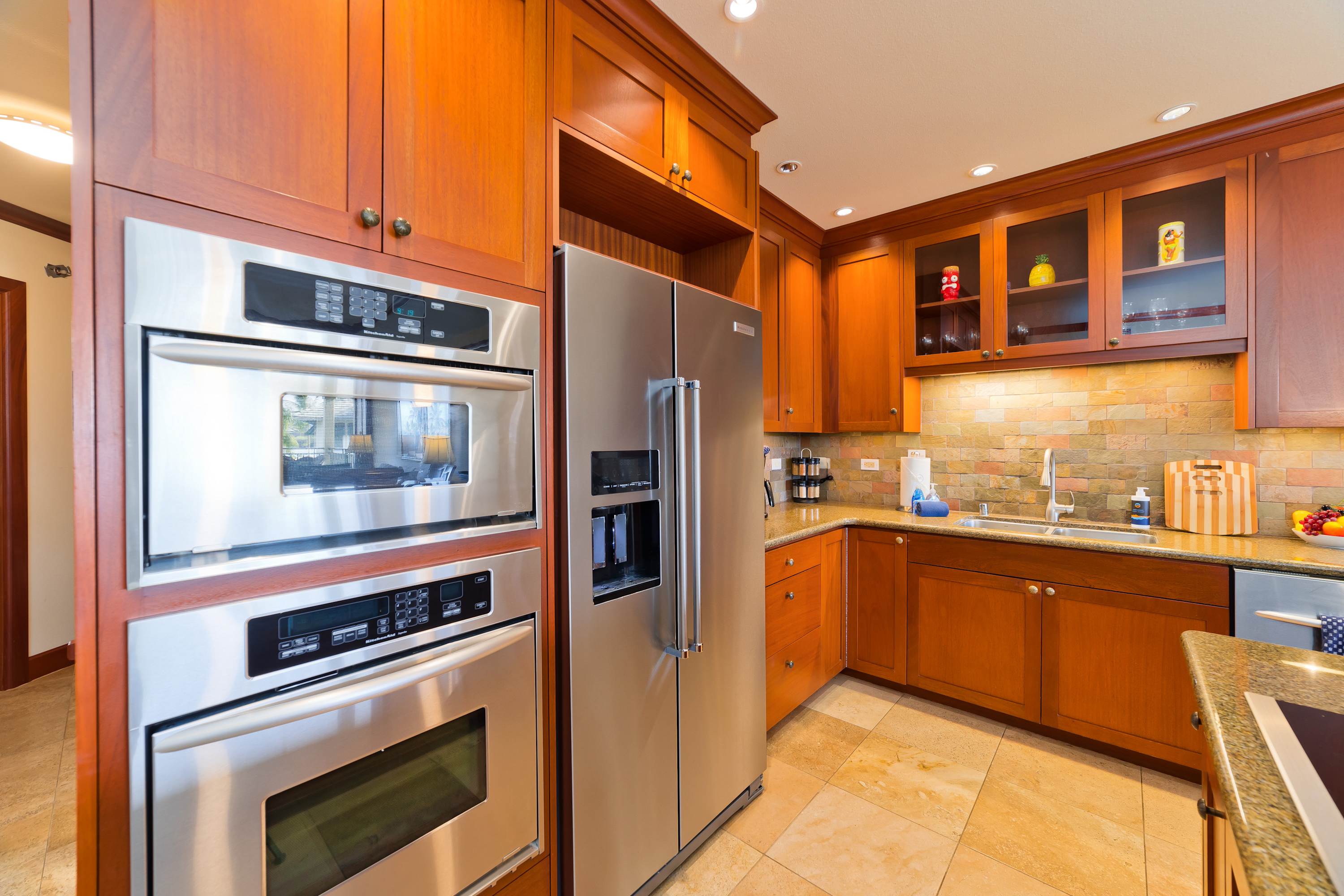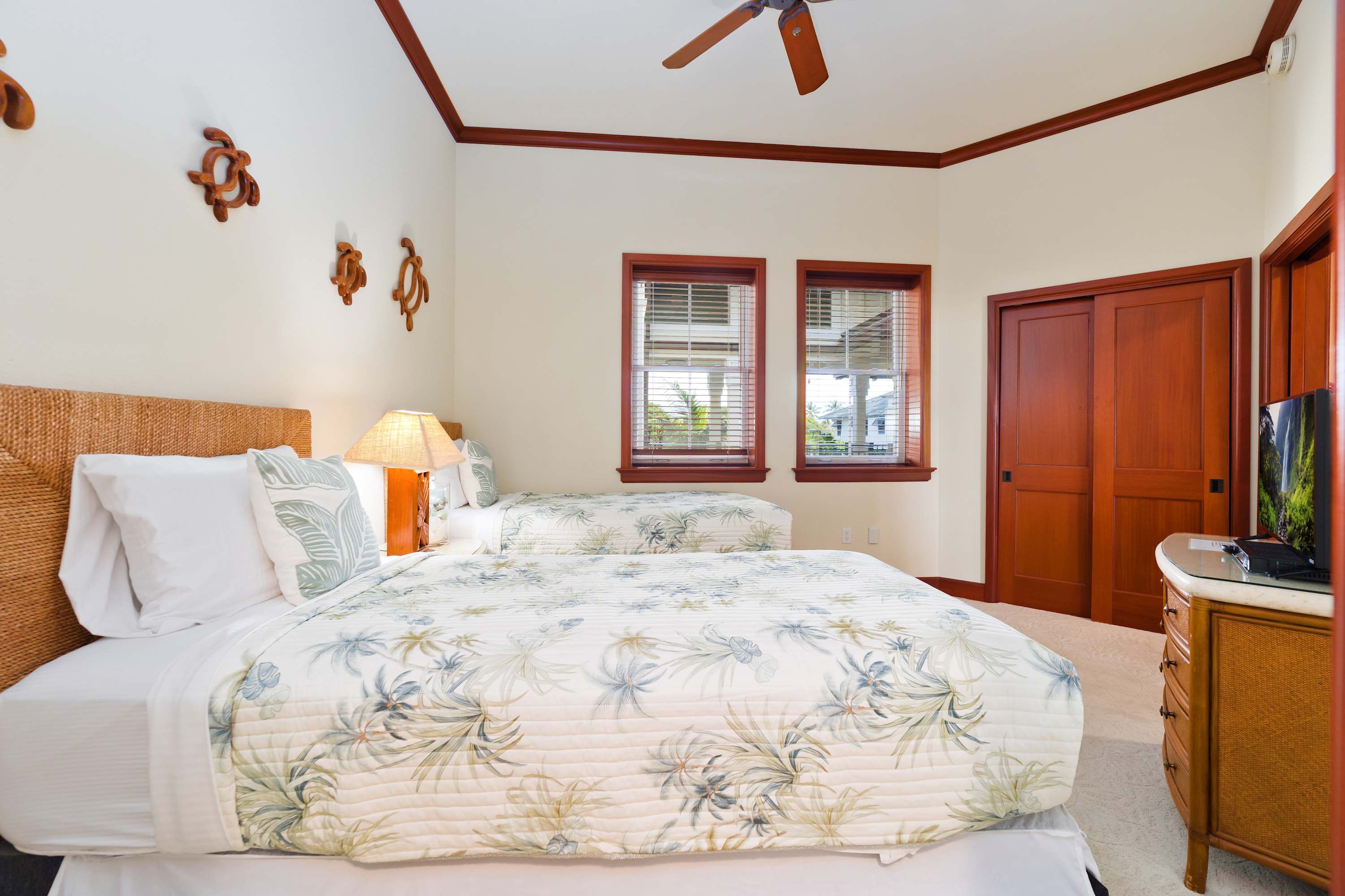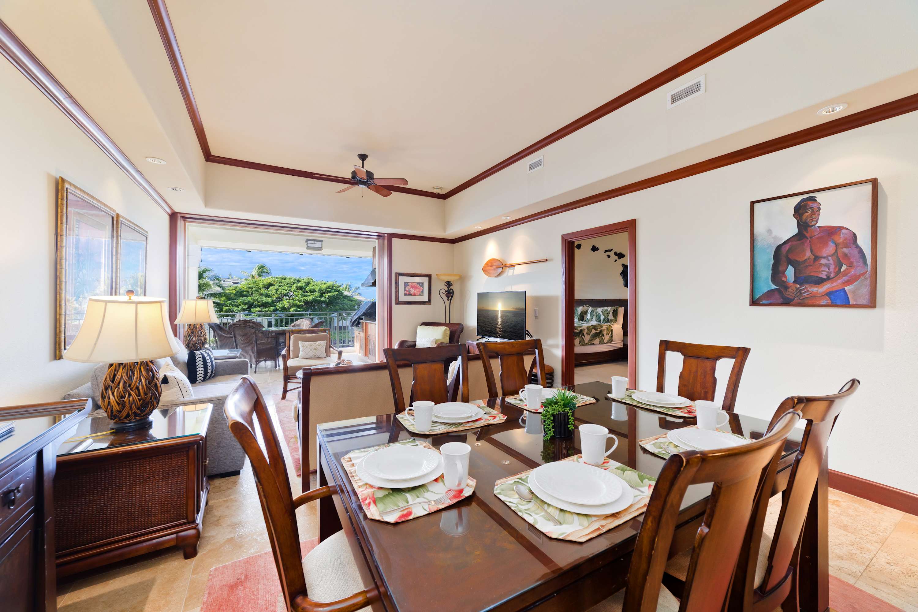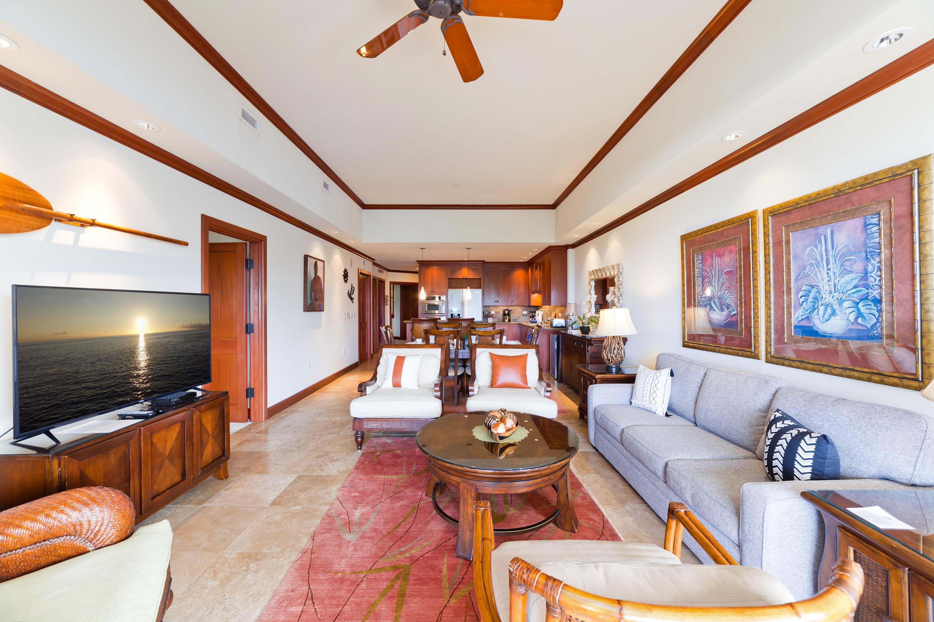 Each room features modern and island decor creating a Hawaiian atmosphere. The gourmet kitchen has everything a chef could need. Stainless steel appliances and ample granite countertops are prepared for home cooking. 2 guests can enjoy sitting at the built-in breakfast bar. Call everyone to the dining table with seating for 6 to enjoy a meal together.