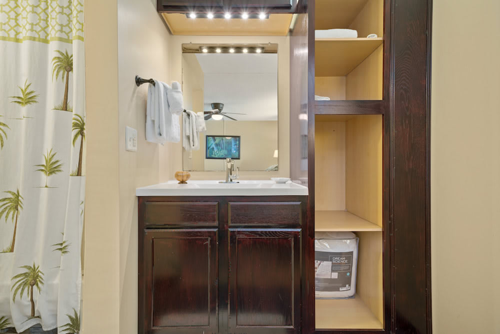 Across from the living room is a well-equipped kitchen. All appliances needed are ready to help a chef whip up delicious snacks and meals. Call your guests over to the formal dining table with seating for 4 to have a home cooked meal together. Step outside onto the private lanai and enjoy a cold drink watching the sunsets over the ocean.