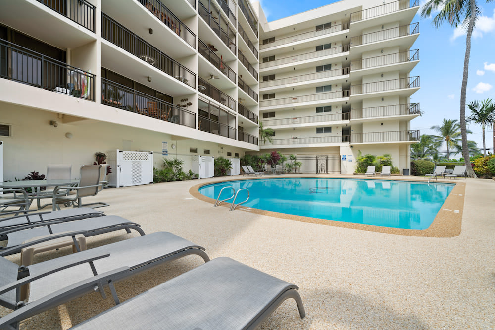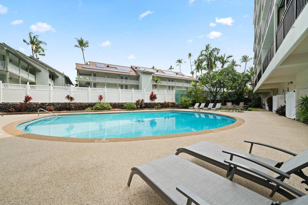Kona Alii Condominiums also has a parking space for this unit labeled #204 and a secured building entry. There are BBQ stations and an outdoor swimming pool for guests to use.