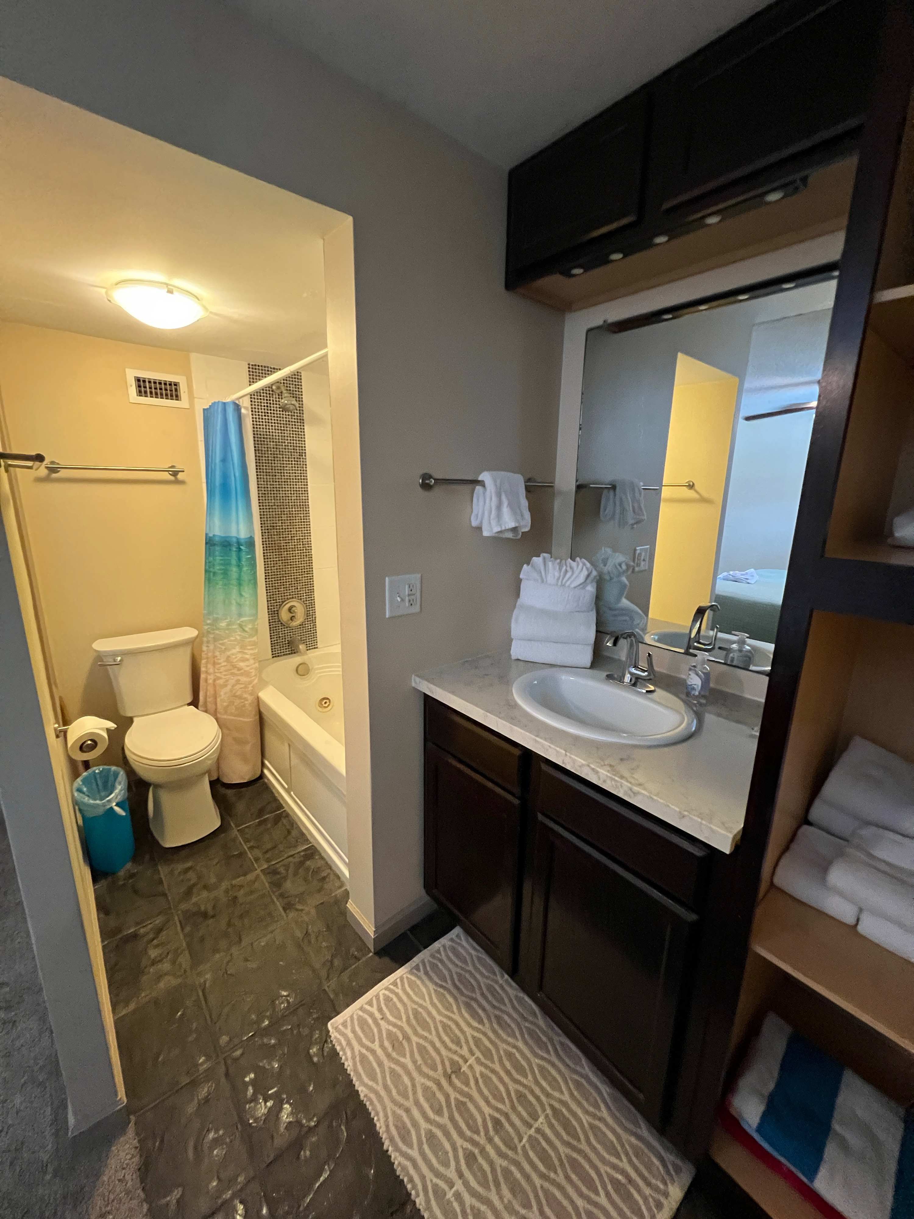 Down the hall is the master bedroom. The bedroom is furnished with a luxurious King-sized bed and has an attached private bathroom. The bathroom has a shower/tub combo and a separate vanity to make getting ready easy. The vacation home is prepared with a washer and dryer combo, convenient for any wet bathing suits.