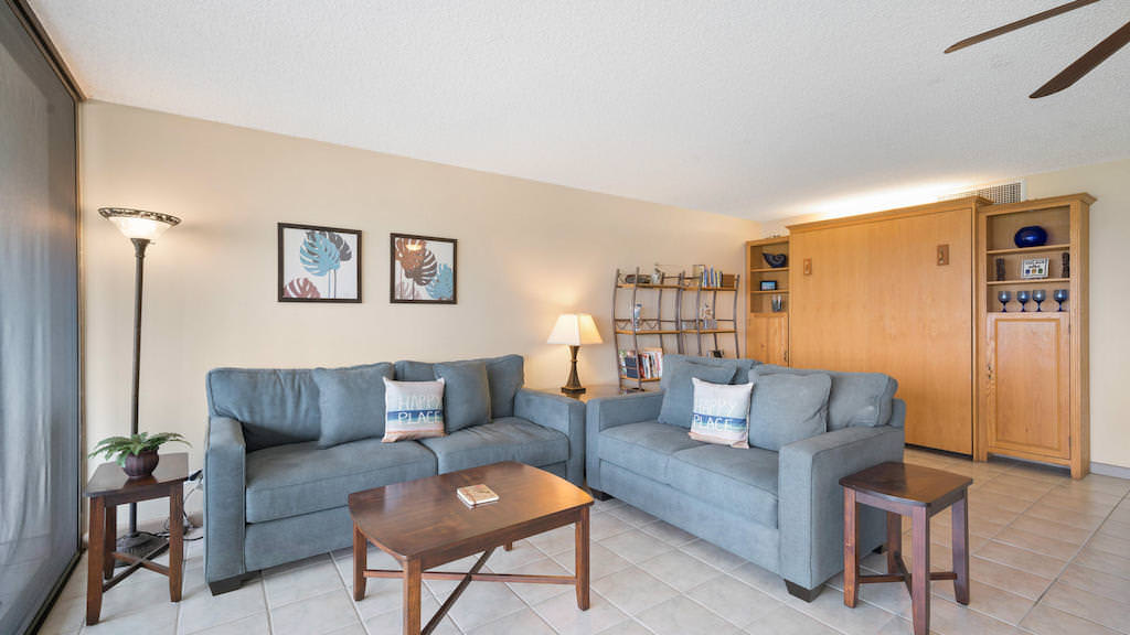 The condo unveils into a bright and open living room. Plush seating arrangements are circled in front of a mounted flat screen TV. A DVD player, telephone for local calls (there is no phone listed for this property), a work desk, and WIFI are provided to ensure your comfort. The space features a Queen-sized Murphy bed that conveniently pulls down from the wall, as seen in the photos. A shared guest bath can be accessed from here.