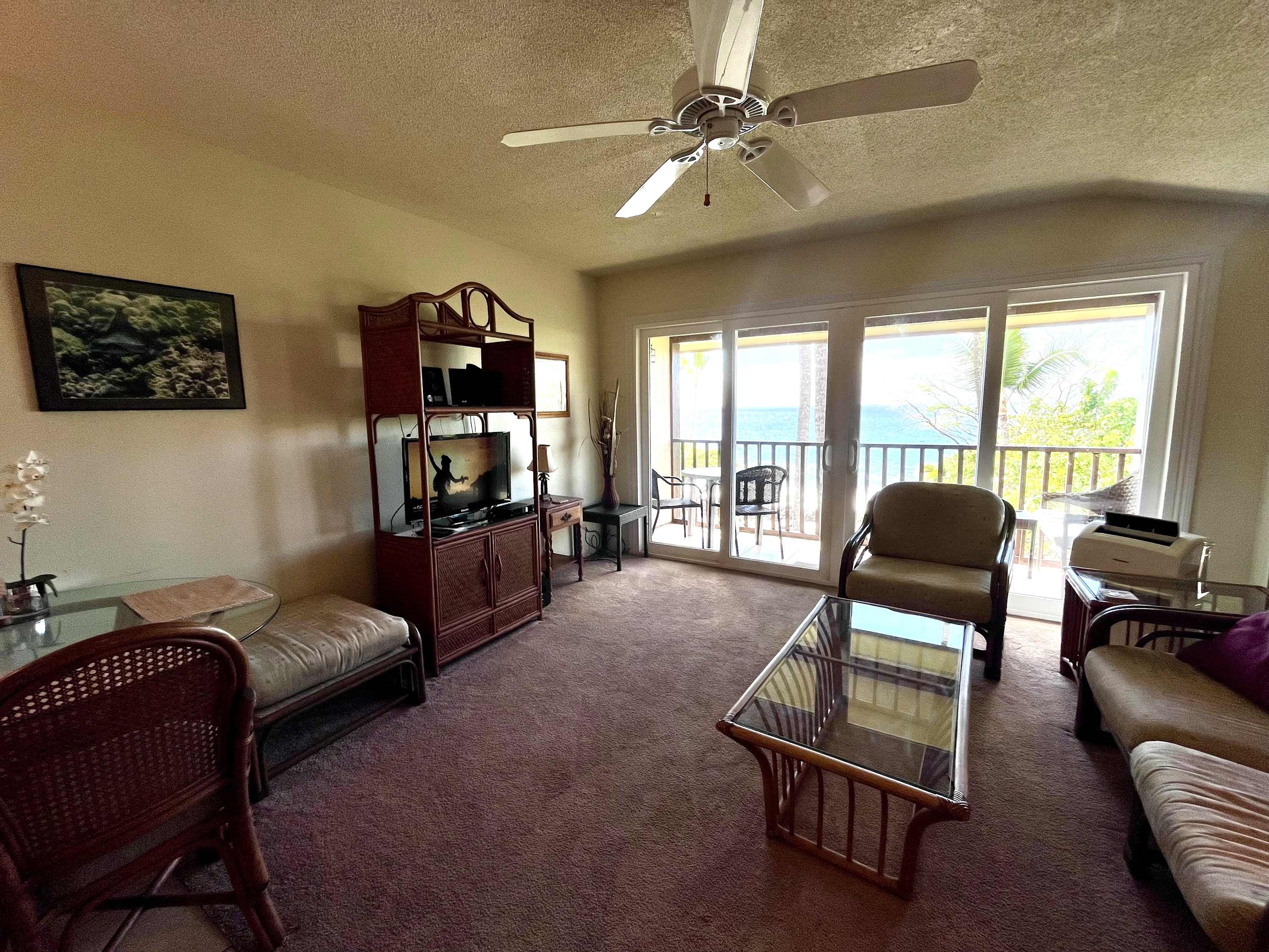 The living room is furnished with seating around a TV, and comes with access to a private lanai with amazing ocean views. Sit out here and enjoy your morning Kona coffee! There is a portable AC in the living room that only keeps the living area cool (it is not strong enough to reach the kitchen or bedroom).