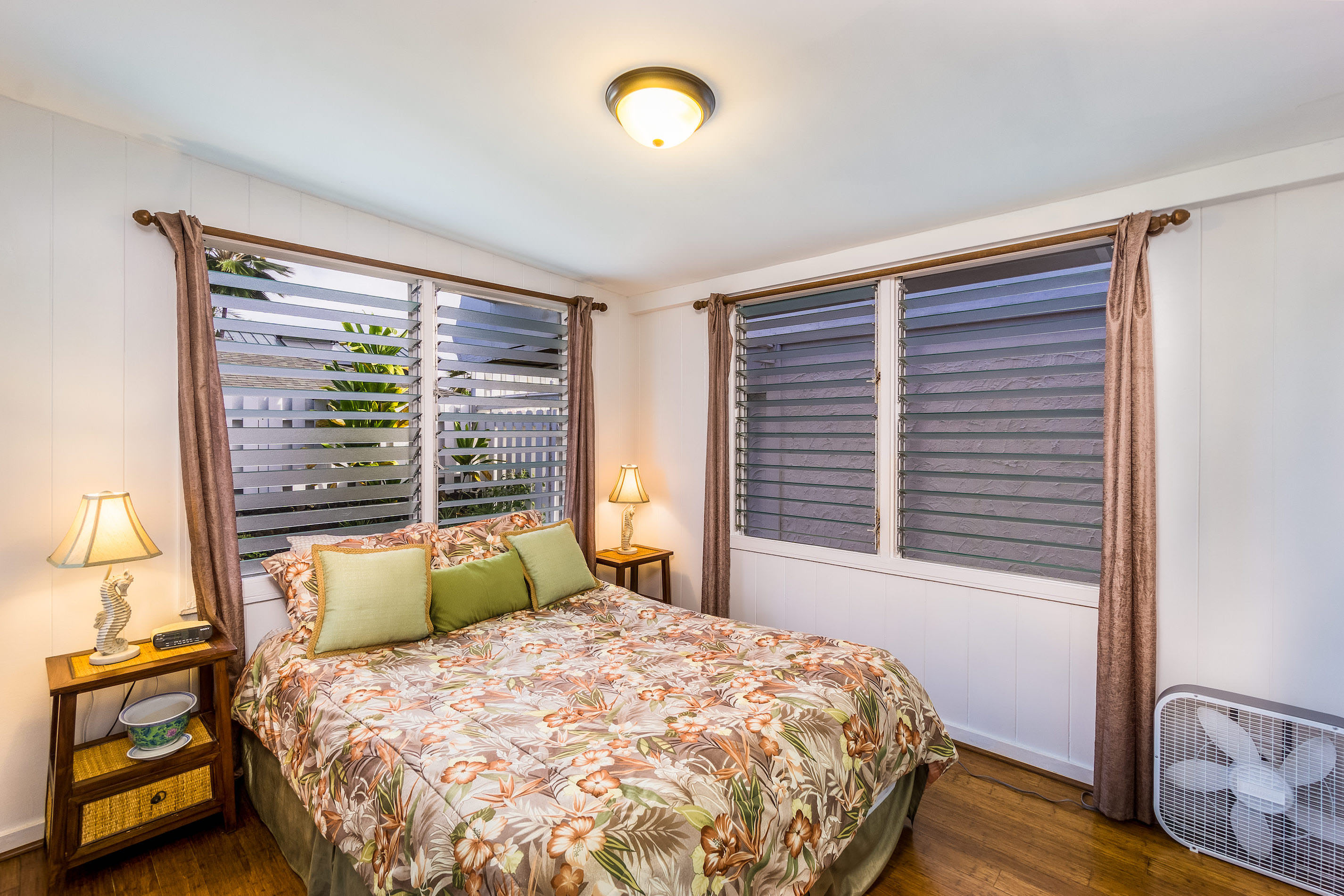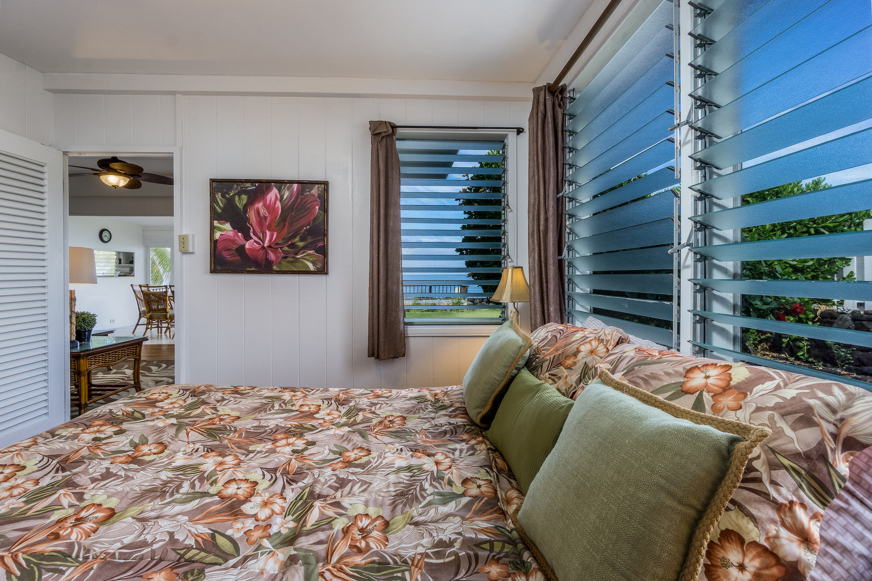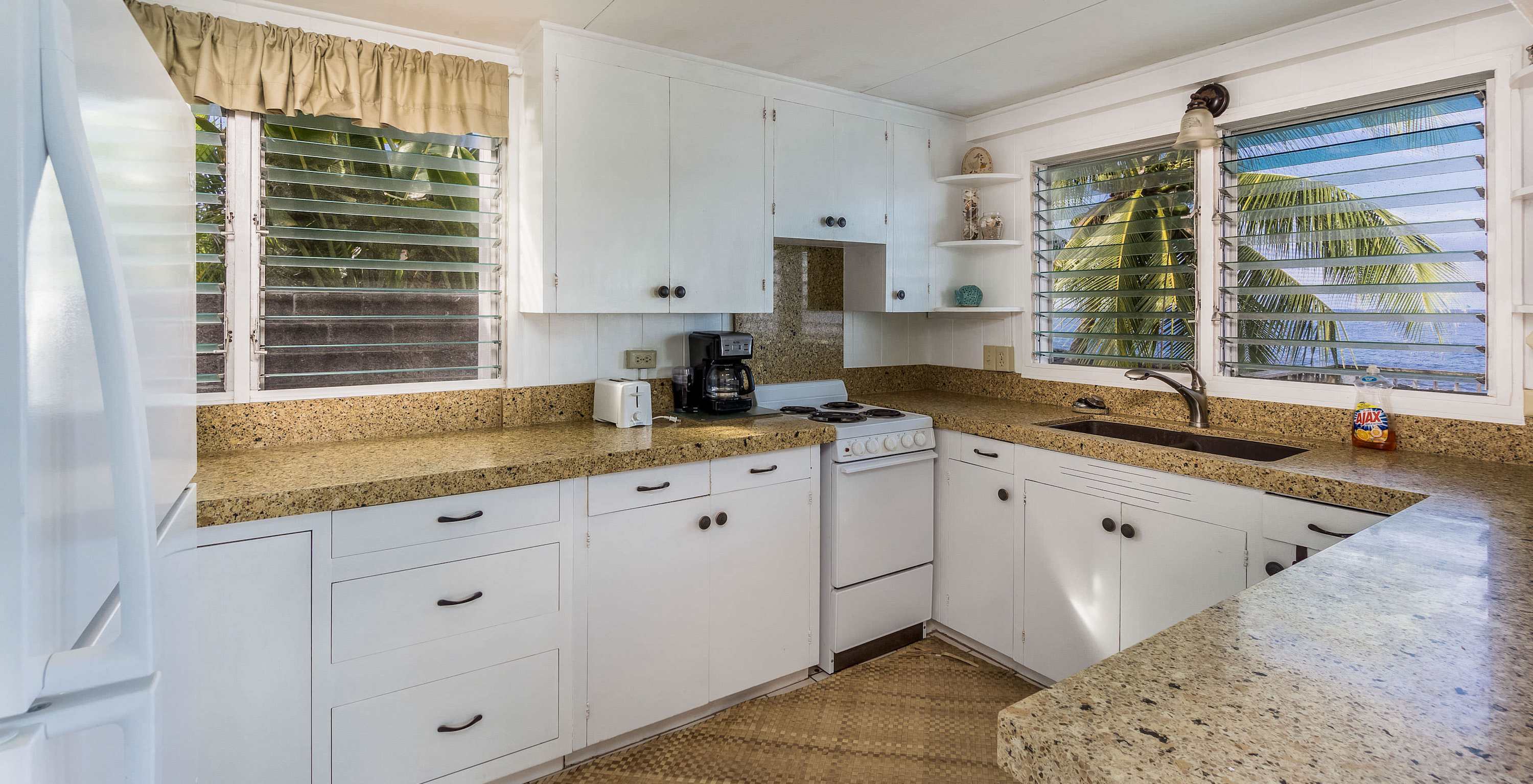 Within walking distance to Kona town and Honls beach, this cottage is ideal for those looking to explore the beauty of Kailua-Kona. Recent upgrades include new wood flooring, flagstone tiled lanai, granite kitchen counters, paint, and furnishings. The master suite features a private bath, while the guest room is situated on the opposite side of the house. The half bedroom offers a daybed with a trundle bed and is located at the entry of the house.