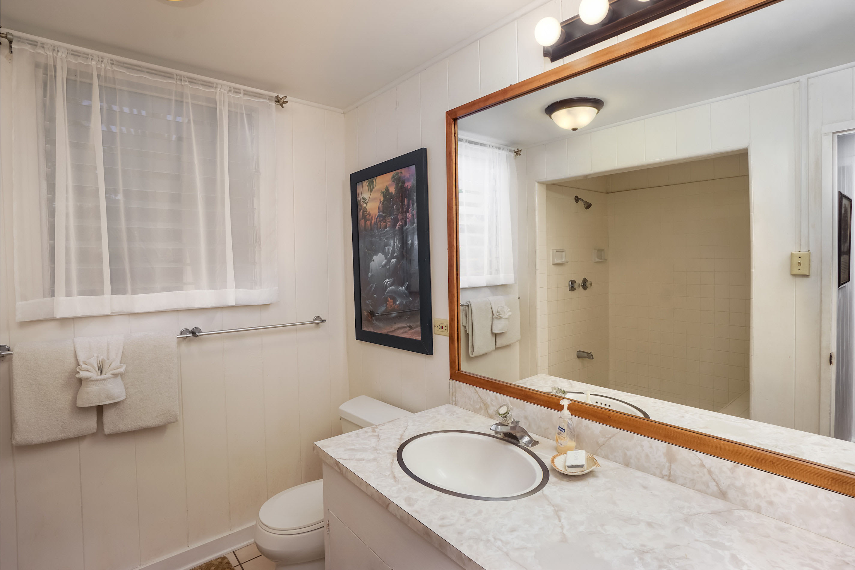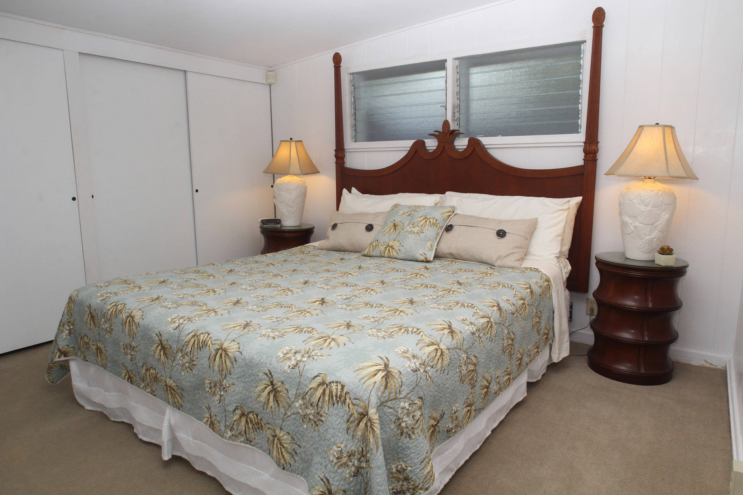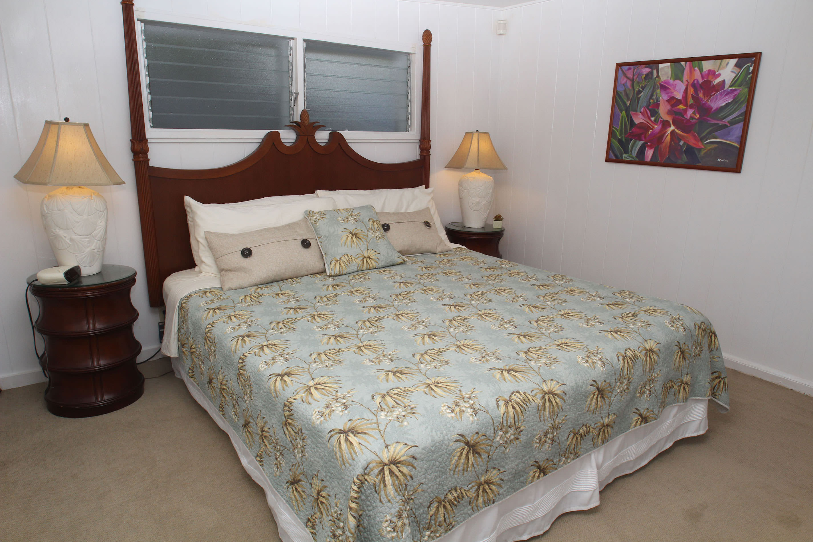 Within walking distance to Kona town and Honls beach, this cottage is ideal for those looking to explore the beauty of Kailua-Kona. Recent upgrades include new wood flooring, flagstone tiled lanai, granite kitchen counters, paint, and furnishings. The master suite features a private bath, while the guest room is situated on the opposite side of the house. The half bedroom offers a daybed with a trundle bed and is located at the entry of the house.