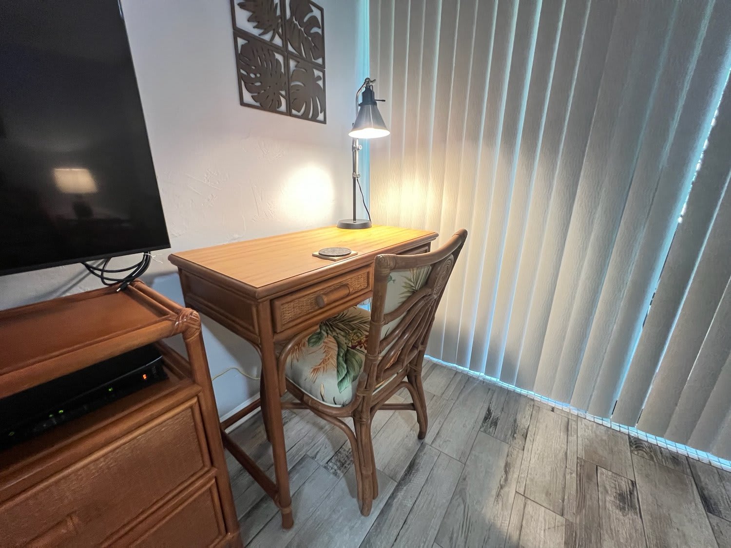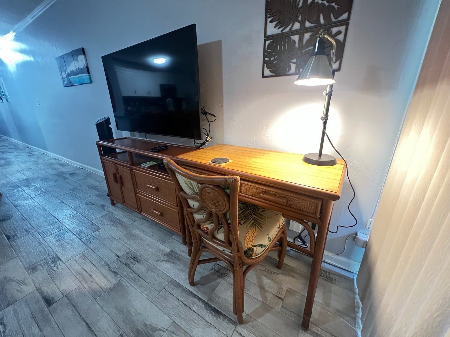 If you’re in the mood to relax and enjoy a cozy evening in, the stylish kitchen is fully stocked with all the cookware and dining ware you’ll need to whip up delicious meals at home. Pull up a high-top stool at the island or take your meal outside to the lanai and enjoy the lush garden views. After dinner, settle into the comfortable living room sofa and stream all your favorite shows on the smart TV.