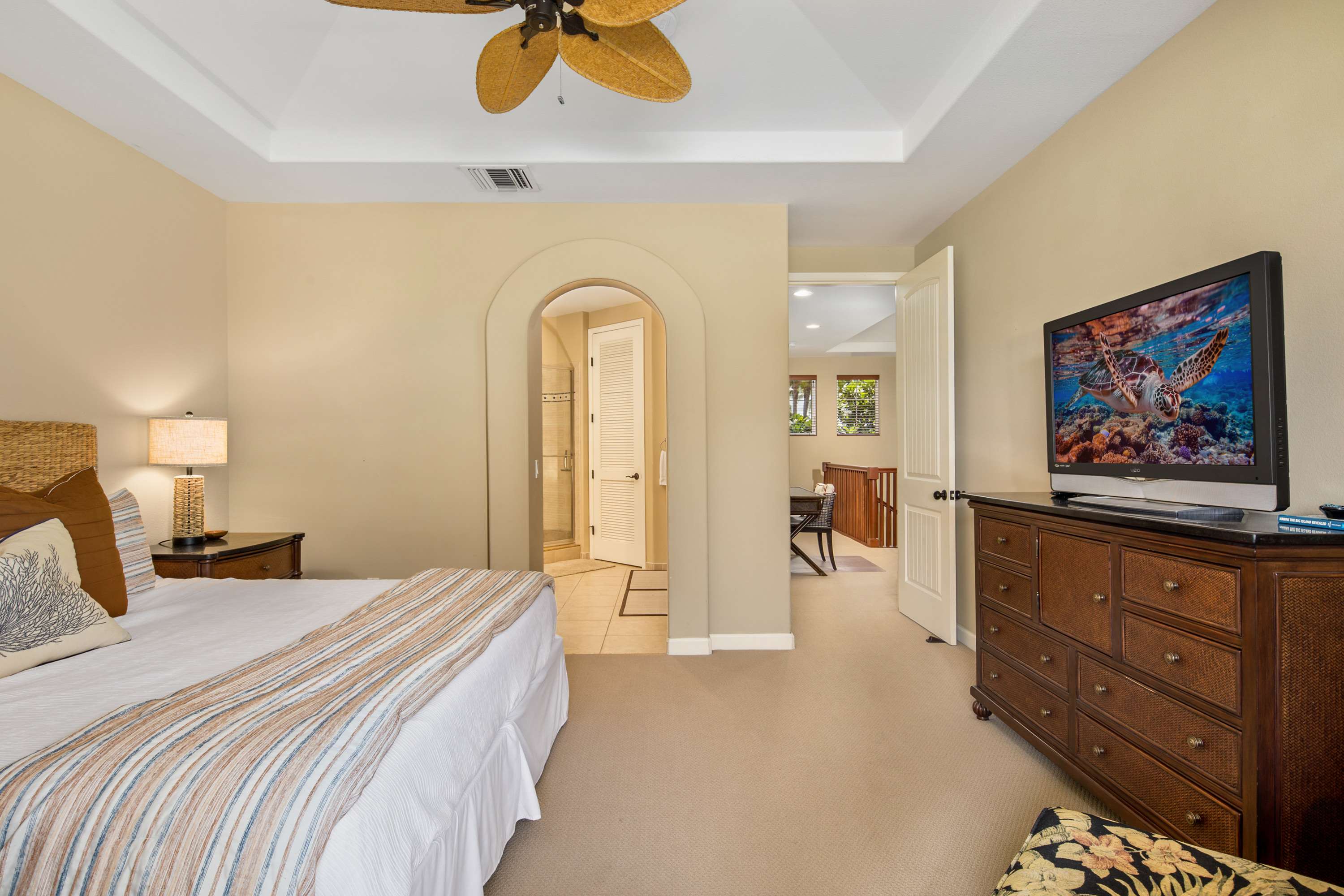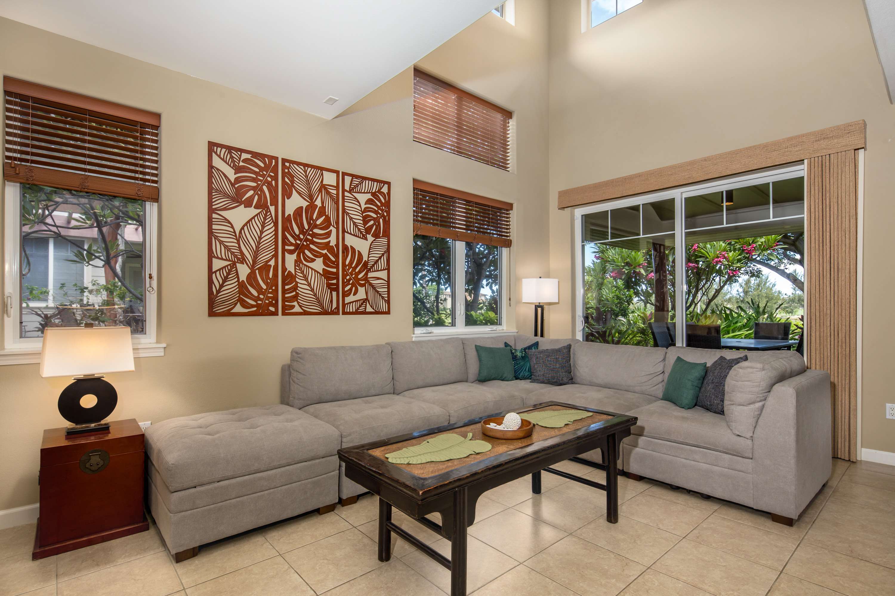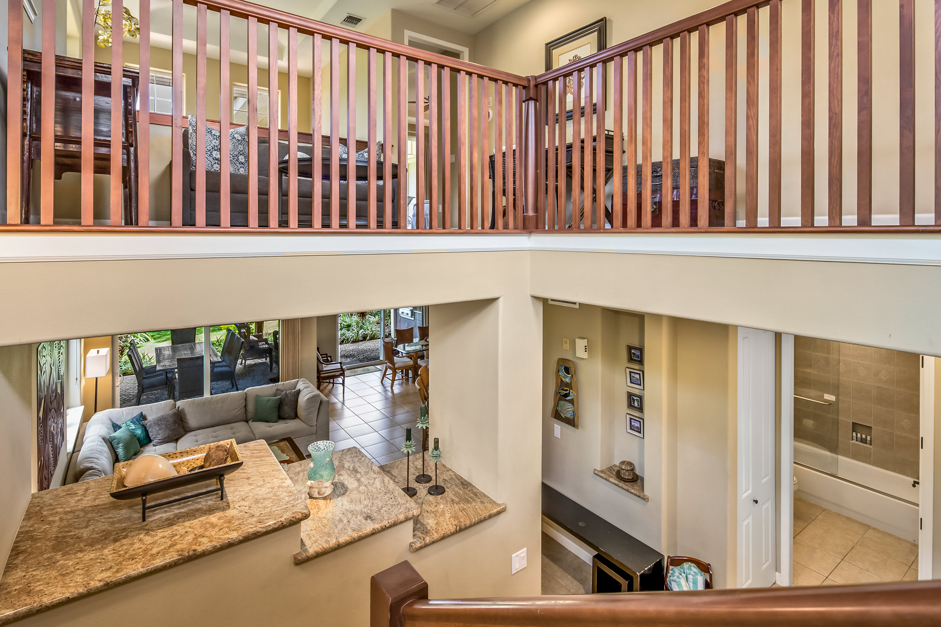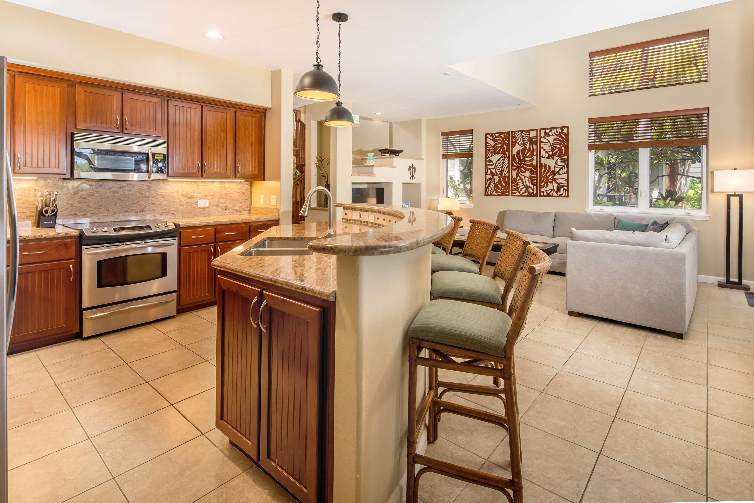 This end-unit home offers an abundance of seclusion and privacy along with an extra-large shaded lanai where you can spend your afternoon hours turning the pages of a good book, grilling up a delicious barbeque lunch, or playing a round of cards at the outdoor dining table, all the while soaking in the fresh air and lush tropical vistas. Head indoors to beat the heat the soothing, neutral-toned interior promoting vibes of relaxation and rejuvenation. Kick back and relax on the plush living room sofa while you stream your favorite shows or a new movie on the smart TV. Steps away, the chef’s kitchen is fully quipped for all of your mealtime needs, showcasing stainless steel appliances, glossy stone countertops, and sleek cabinetry stocked with cookware and dining ware. Dine together at the table with seating for 6 or enjoy a more casual bite up at the counter on high-top stools for 4. When you need some quiet time to yourself or should you need to catch up on some emails, the loft offers a dedicated workspace along with a sofa, allowing you to fully focus on the task at hand.