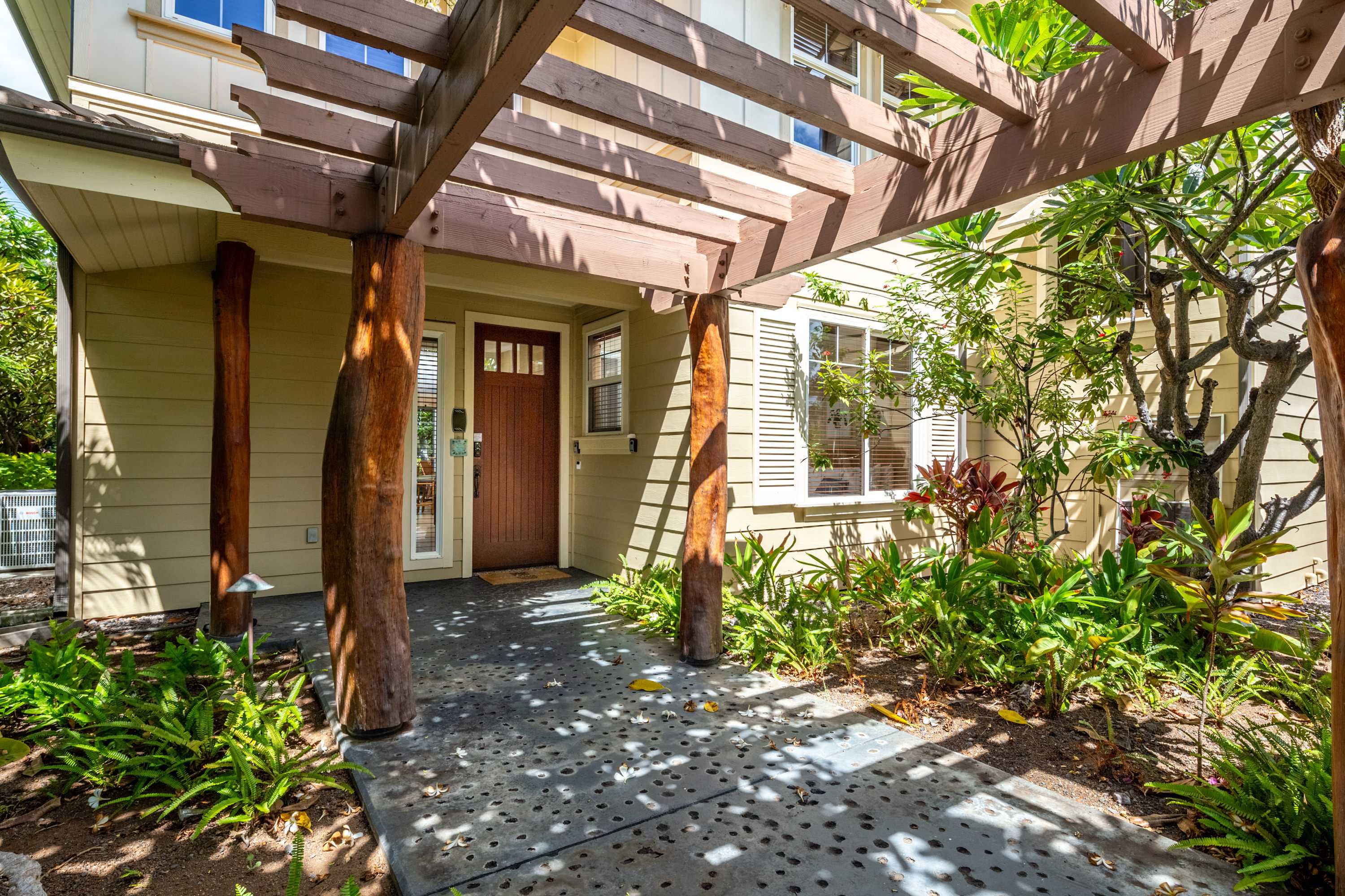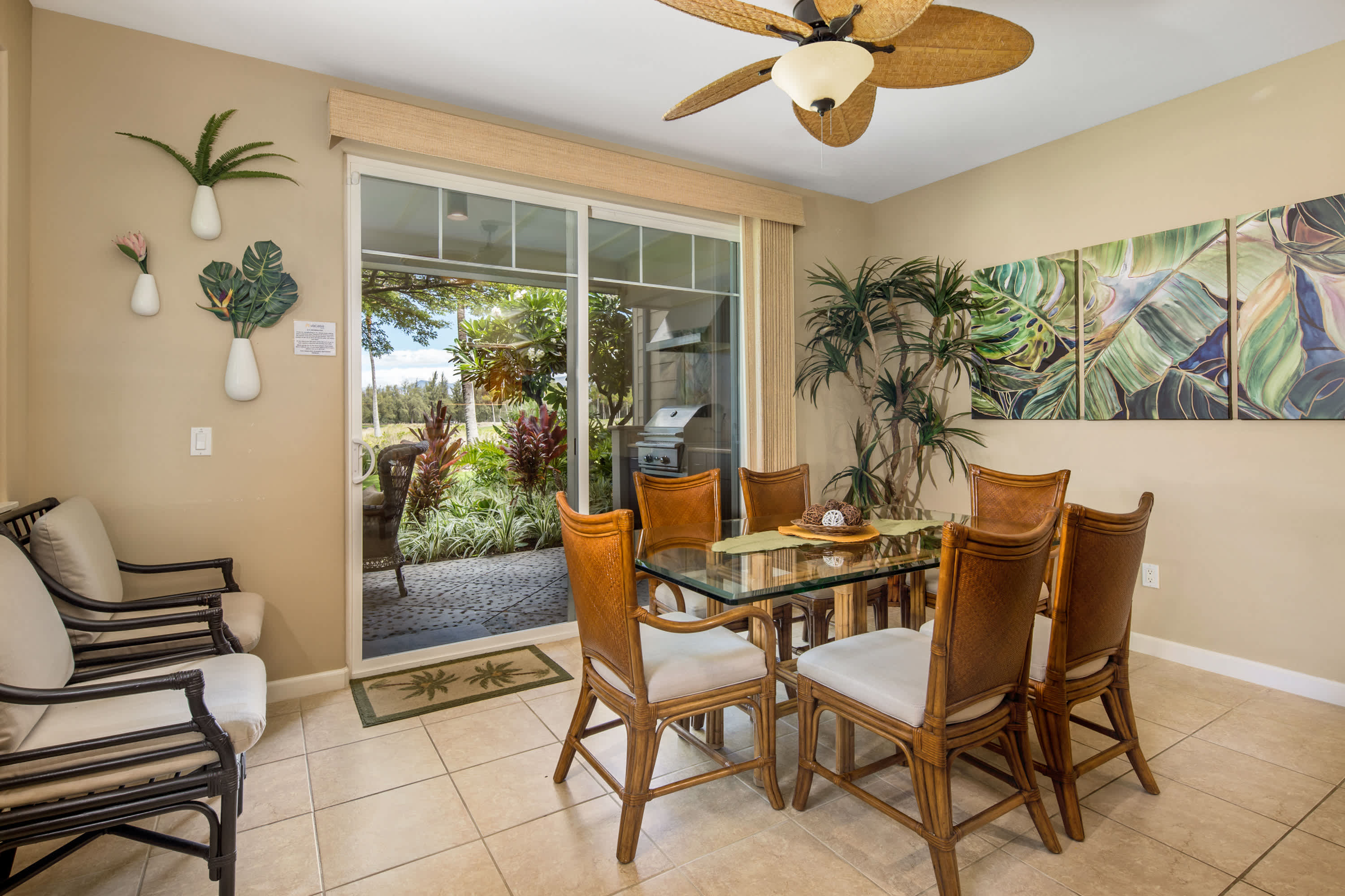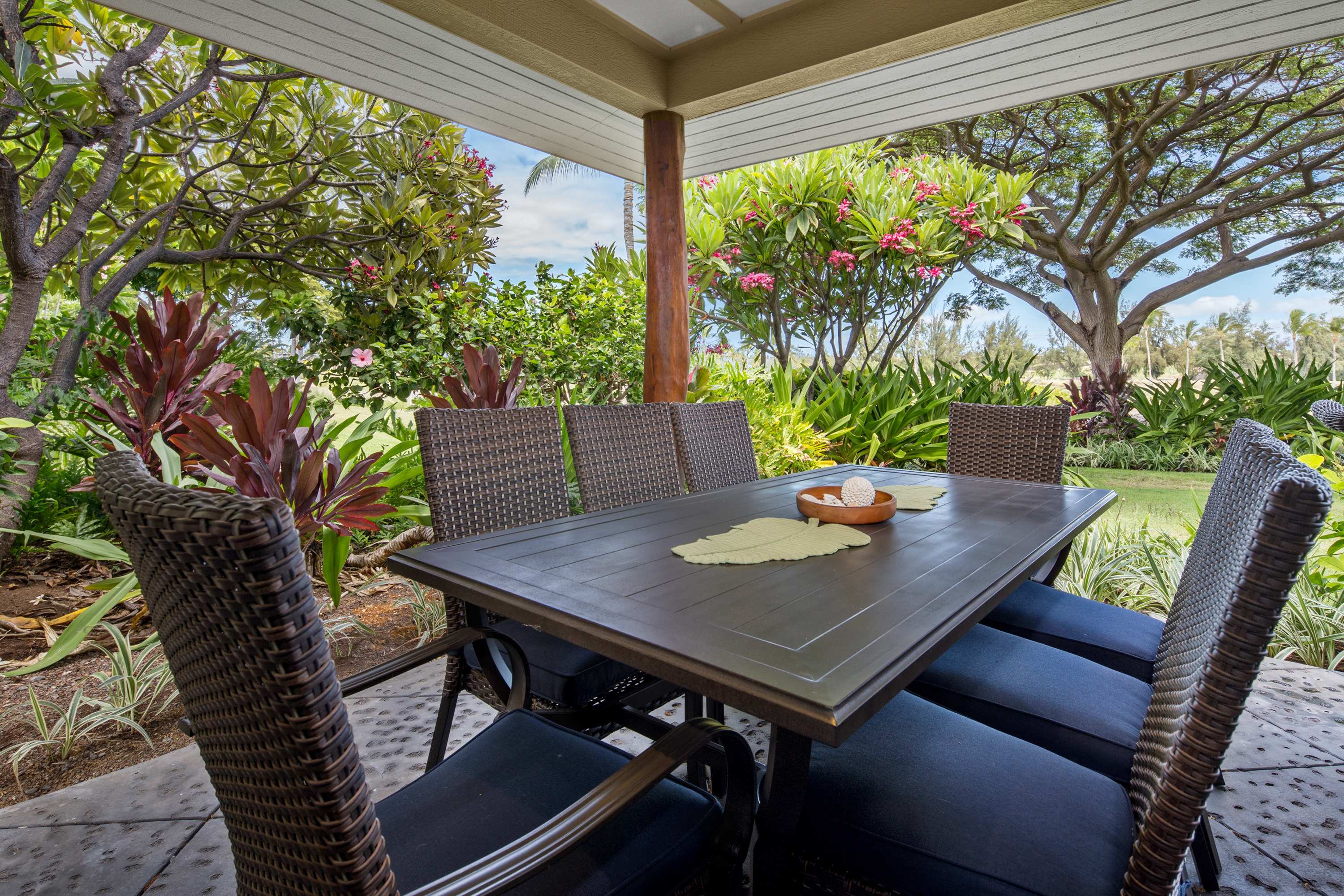This end-unit home offers an abundance of seclusion and privacy along with an extra-large shaded lanai where you can spend your afternoon hours turning the pages of a good book, grilling up a delicious barbeque lunch, or playing a round of cards at the outdoor dining table, all the while soaking in the fresh air and lush tropical vistas. Head indoors to beat the heat the soothing, neutral-toned interior promoting vibes of relaxation and rejuvenation. Kick back and relax on the plush living room sofa while you stream your favorite shows or a new movie on the smart TV. Steps away, the chef’s kitchen is fully quipped for all of your mealtime needs, showcasing stainless steel appliances, glossy stone countertops, and sleek cabinetry stocked with cookware and dining ware. Dine together at the table with seating for 6 or enjoy a more casual bite up at the counter on high-top stools for 4. When you need some quiet time to yourself or should you need to catch up on some emails, the loft offers a dedicated workspace along with a sofa, allowing you to fully focus on the task at hand.