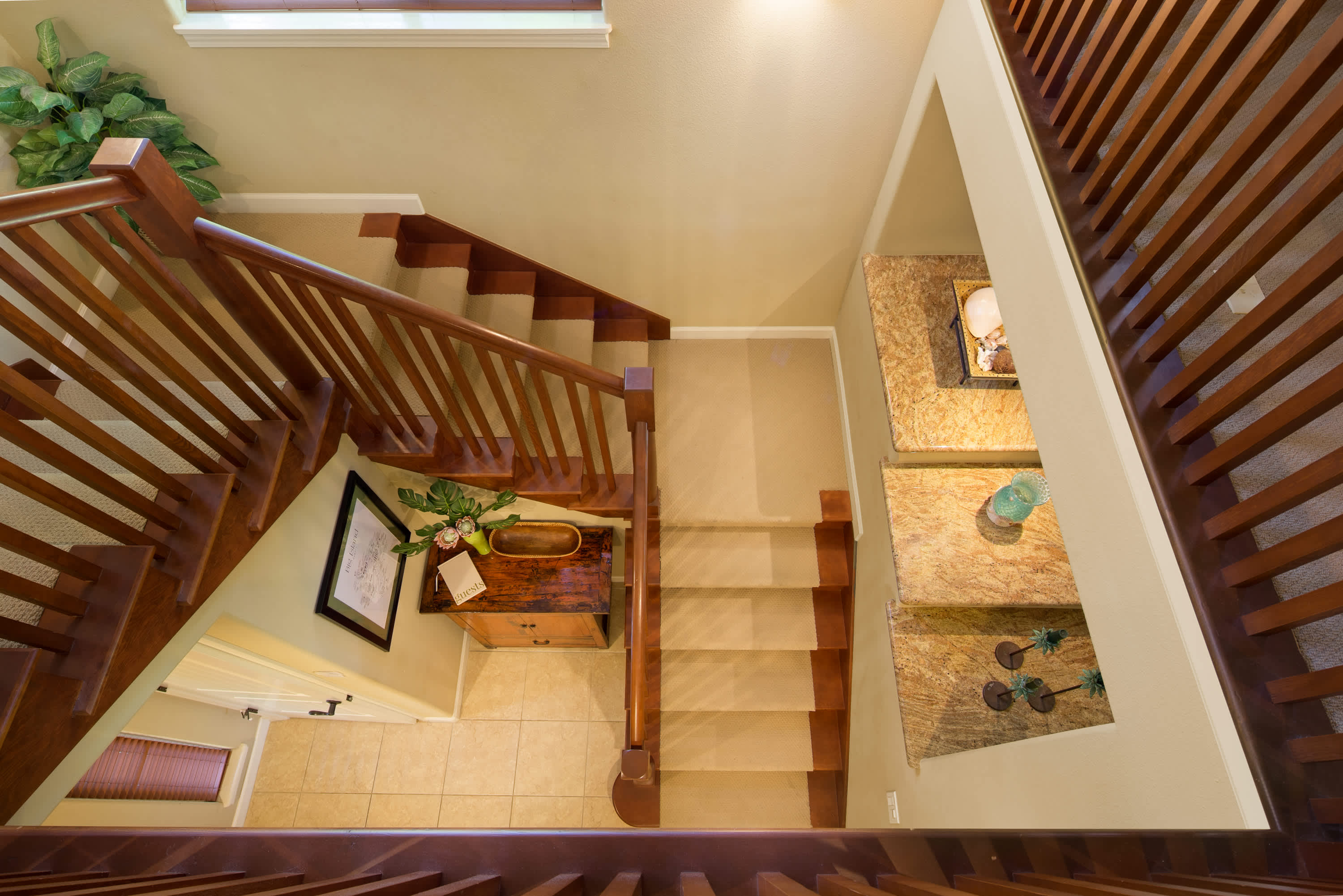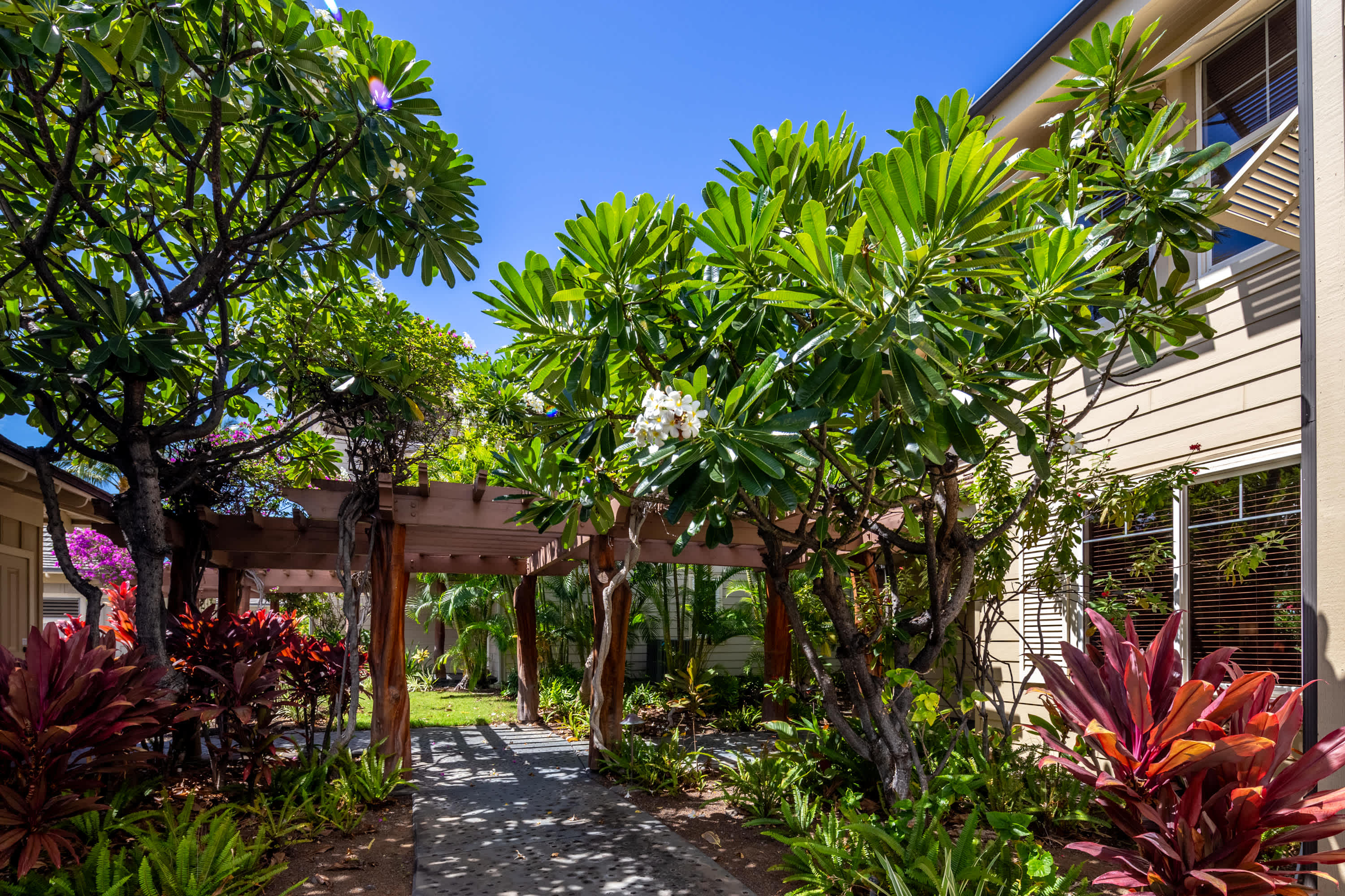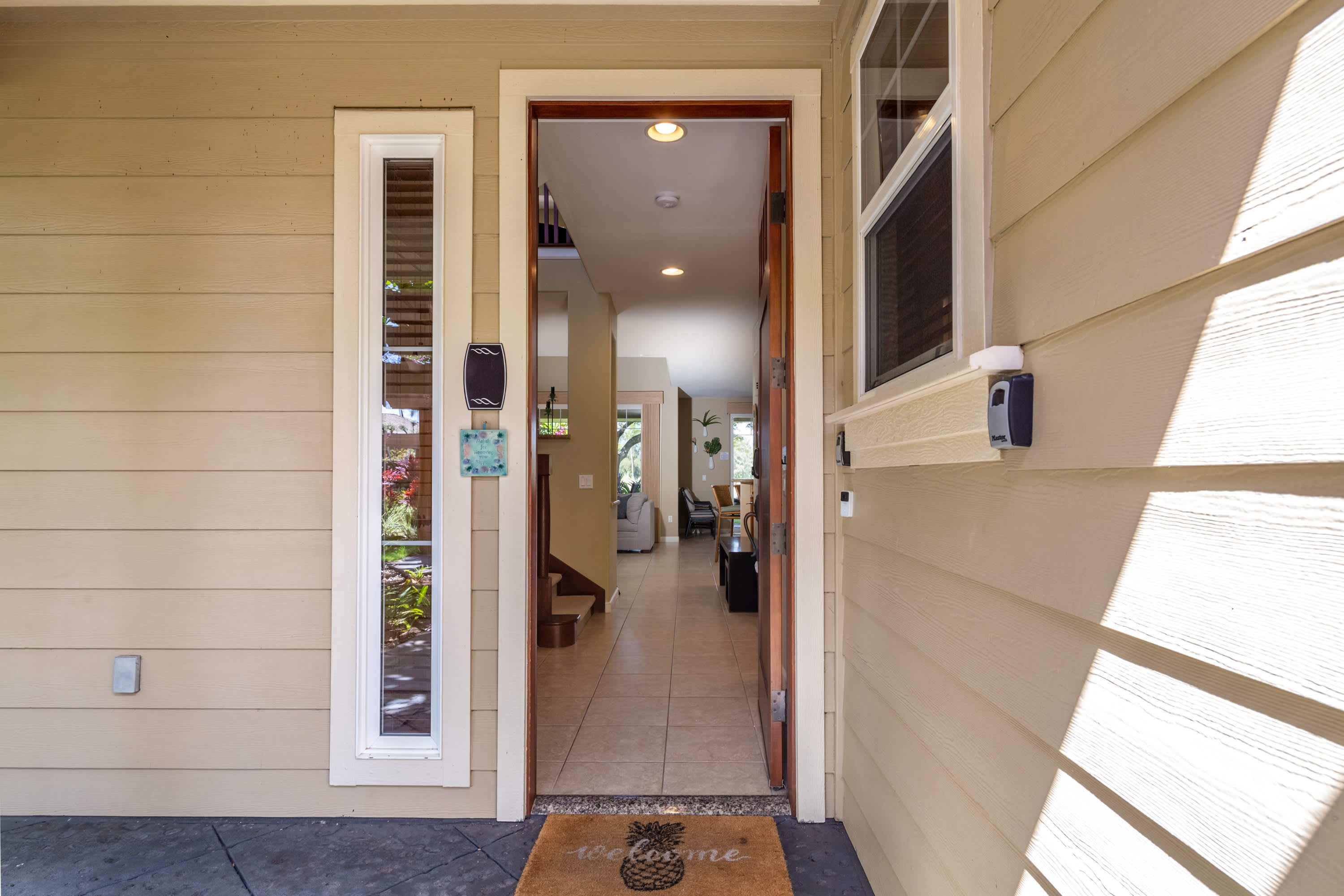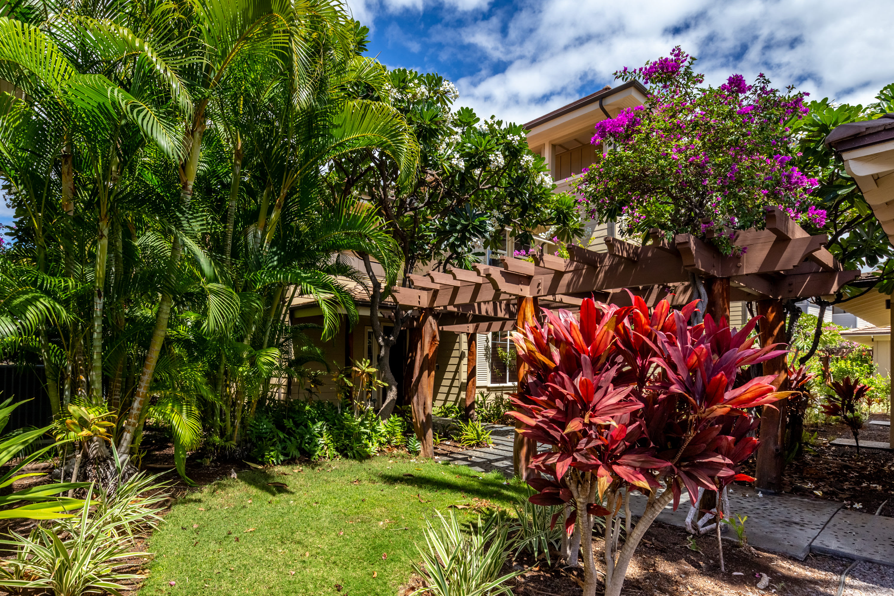 This end-unit home offers an abundance of seclusion and privacy along with an extra-large shaded lanai where you can spend your afternoon hours turning the pages of a good book, grilling up a delicious barbeque lunch, or playing a round of cards at the outdoor dining table, all the while soaking in the fresh air and lush tropical vistas. Head indoors to beat the heat the soothing, neutral-toned interior promoting vibes of relaxation and rejuvenation. Kick back and relax on the plush living room sofa while you stream your favorite shows or a new movie on the smart TV. Steps away, the chef’s kitchen is fully quipped for all of your mealtime needs, showcasing stainless steel appliances, glossy stone countertops, and sleek cabinetry stocked with cookware and dining ware. Dine together at the table with seating for 6 or enjoy a more casual bite up at the counter on high-top stools for 4. When you need some quiet time to yourself or should you need to catch up on some emails, the loft offers a dedicated workspace along with a sofa, allowing you to fully focus on the task at hand.