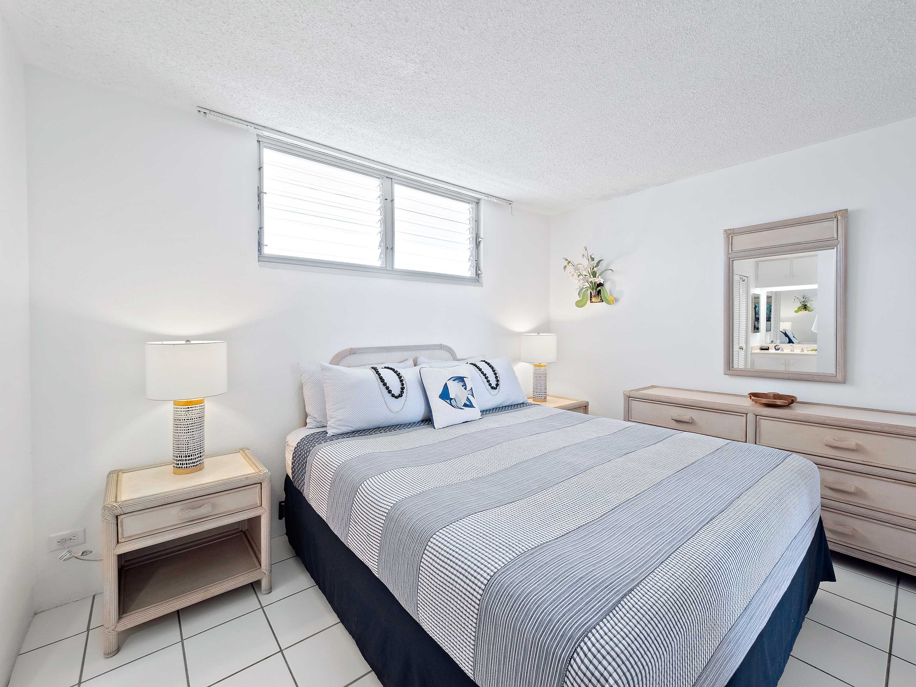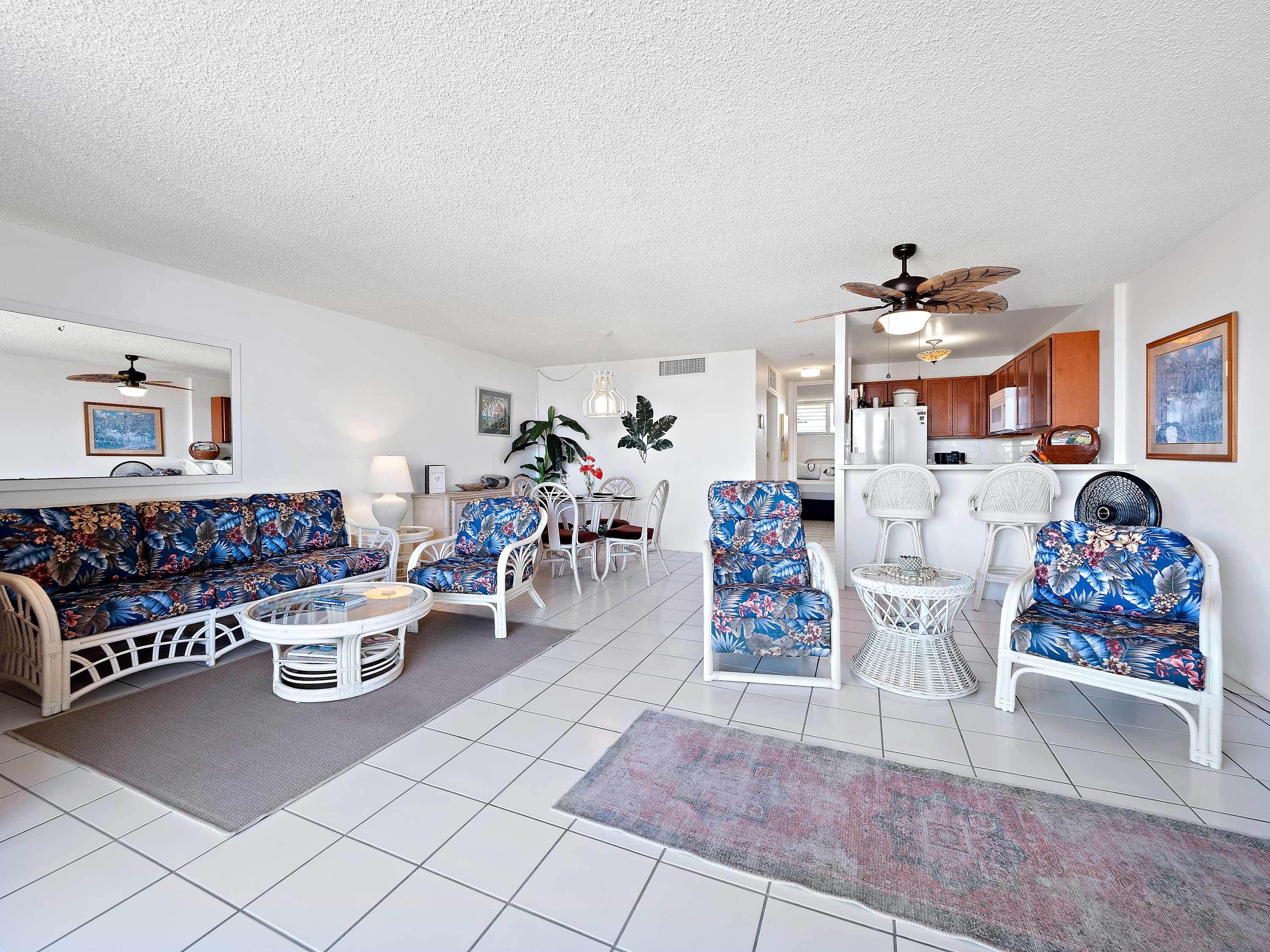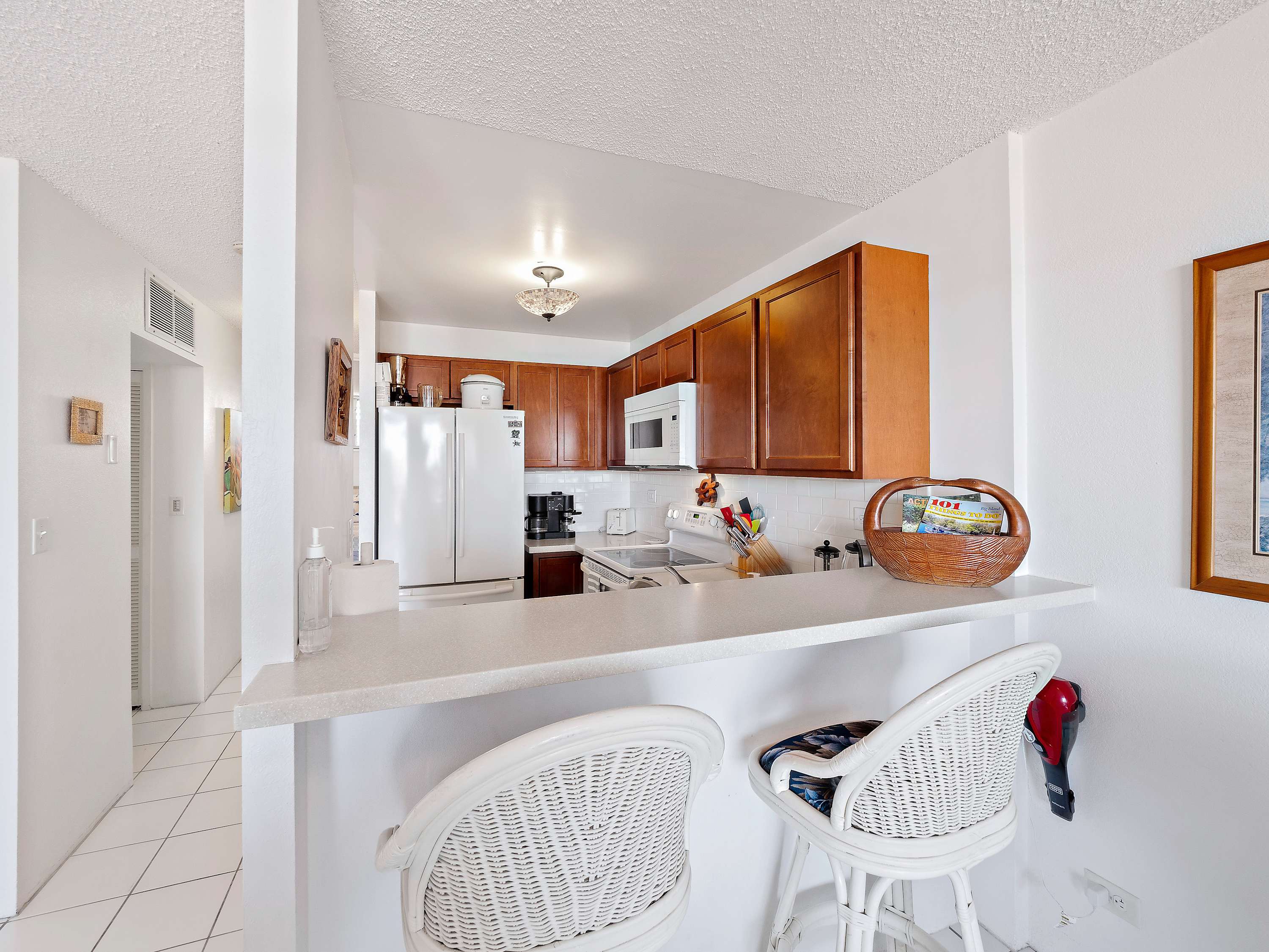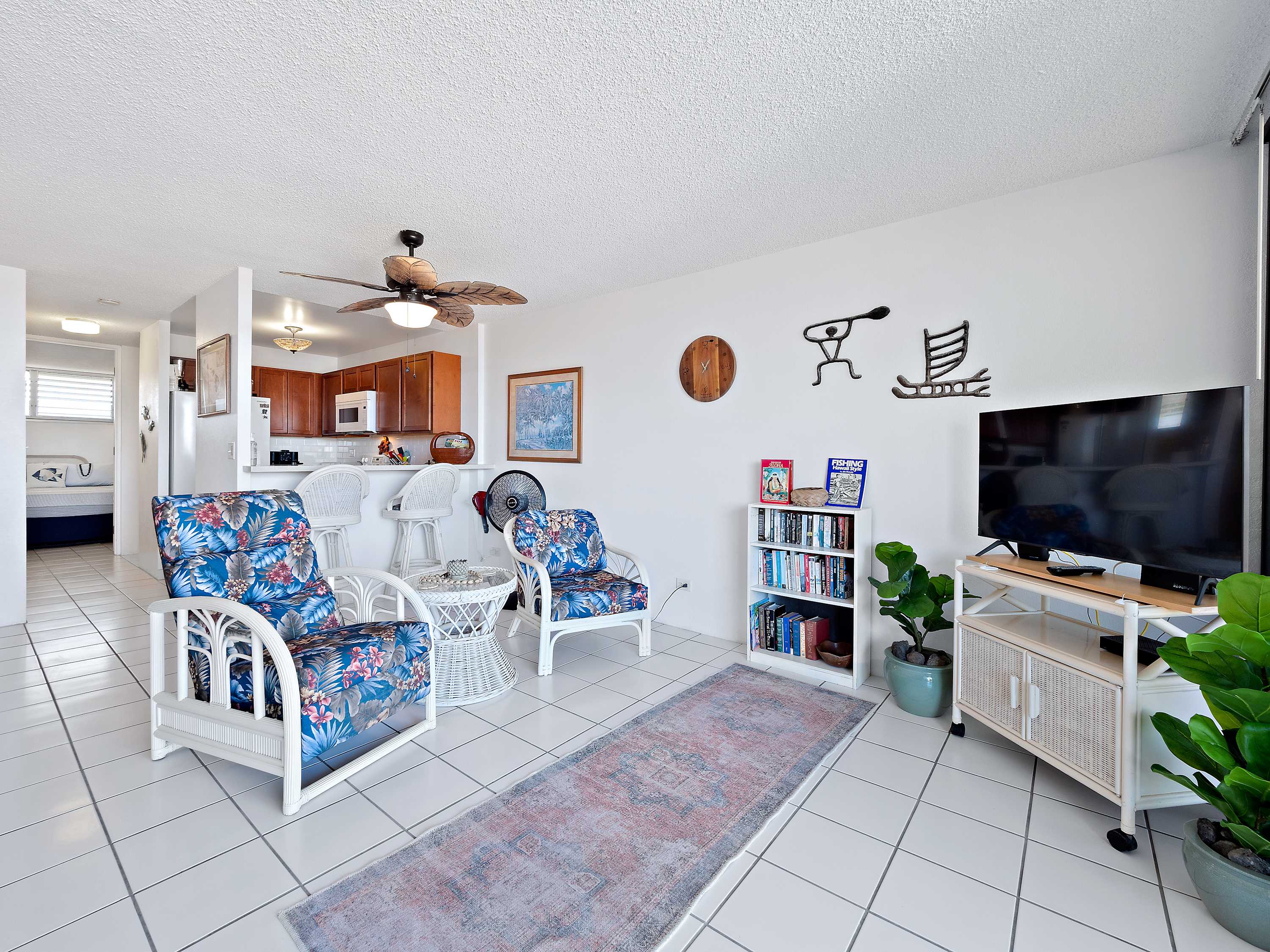 Indoors, you’ll find delight in the charming furnishings and décor properly representing the theme of the islands in open and airy spaces that promote connection and relaxation. Find relief from the heat on sofa and armchair seating in the living room as you catch up on episodes of your favorite shows on the smart TV. Merge indoor and outdoor living together by opening the large sliding doors to the lanai and allowing the cool ocean breeze flow freely throughout the home. Dine together at the formal table with seating for 4 or snag a high-top stool at the counter for more casual bites or a quick breakfast on your way out the door to adventure. The well-equipped kitchen offers everything you need to whip up delicious meals right from home, with ample counterspace and cabinetry for meal preparation and storage.