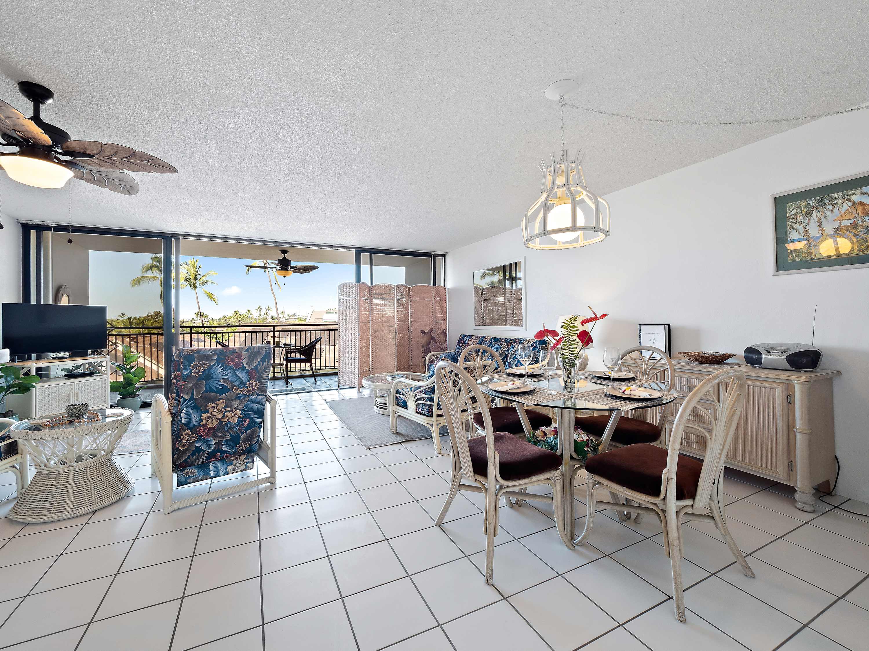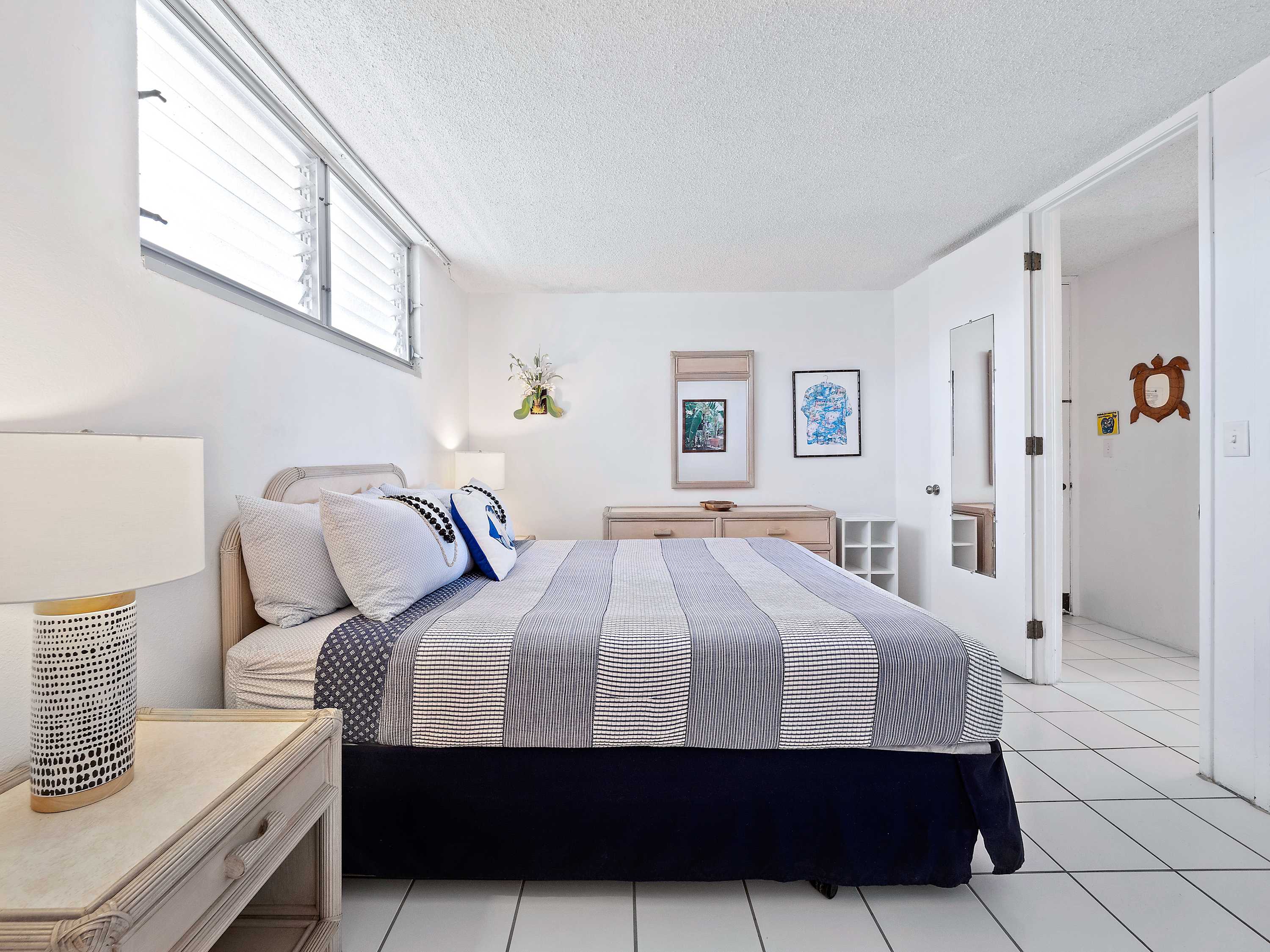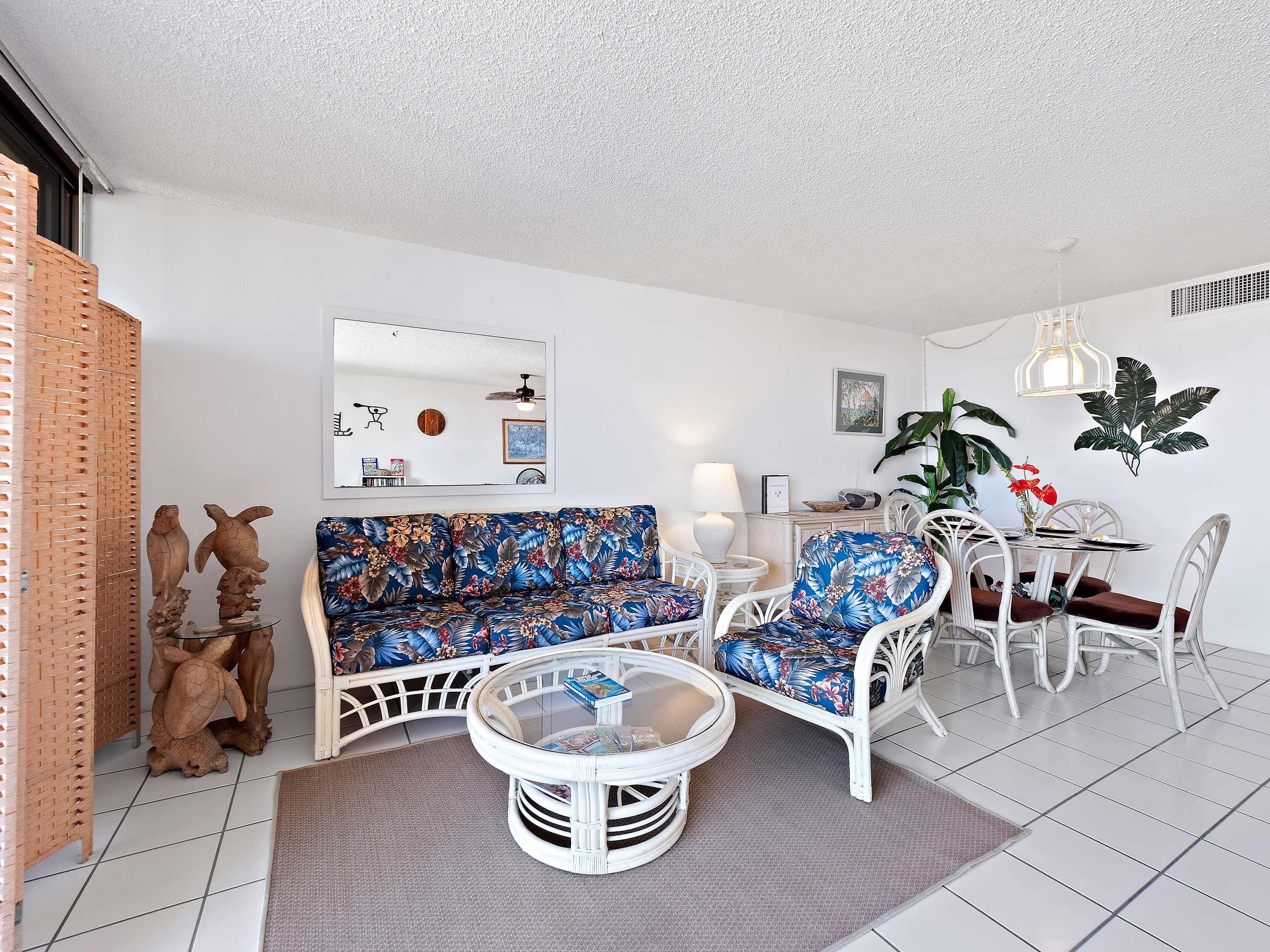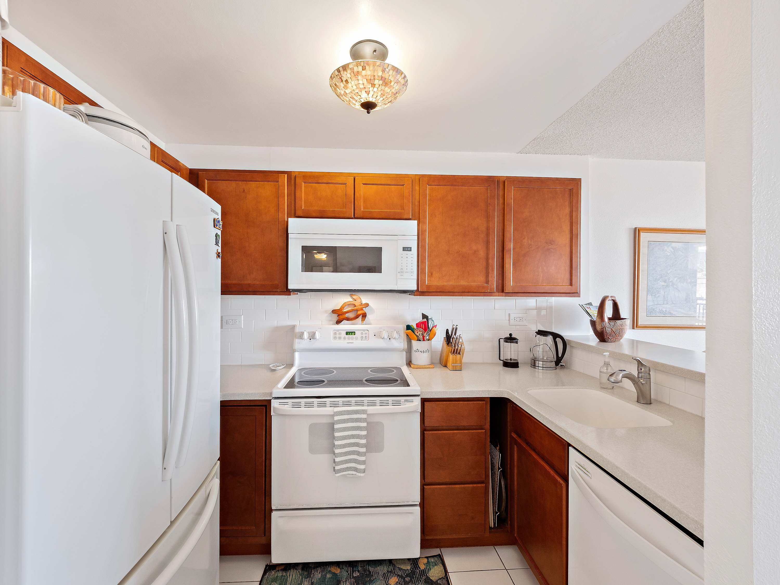 Indoors, you’ll find delight in the charming furnishings and décor properly representing the theme of the islands in open and airy spaces that promote connection and relaxation. Find relief from the heat on sofa and armchair seating in the living room as you catch up on episodes of your favorite shows on the smart TV. Merge indoor and outdoor living together by opening the large sliding doors to the lanai and allowing the cool ocean breeze flow freely throughout the home. Dine together at the formal table with seating for 4 or snag a high-top stool at the counter for more casual bites or a quick breakfast on your way out the door to adventure. The well-equipped kitchen offers everything you need to whip up delicious meals right from home, with ample counterspace and cabinetry for meal preparation and storage.