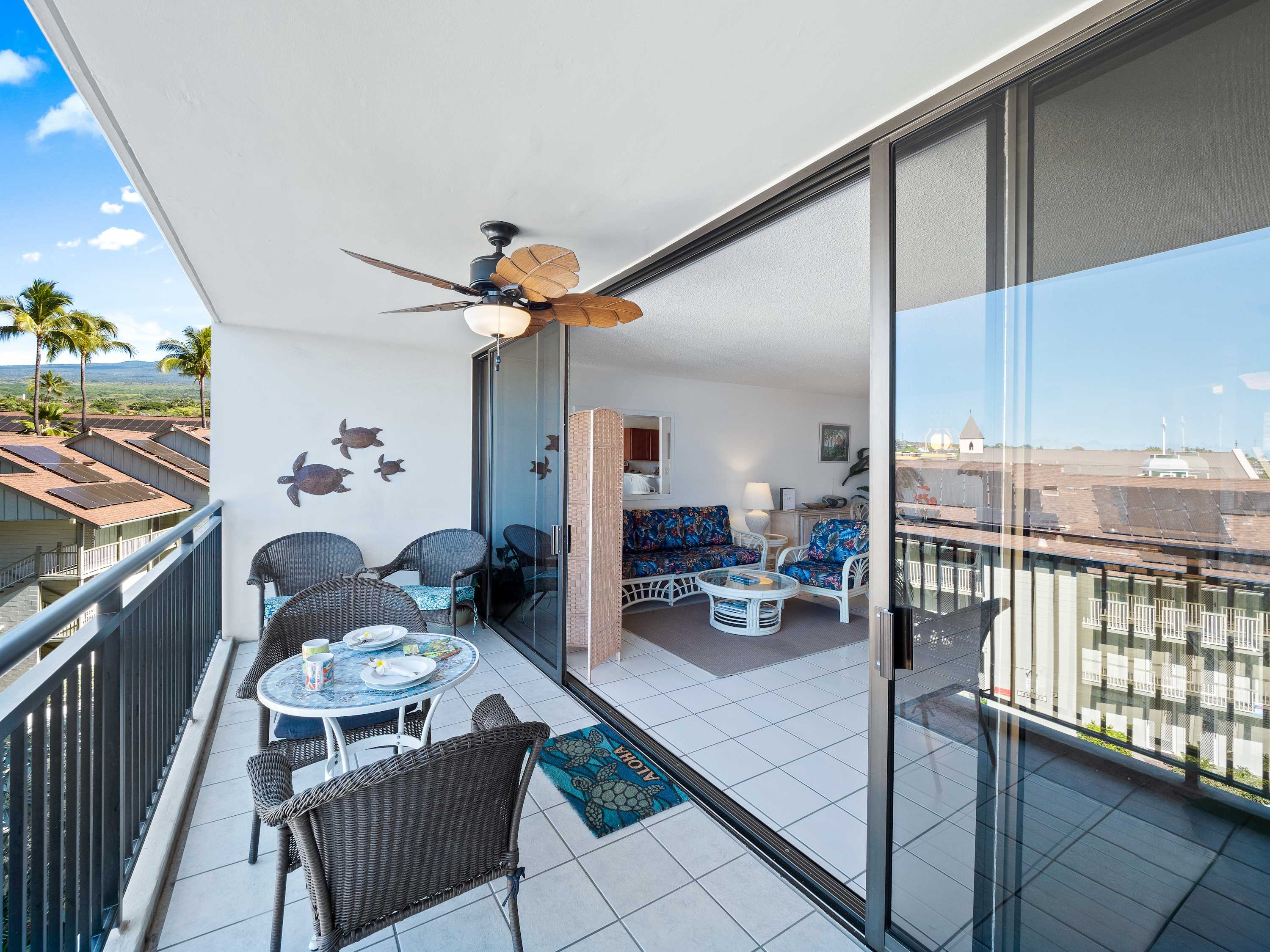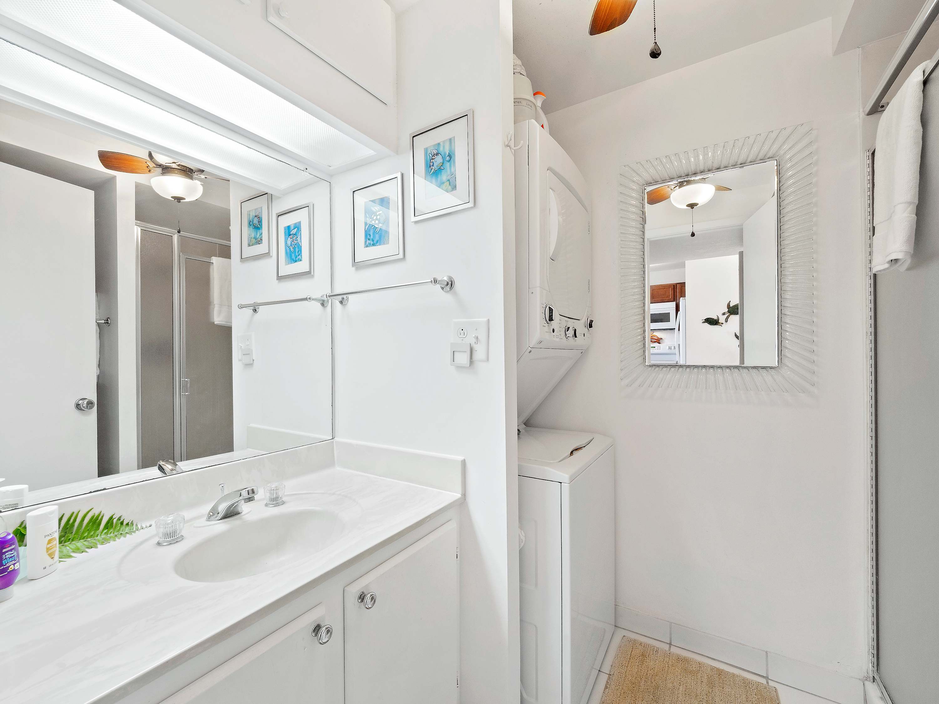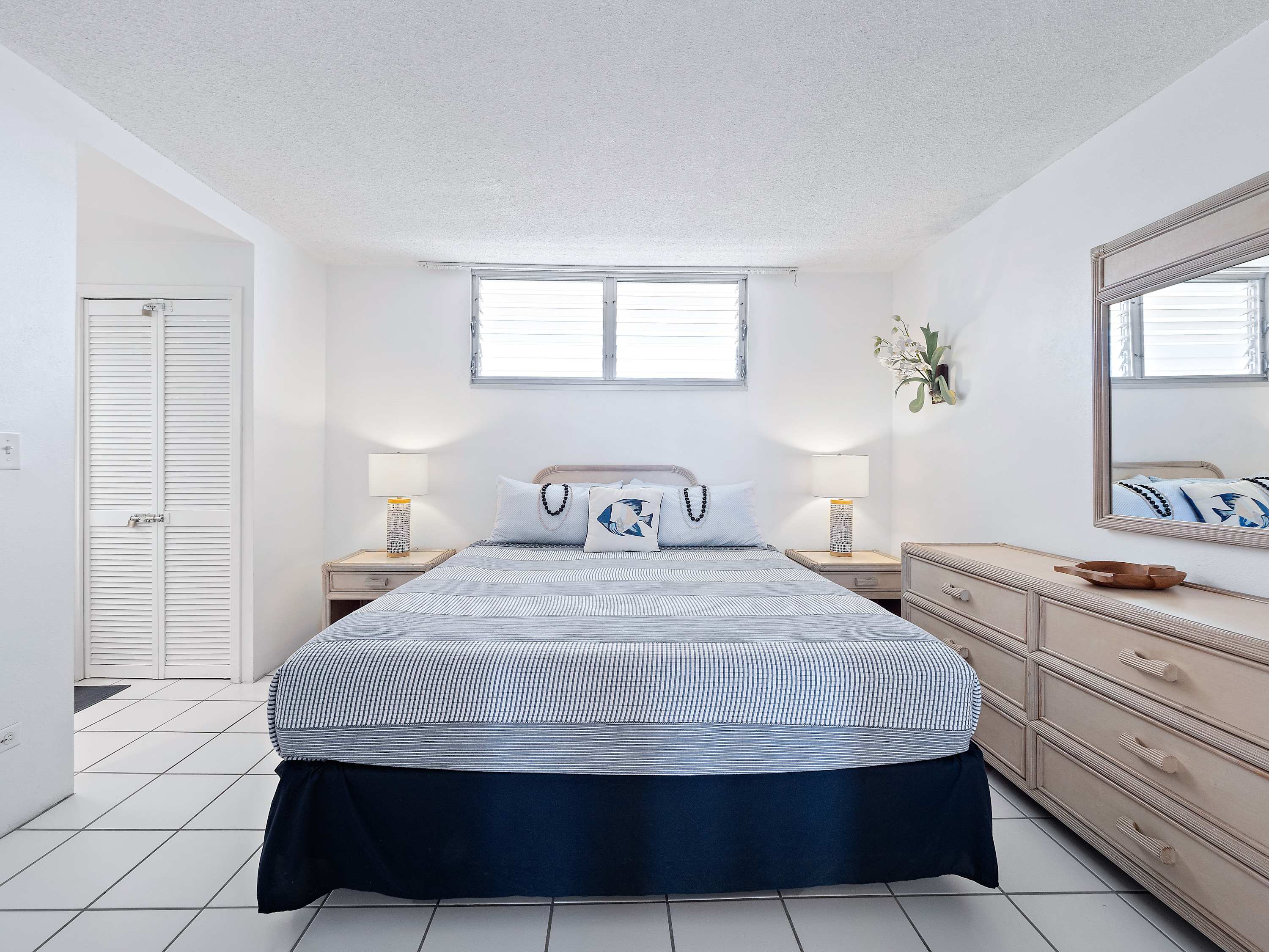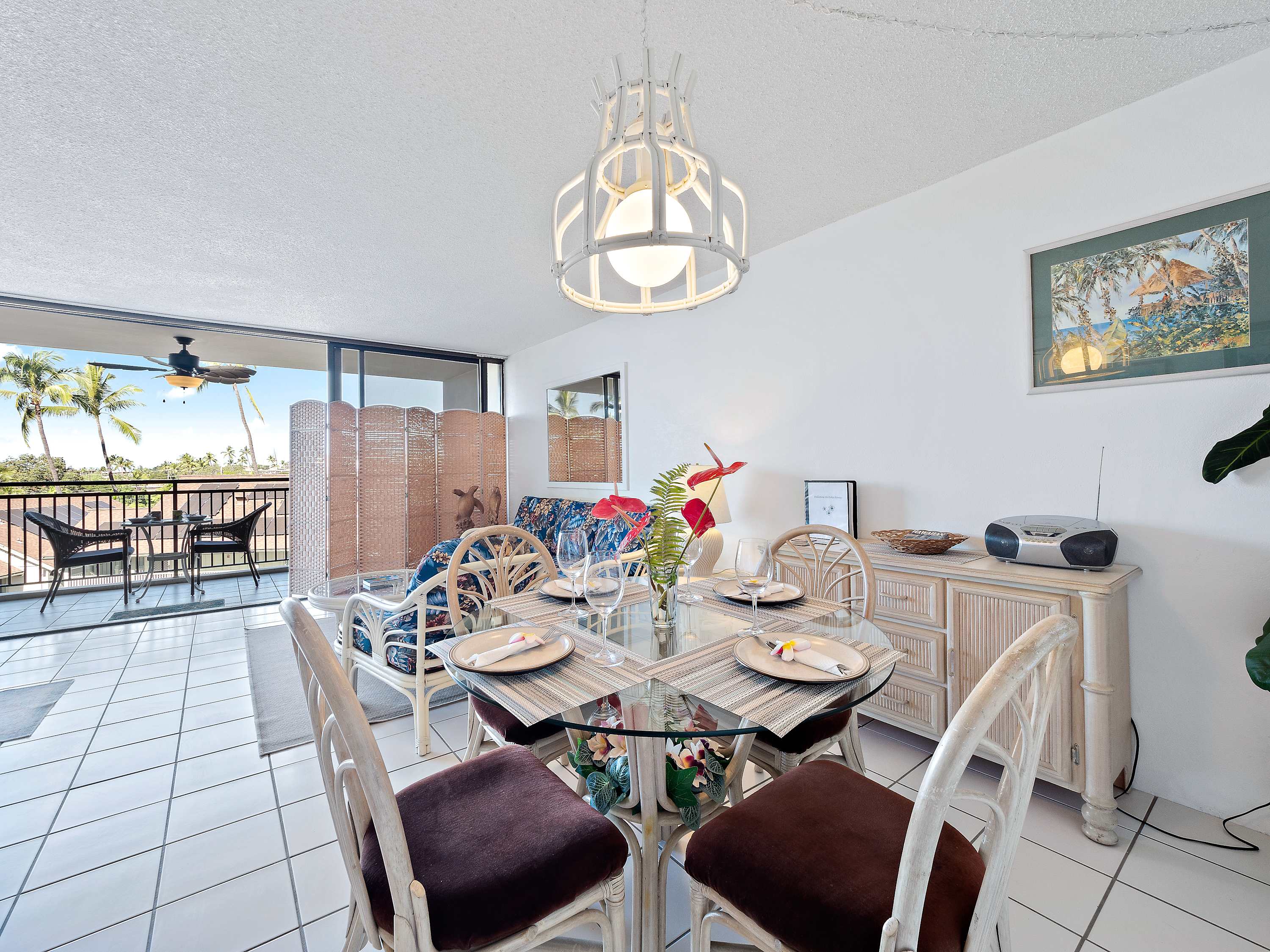 Indoors, you’ll find delight in the charming furnishings and décor properly representing the theme of the islands in open and airy spaces that promote connection and relaxation. Find relief from the heat on sofa and armchair seating in the living room as you catch up on episodes of your favorite shows on the smart TV. Merge indoor and outdoor living together by opening the large sliding doors to the lanai and allowing the cool ocean breeze flow freely throughout the home. Dine together at the formal table with seating for 4 or snag a high-top stool at the counter for more casual bites or a quick breakfast on your way out the door to adventure. The well-equipped kitchen offers everything you need to whip up delicious meals right from home, with ample counterspace and cabinetry for meal preparation and storage.