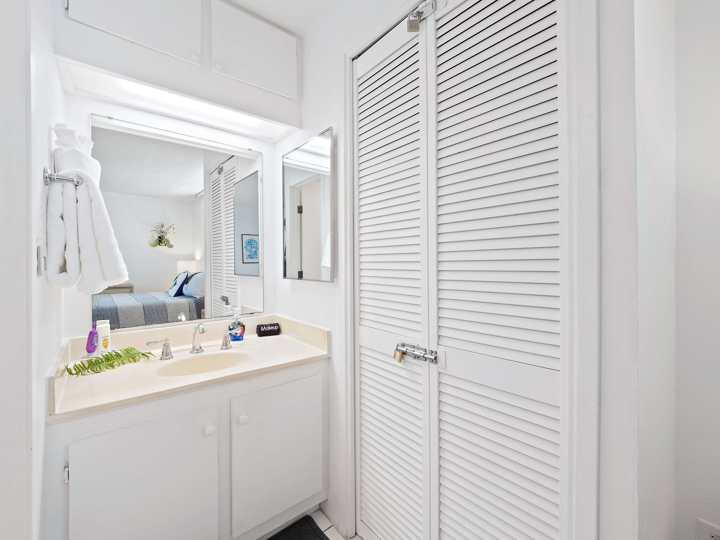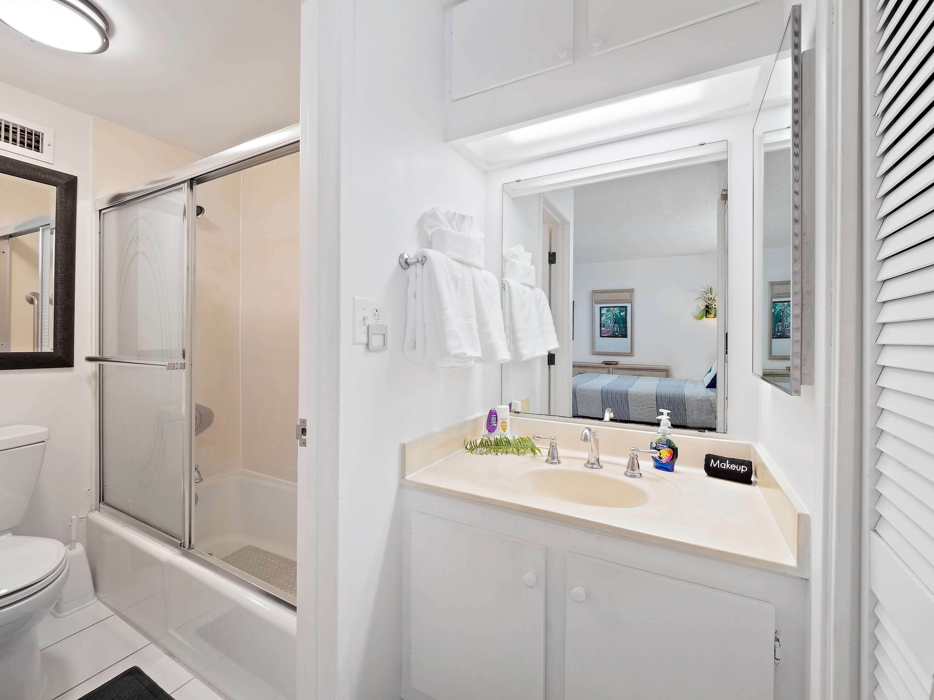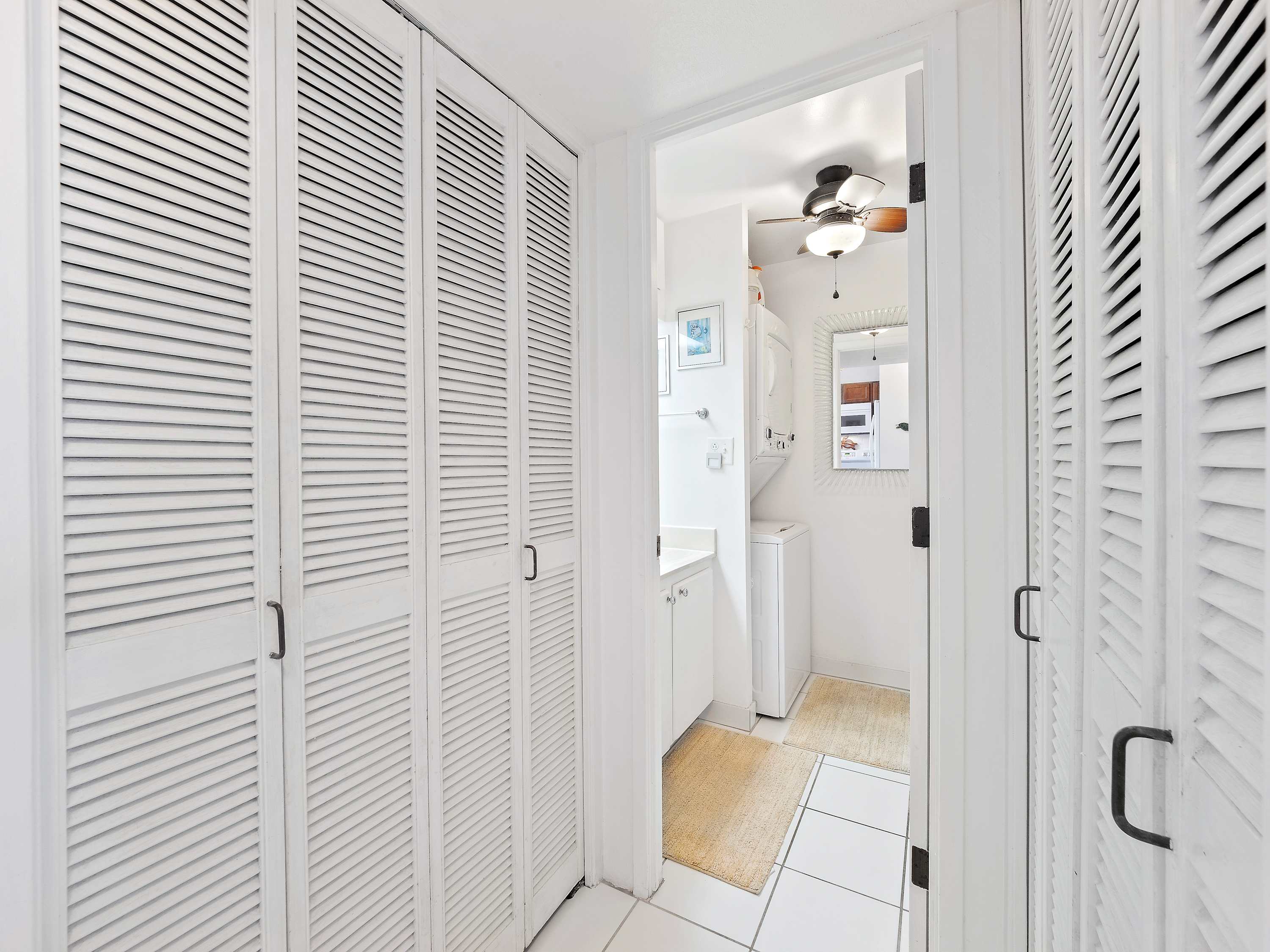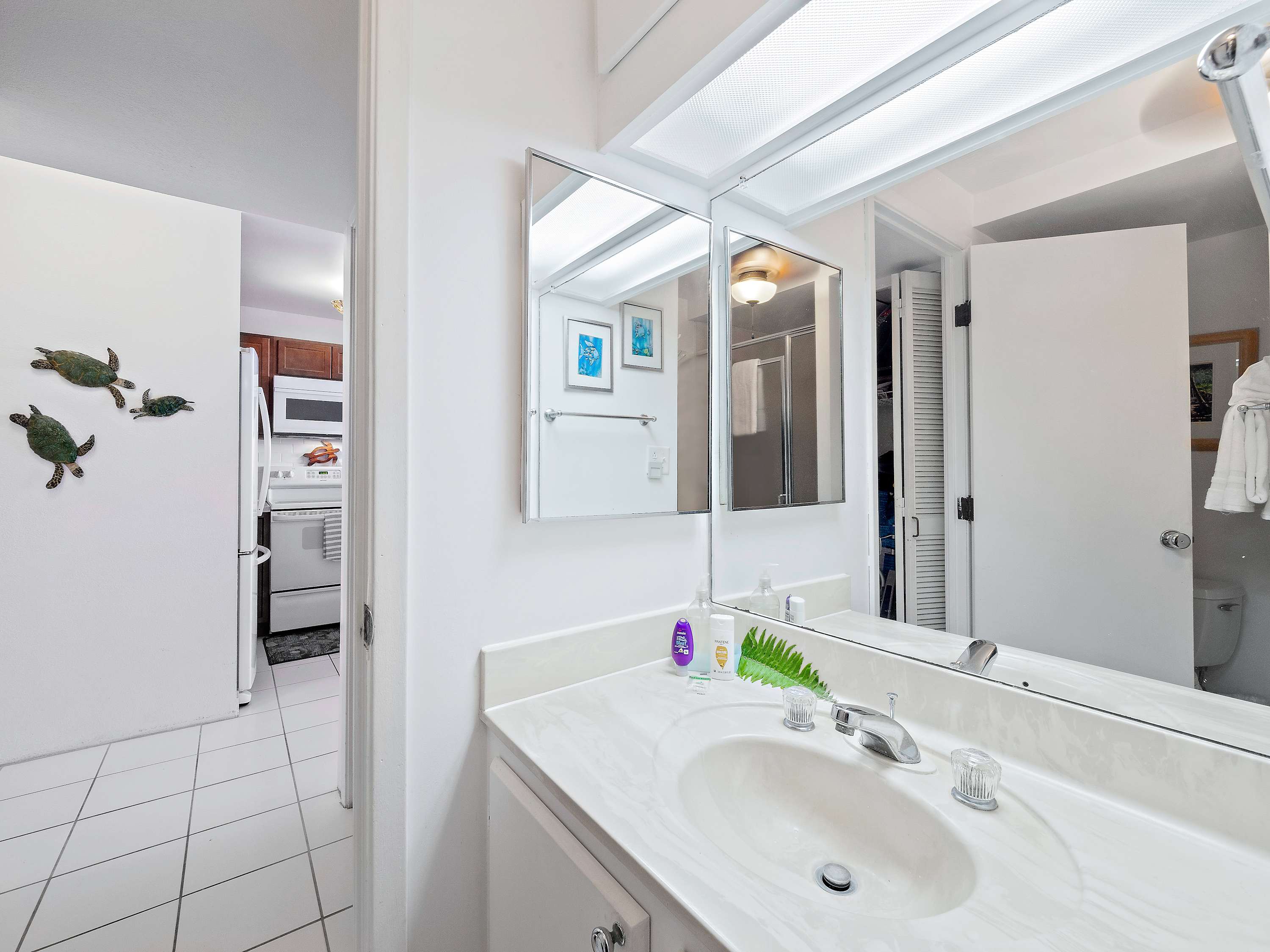 Indoors, you’ll find delight in the charming furnishings and décor properly representing the theme of the islands in open and airy spaces that promote connection and relaxation. Find relief from the heat on sofa and armchair seating in the living room as you catch up on episodes of your favorite shows on the smart TV. Merge indoor and outdoor living together by opening the large sliding doors to the lanai and allowing the cool ocean breeze flow freely throughout the home. Dine together at the formal table with seating for 4 or snag a high-top stool at the counter for more casual bites or a quick breakfast on your way out the door to adventure. The well-equipped kitchen offers everything you need to whip up delicious meals right from home, with ample counterspace and cabinetry for meal preparation and storage.