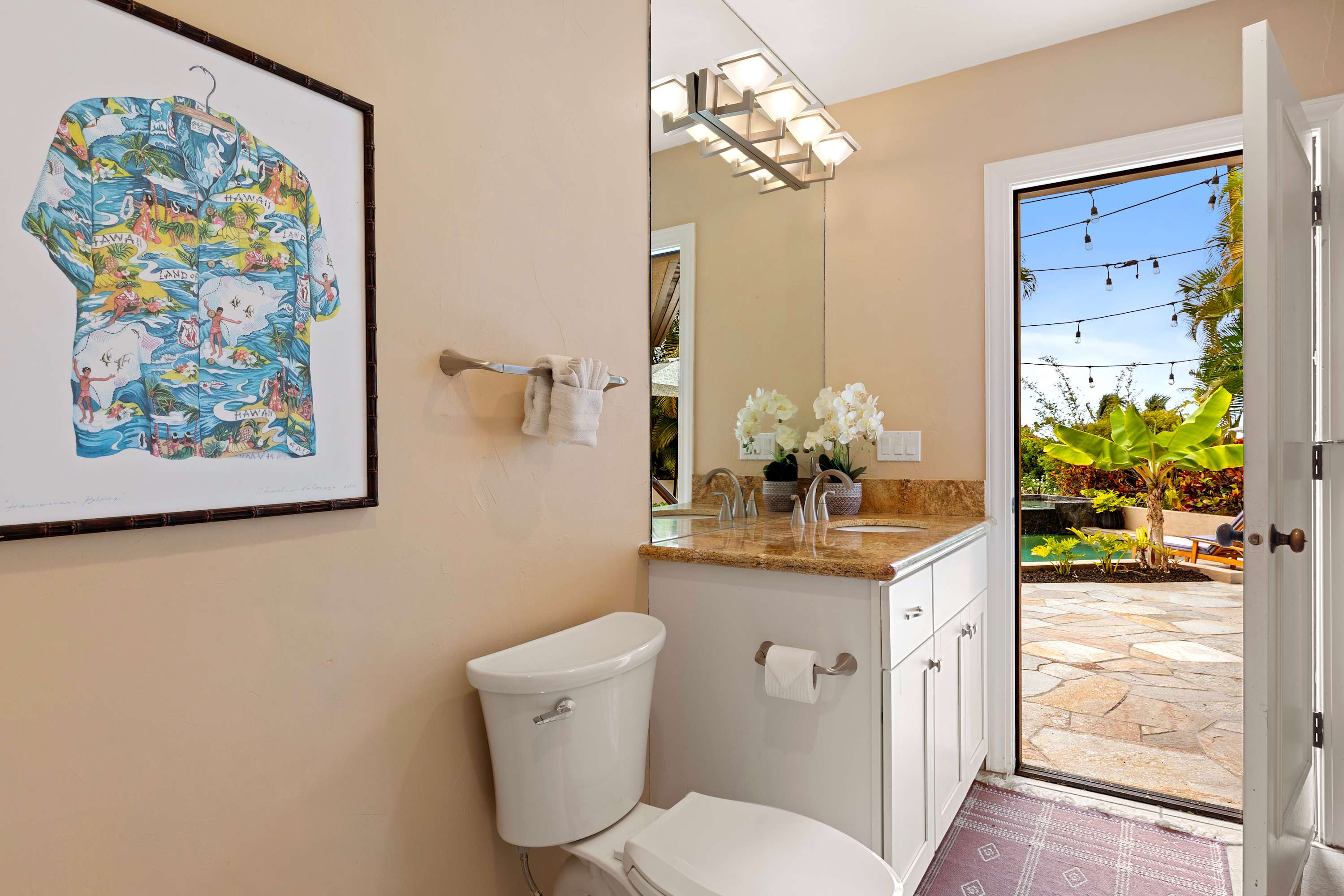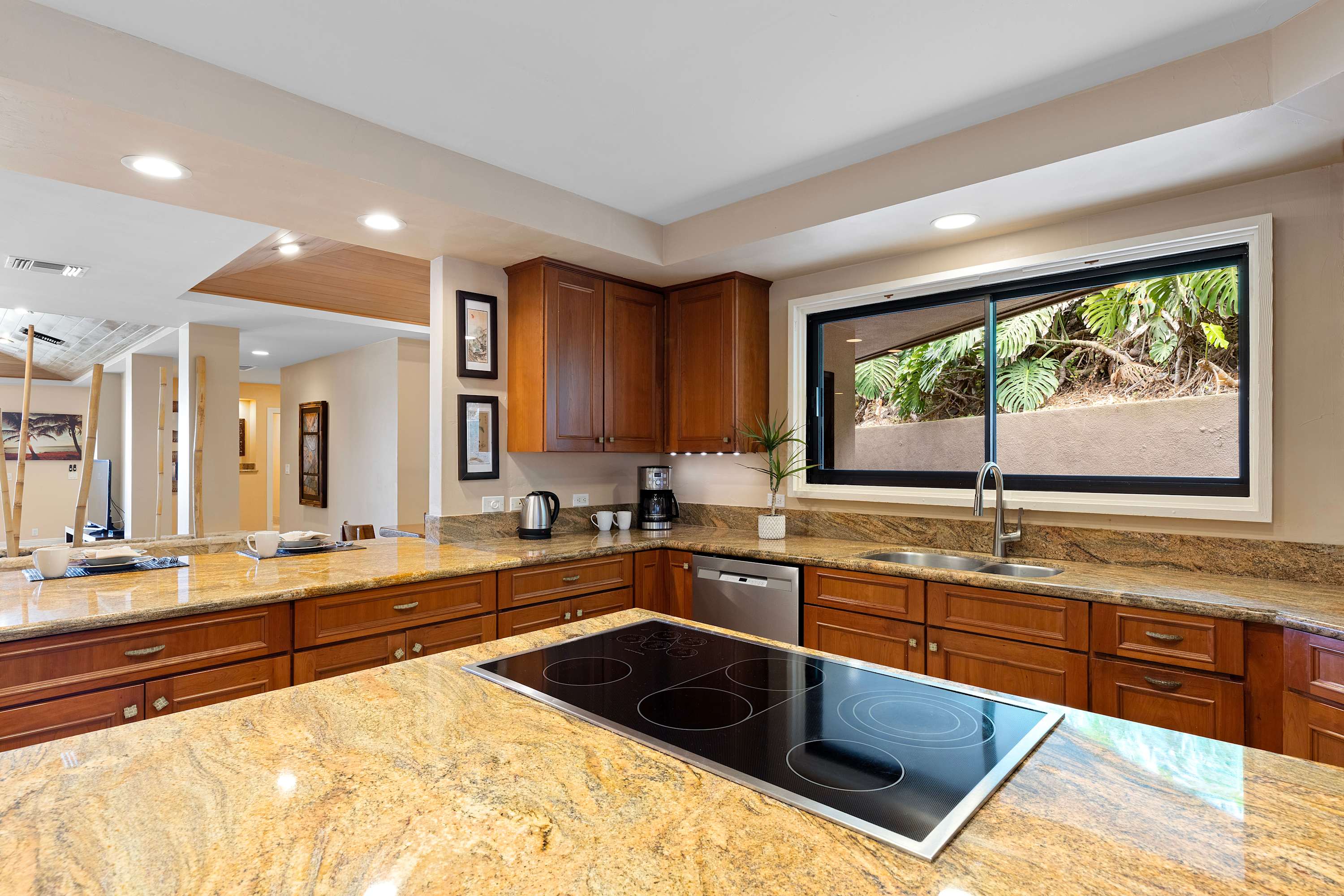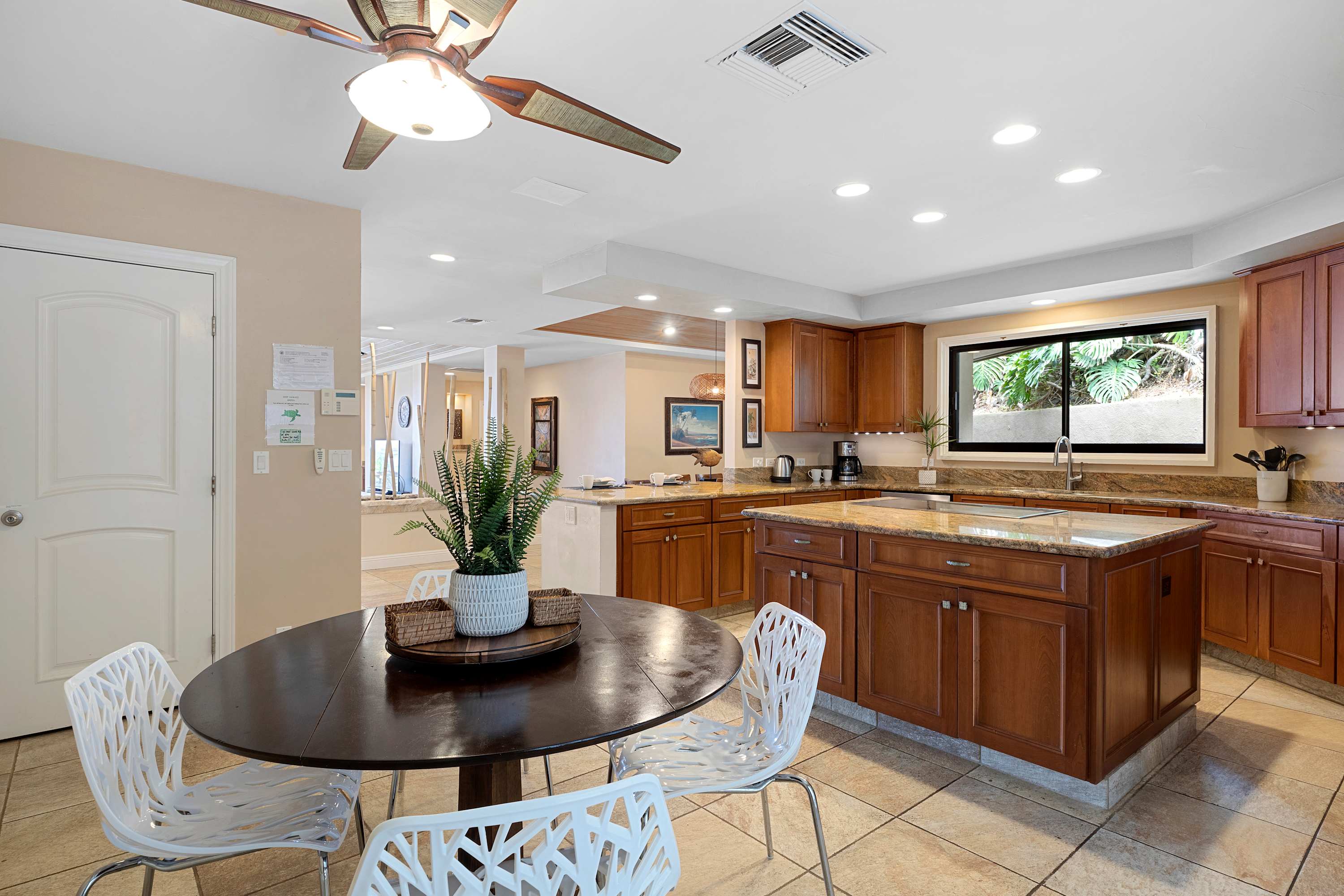 Inside the home, you'll find plenty of spaces to unwind. The open floorplan seamlessly combines the indoor/outdoor living that Hawaii is known for . Just off the lanai is the home’s great room, inclusive of plush sofa seating, should you find yourself with some downtime in the evenings after exploring the local area. A modern, spacious kitchen with a separate dining area includes stainless steel appliances, coffee maker, toaster, and toaster oven – fully-equipped whether you choose to cook or enjoy a catered meal. An outside patio adjoining the kitchen area features a Weber gas BBQ grill.