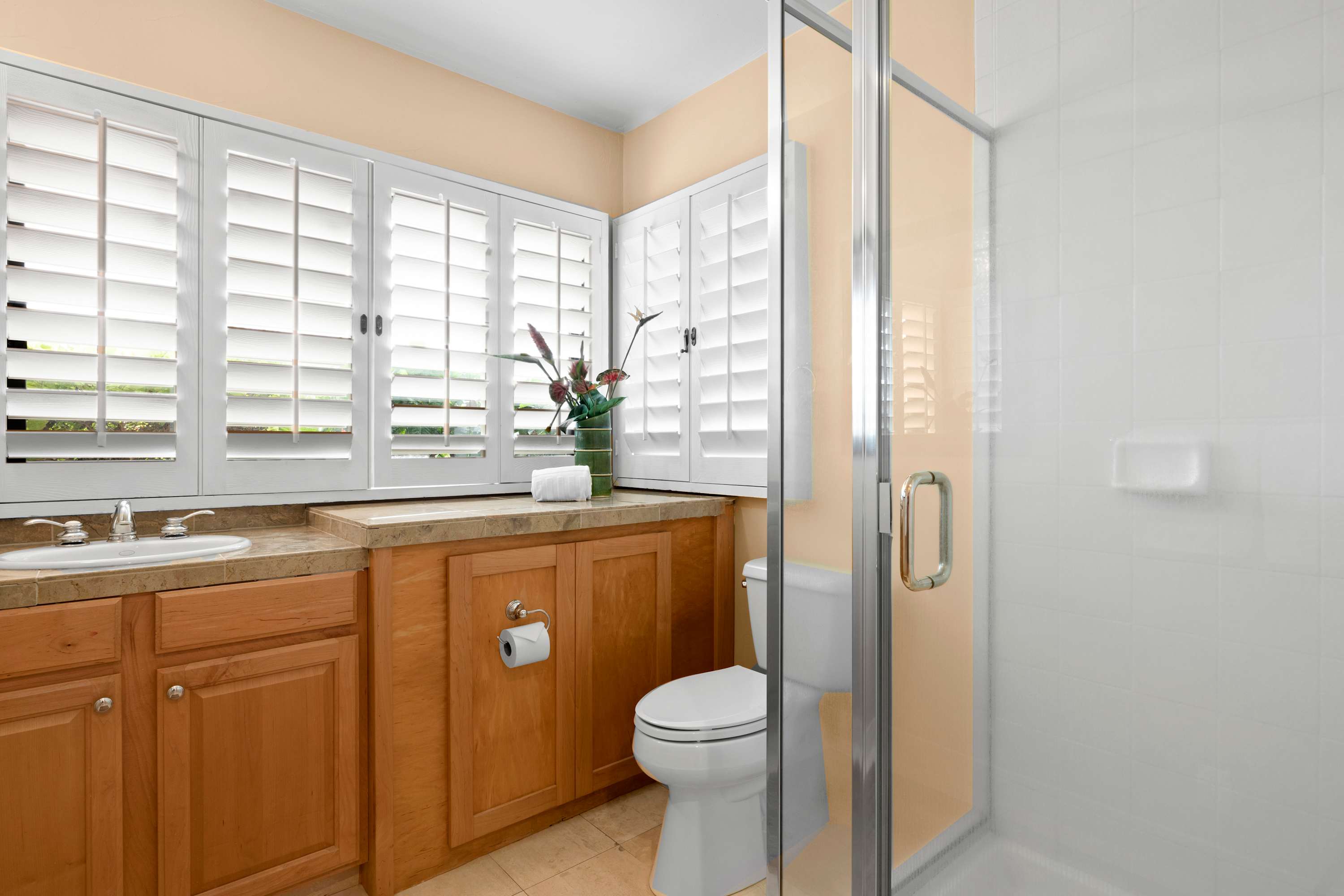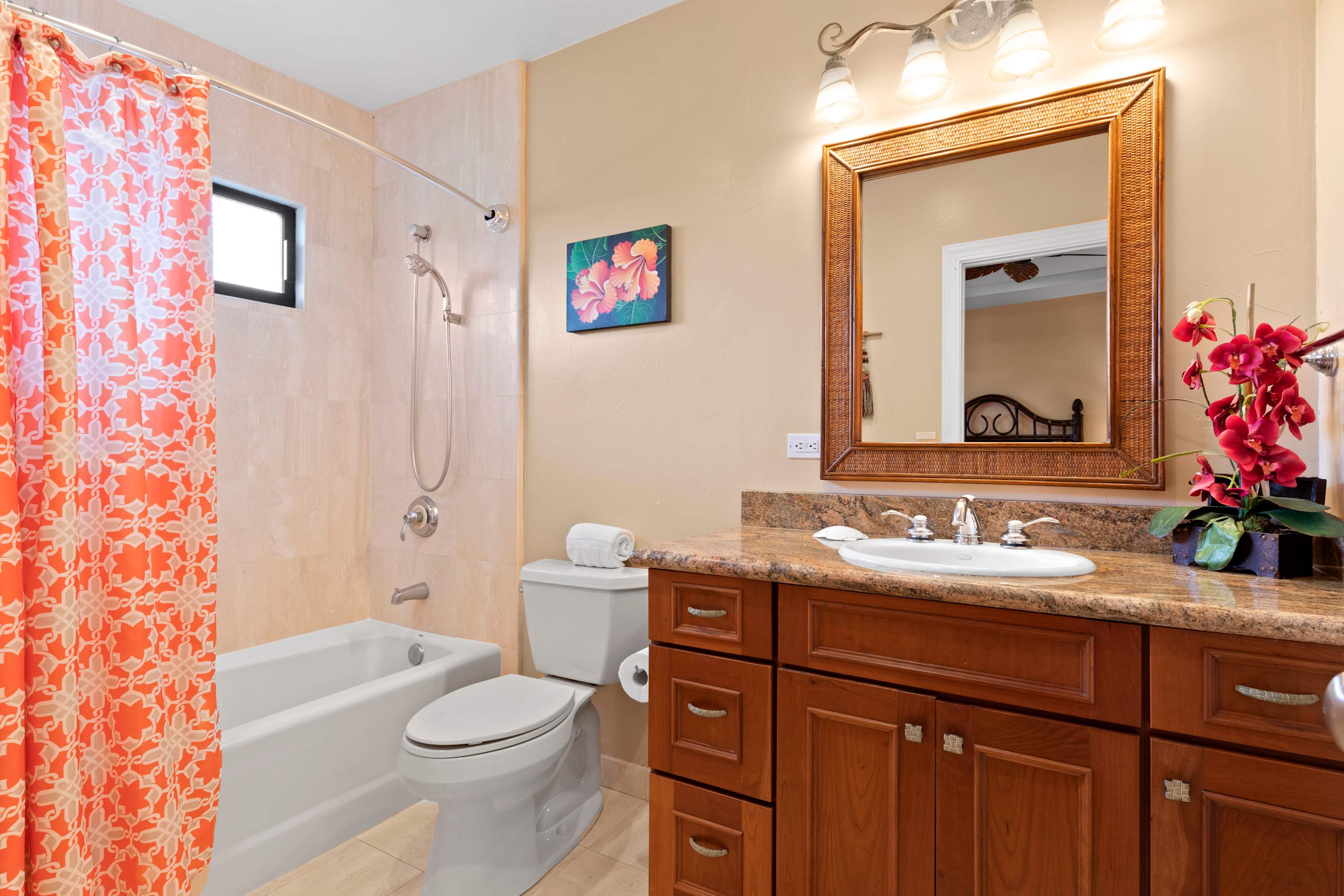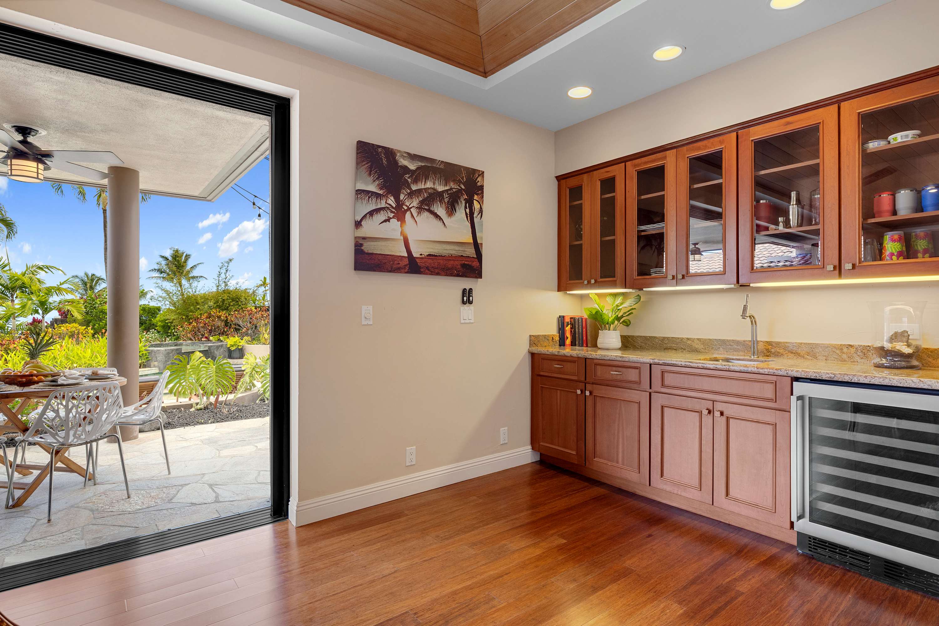 Inside the home, you'll find plenty of spaces to unwind. The open floorplan seamlessly combines the indoor/outdoor living that Hawaii is known for . Just off the lanai is the home’s great room, inclusive of plush sofa seating, should you find yourself with some downtime in the evenings after exploring the local area. A modern, spacious kitchen with a separate dining area includes stainless steel appliances, coffee maker, toaster, and toaster oven – fully-equipped whether you choose to cook or enjoy a catered meal. An outside patio adjoining the kitchen area features a Weber gas BBQ grill.