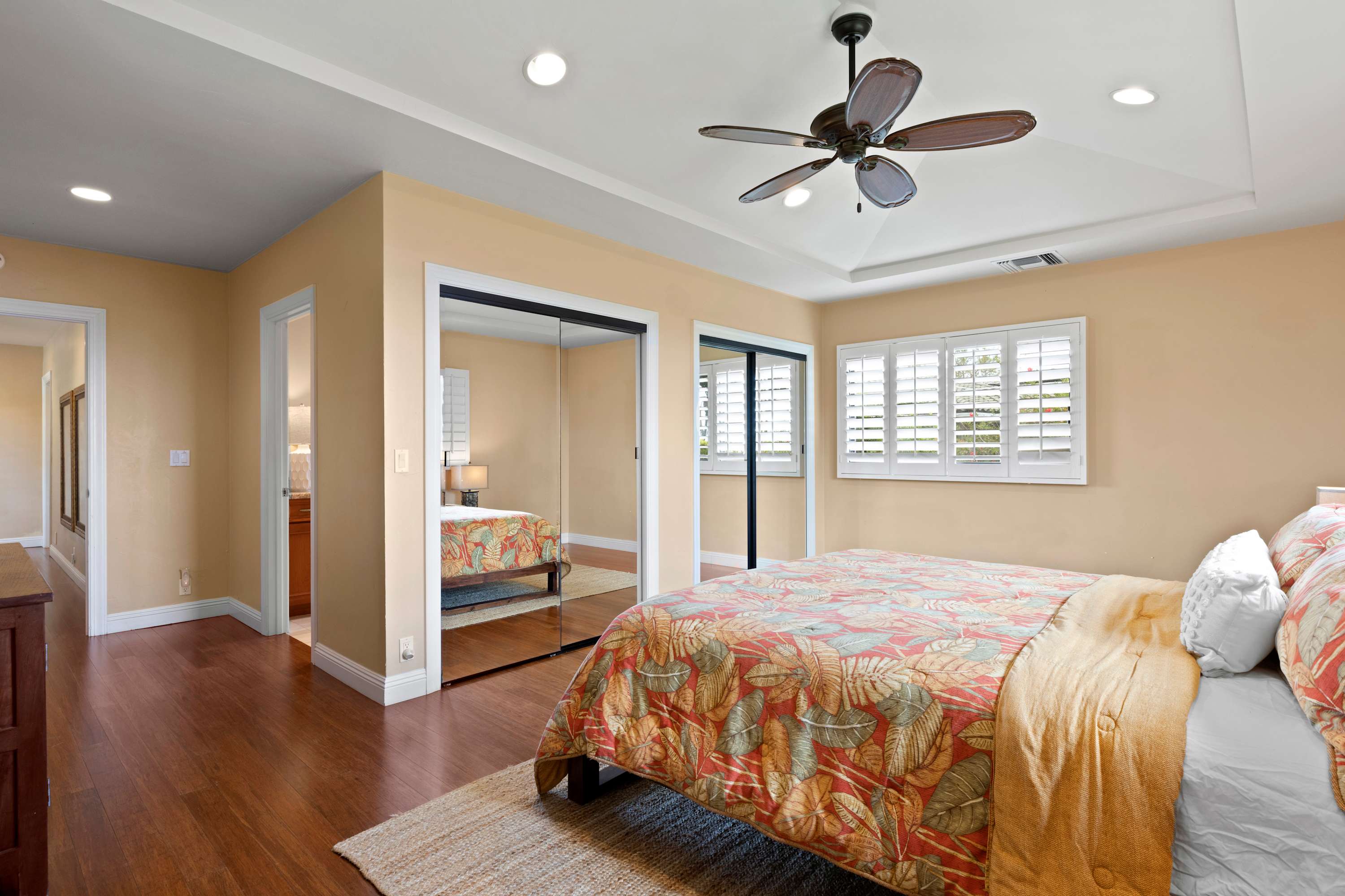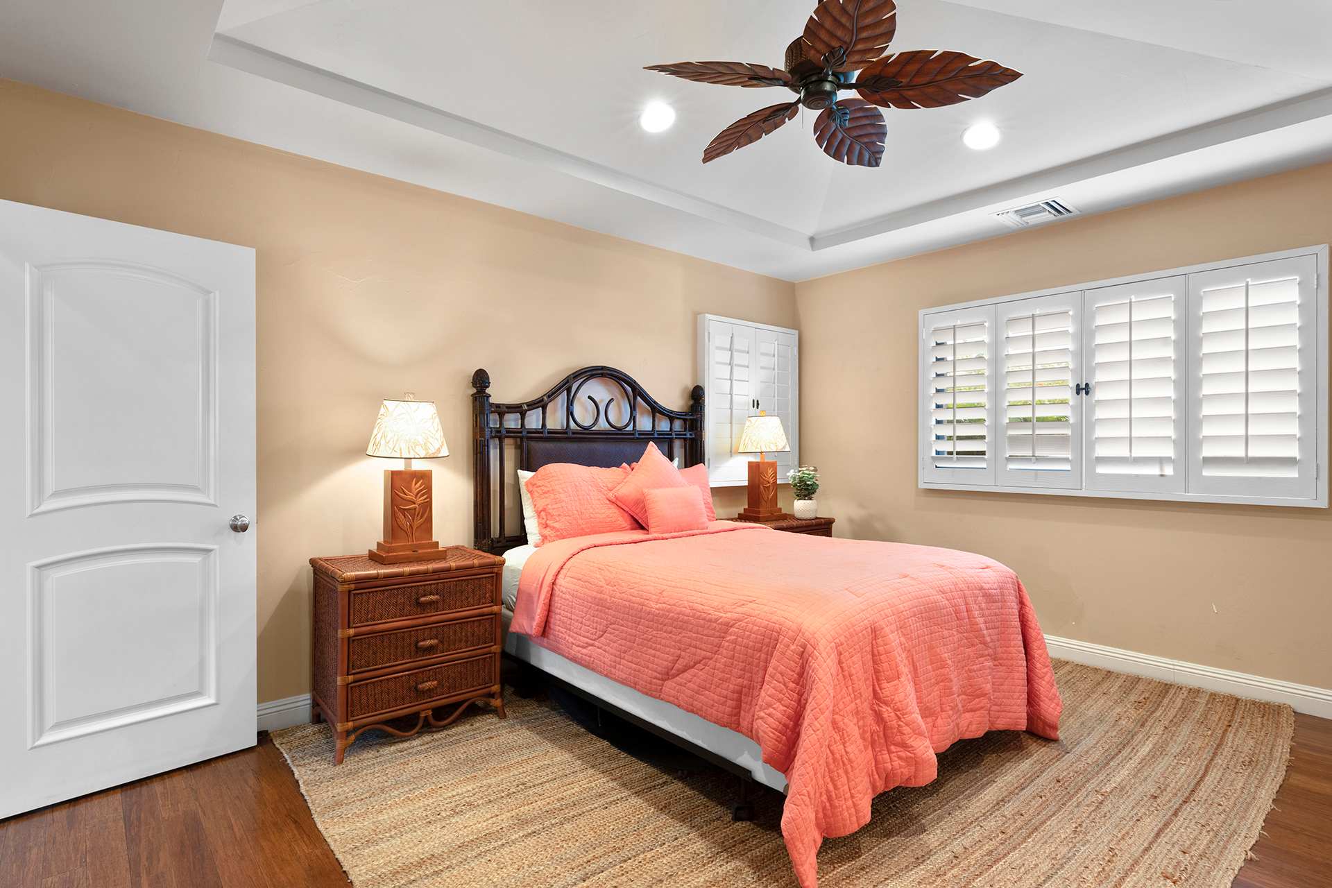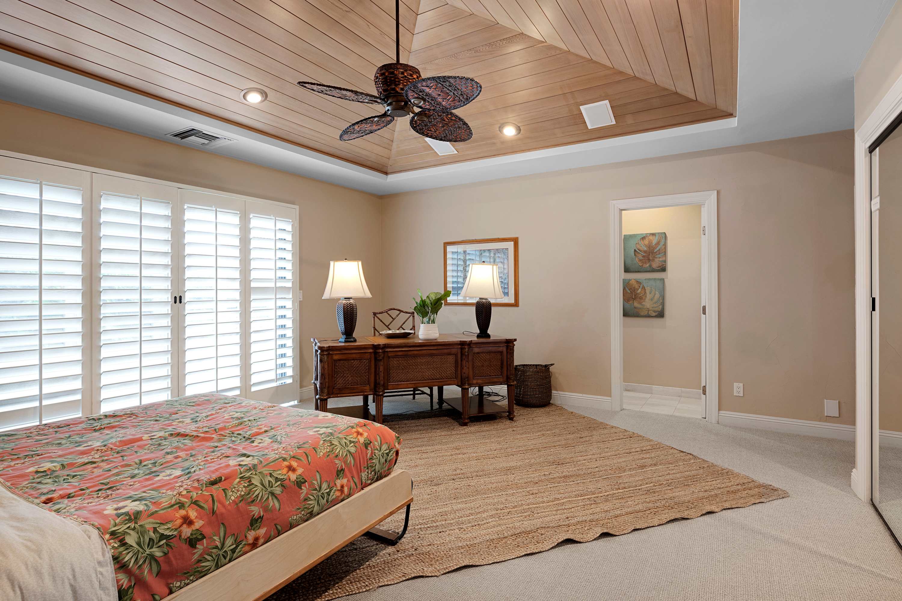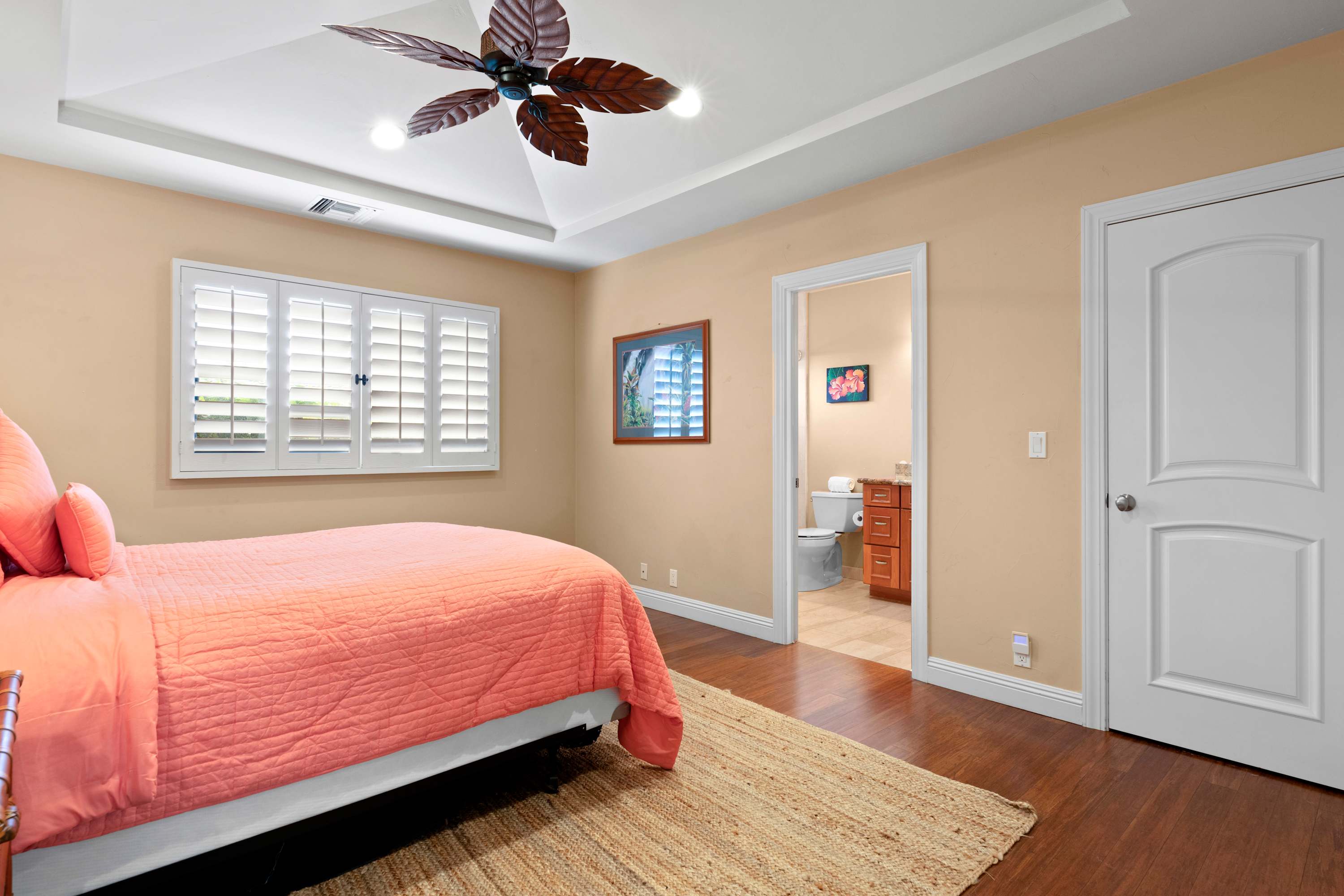Bedroom #3 (Coral Room) includes a queen size bed and ensuite bathroom with vanity and shower/tub combo, and a walk-in closet.