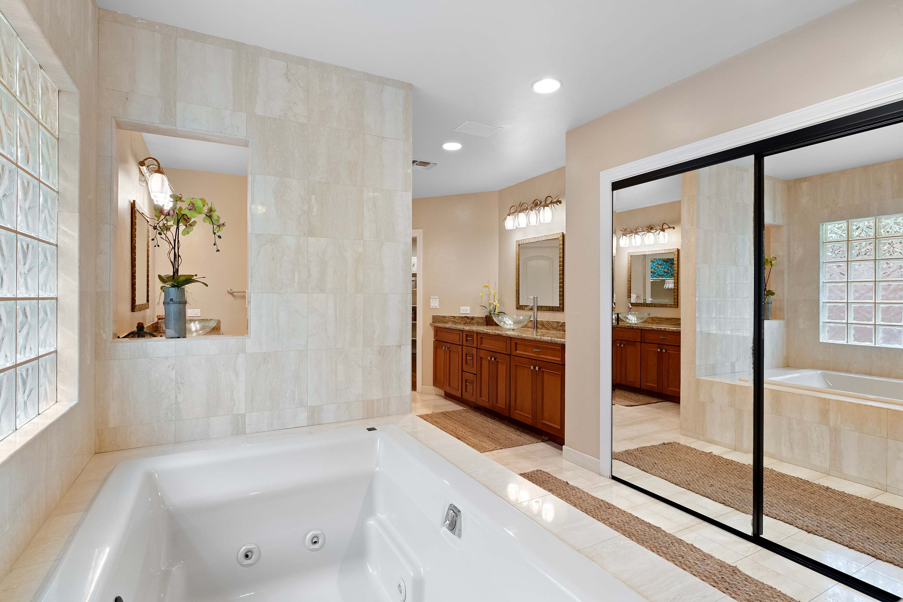 - Additional half bathroom is accessible from the pool area.