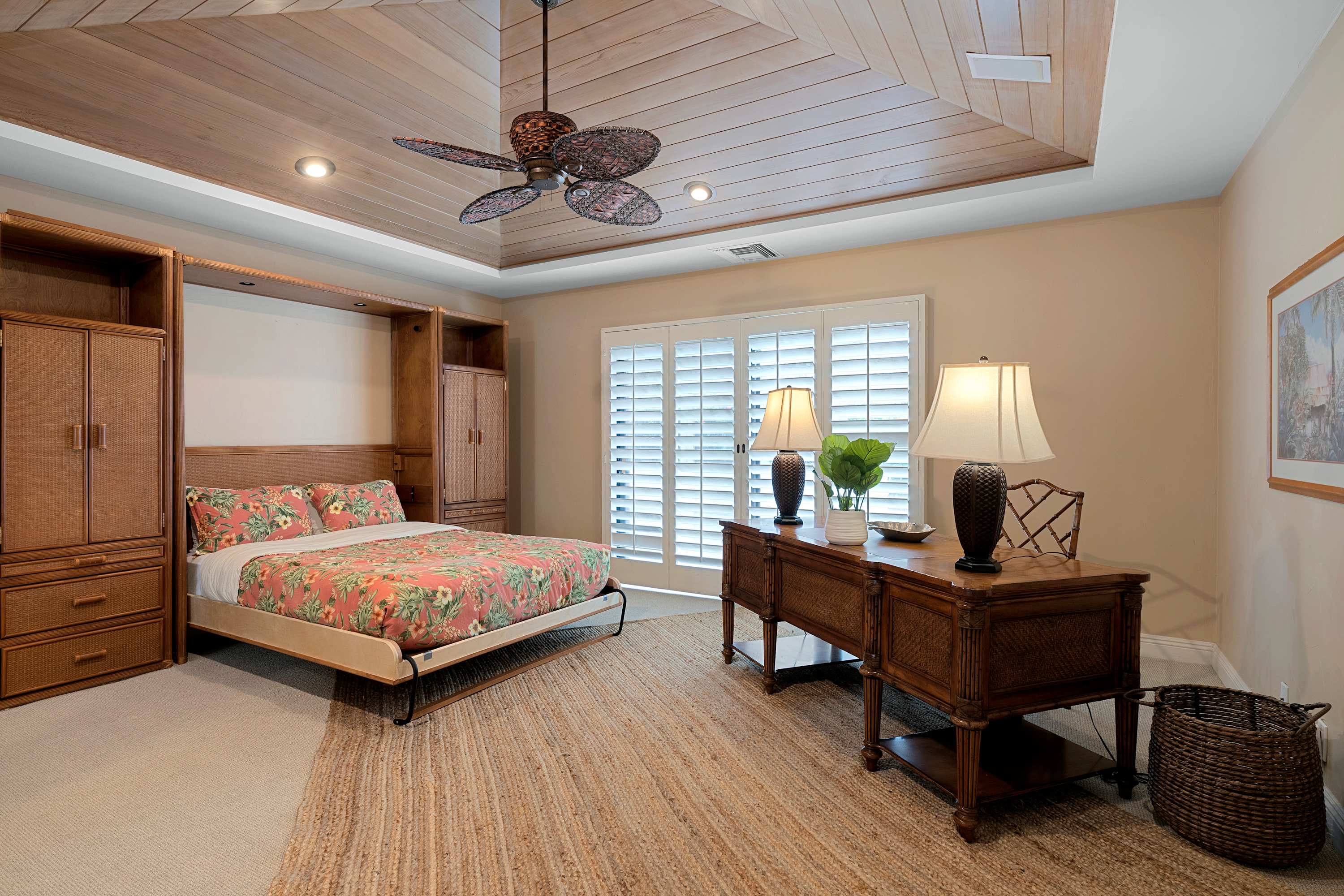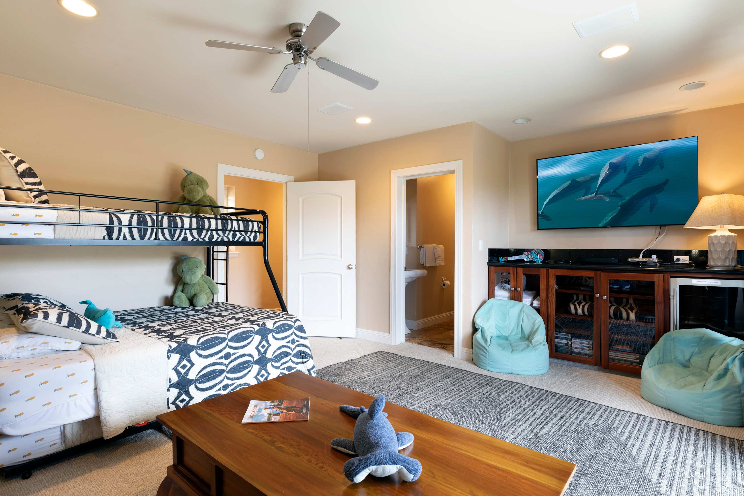 Bedroom #4 (Kids’ Room) includes 2 beds in bunk format (twin above and queen below, and an optional twin trundle bed, and ensuite bathroom with vanity and walk-in shower. Sliding doors open onto a patio.
